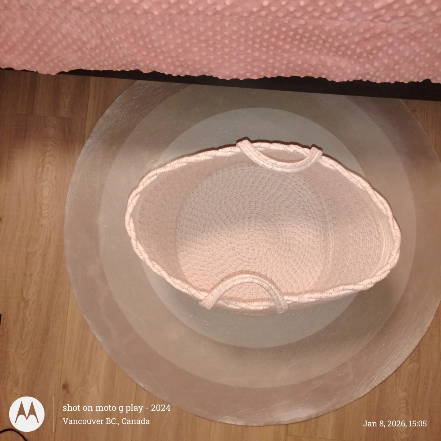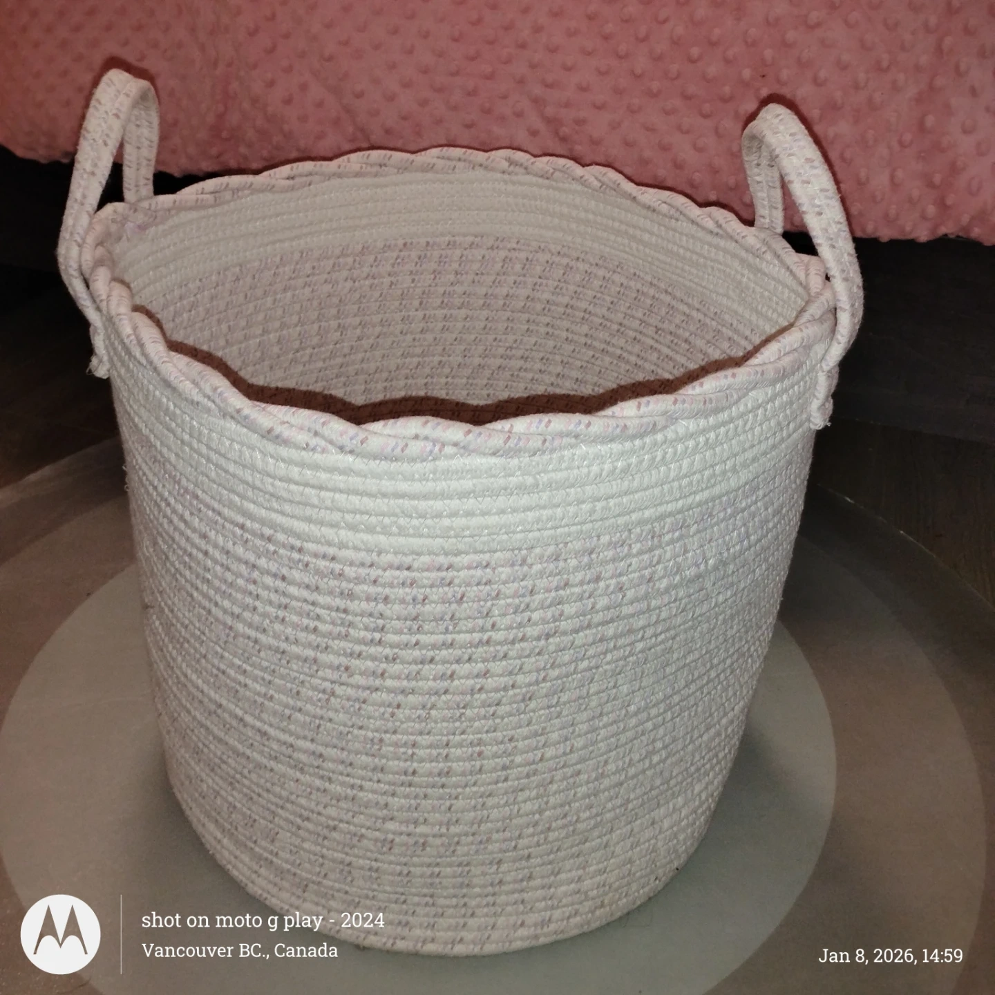A refined and timeless addition to a space that values craftsmanship, quiet elegance, and authentic European textile artistry. lovely woven rope basket! It's perfect for storage or decor. It has two sturdy handles for easy carrying. The basket features a nice woven pattern with subtle pink.