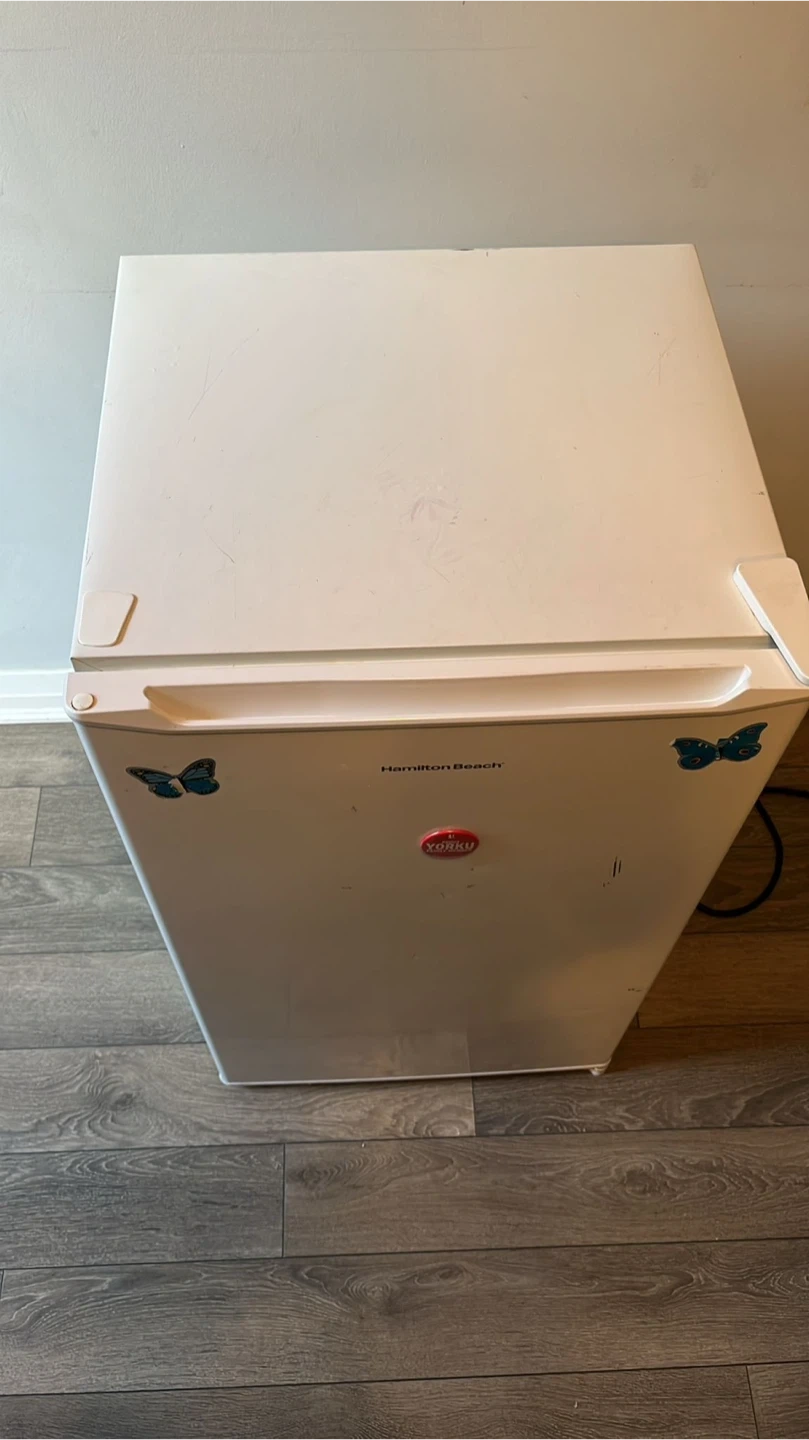 Selling a Hamilton Beach mini fridge! It's white and compact, perfect for a small space.