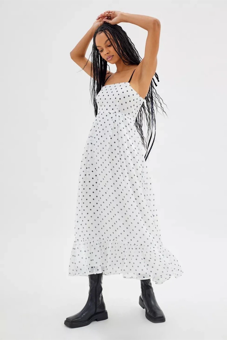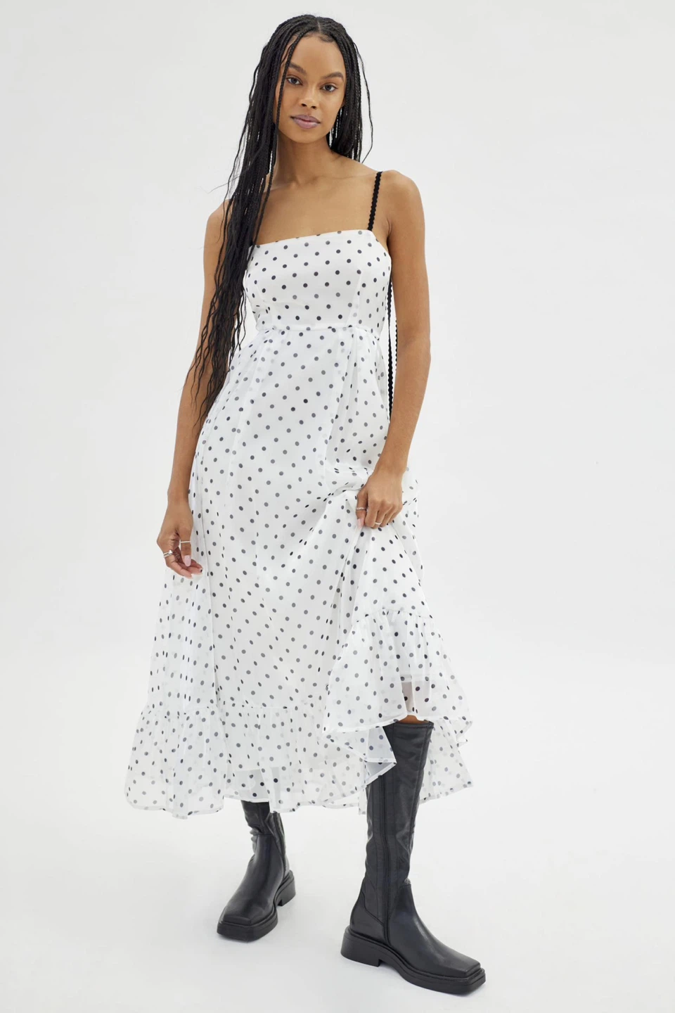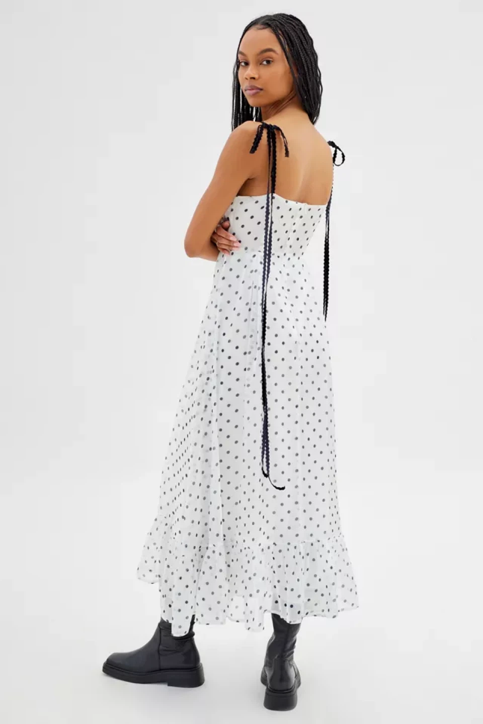 Midi dress from Sister Jane with a retro-feel from the organza in an allover polka dot print. Straight-across neckline with a cinched waist and a full midi skirt with ruffle detailing at the hem. Finished with velvety tied straps.