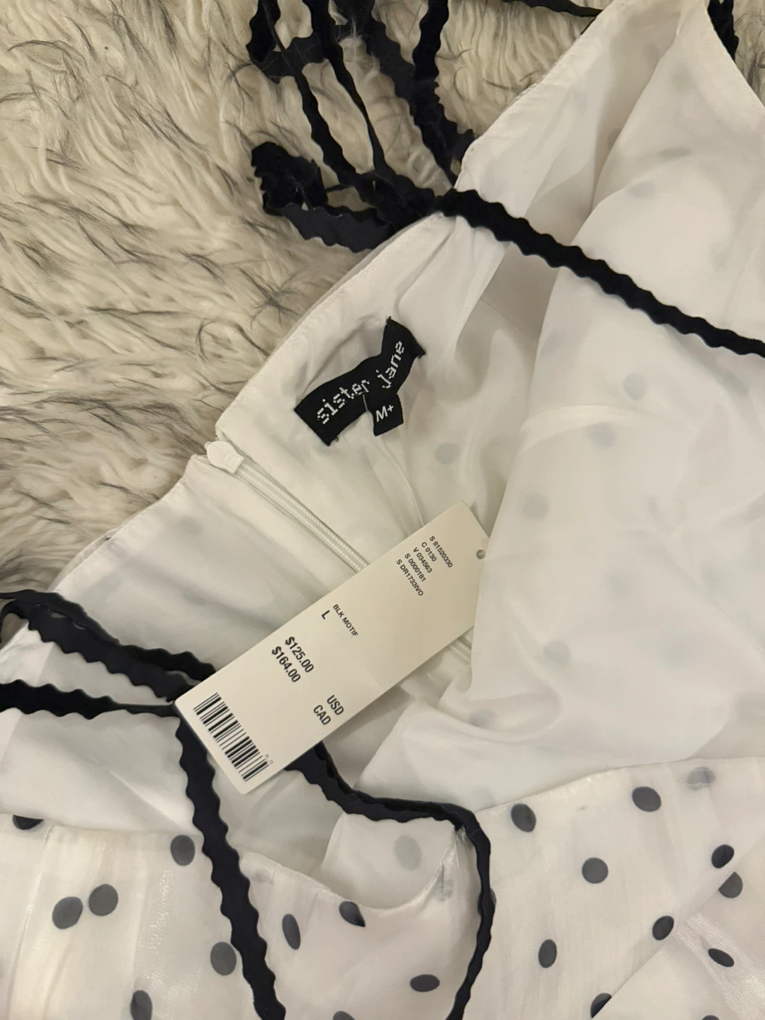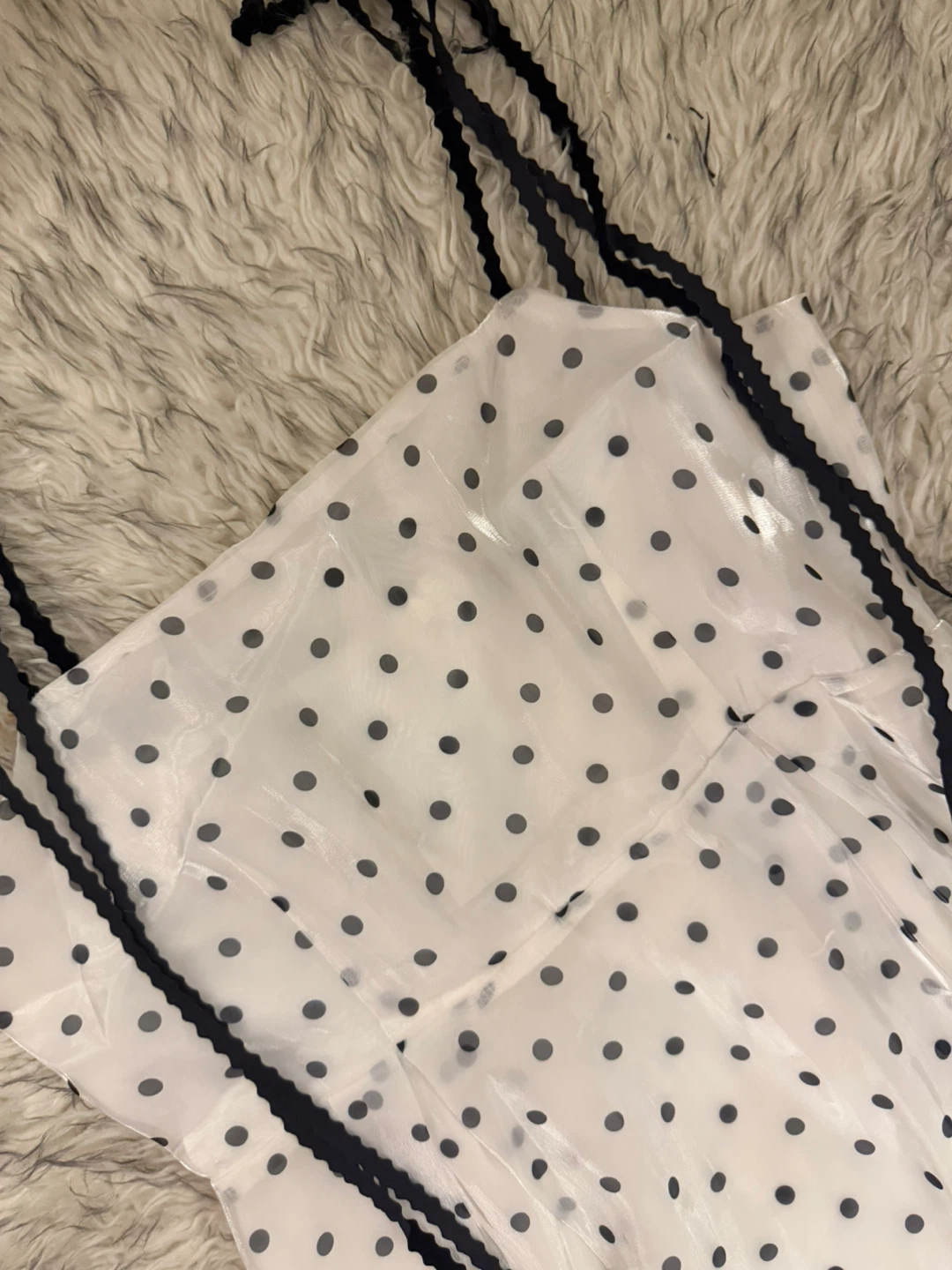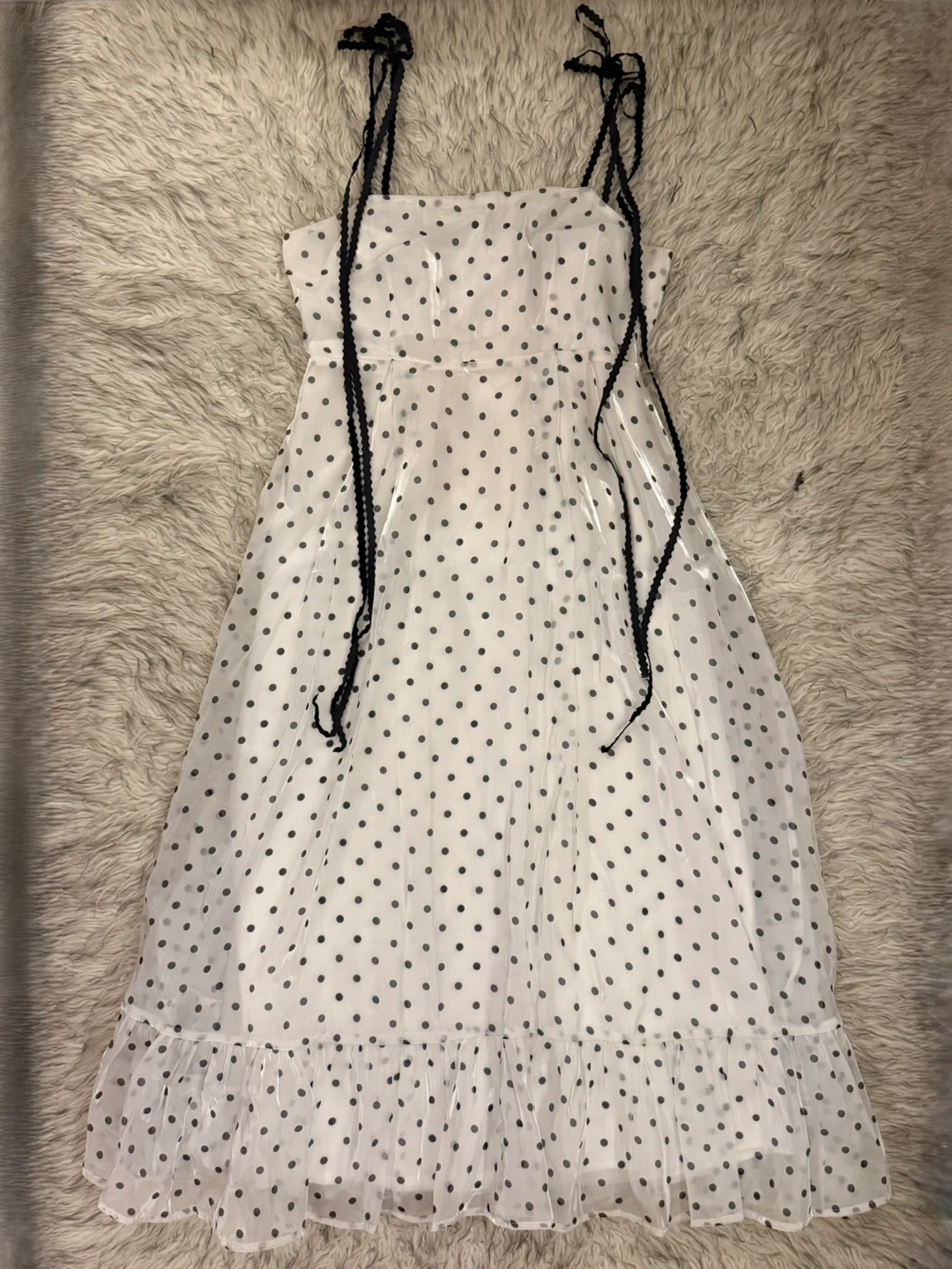 Midi dress from Sister Jane with a retro-feel from the organza in an allover polka dot print. Straight-across neckline with a cinched waist and a full midi skirt with ruffle detailing at the hem. Finished with velvety tied straps.