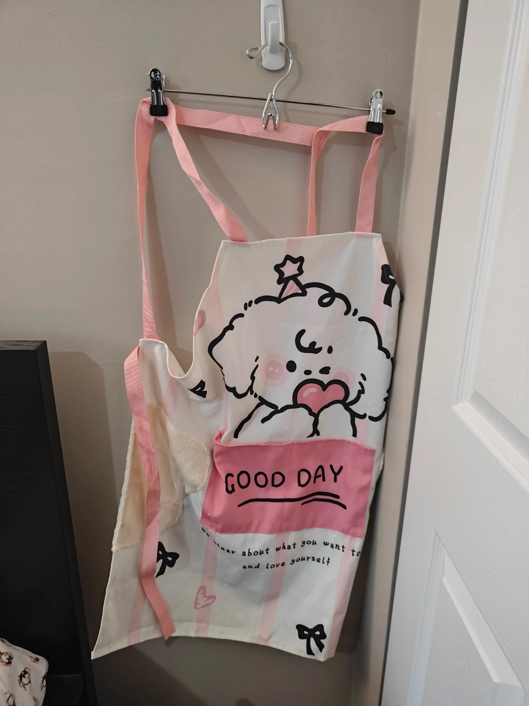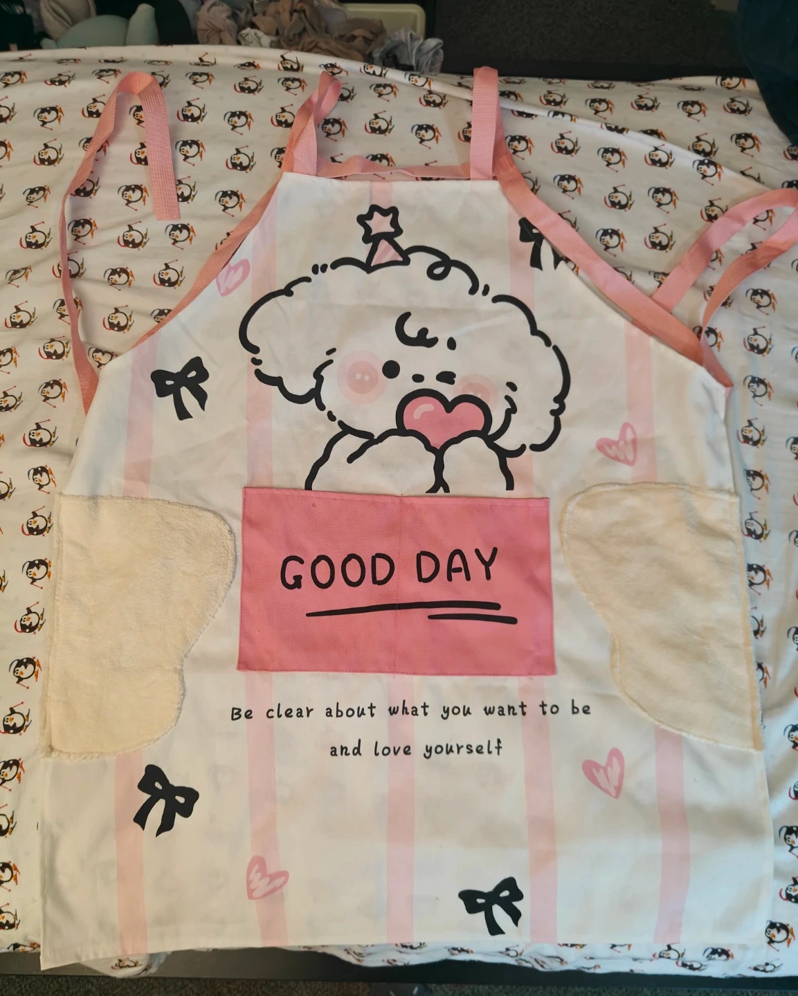Super cute apron with a 'Good Day' design! It's in great condition and ready to help you in the kitchen or with your crafts. The design features a sweet cartoon dog and hearts, perfect for adding a touch of fun to your day!
