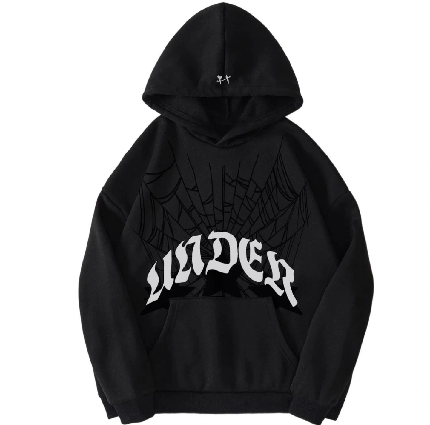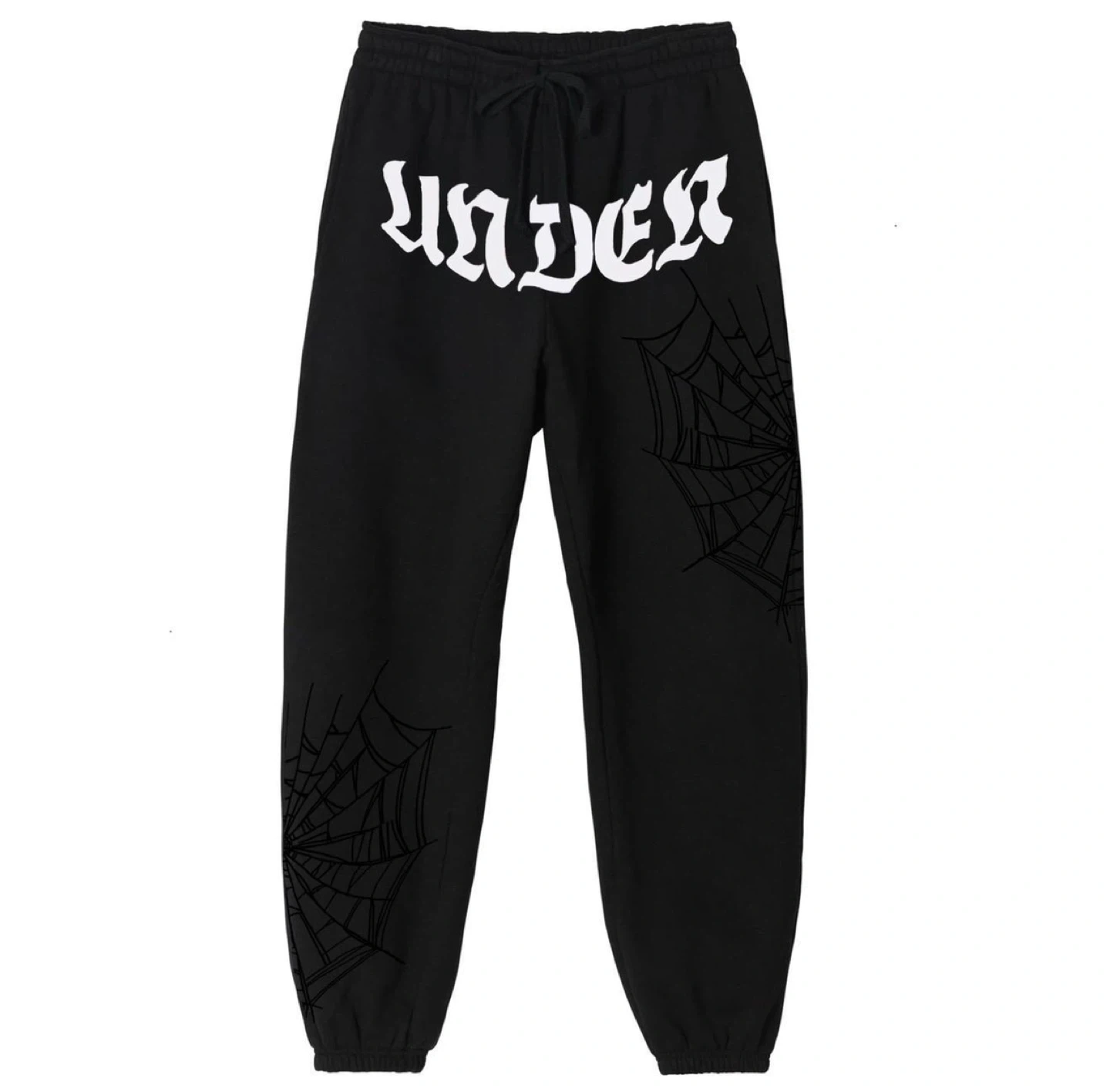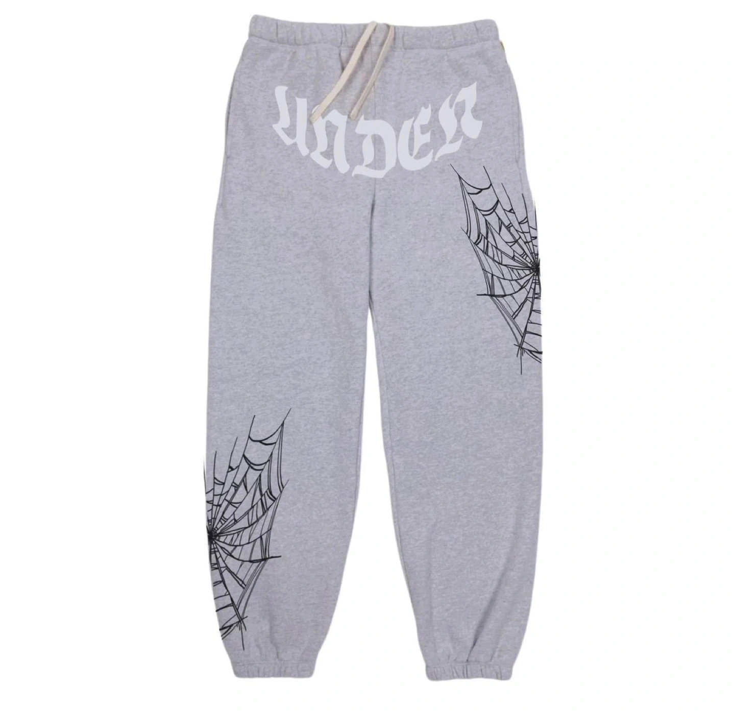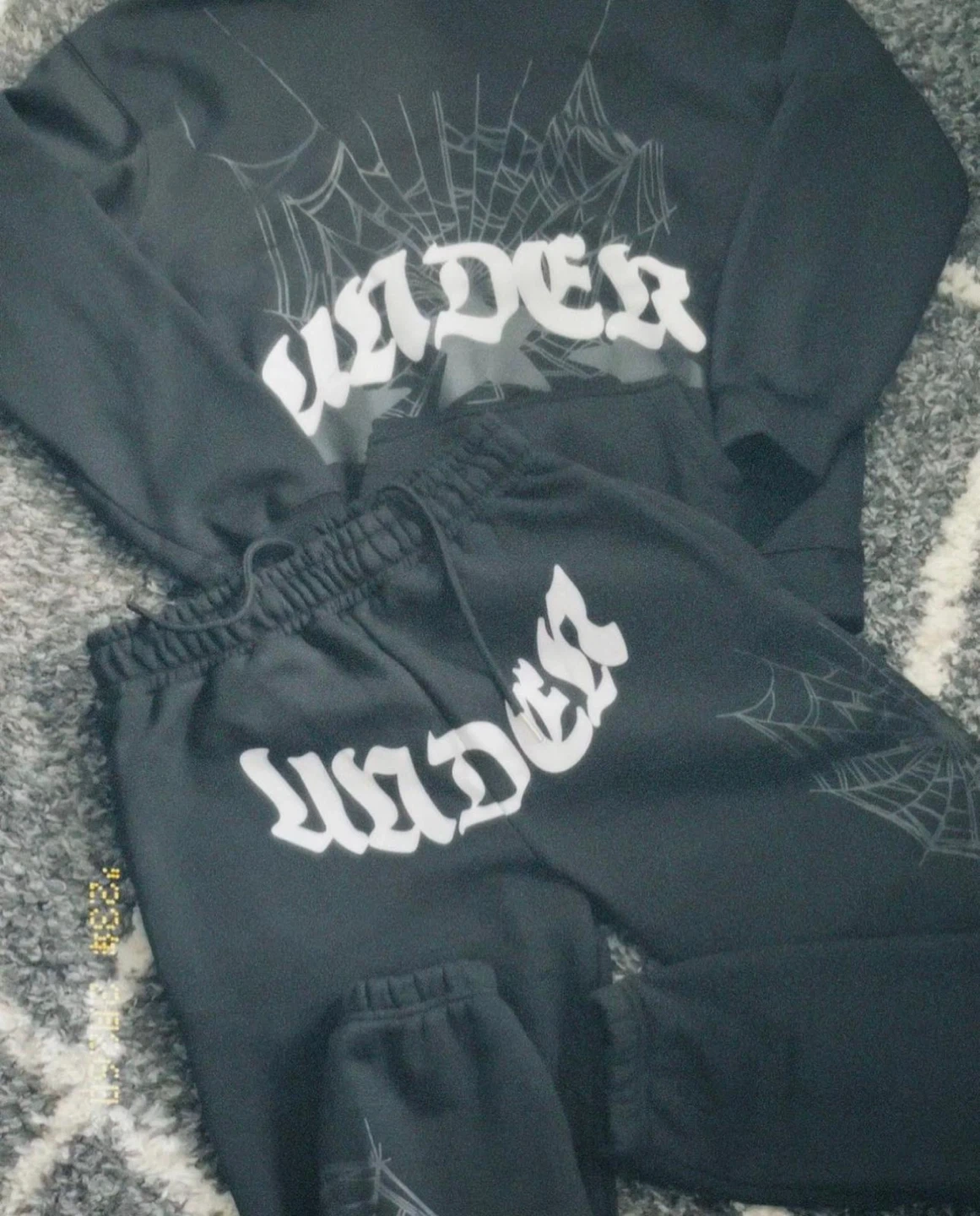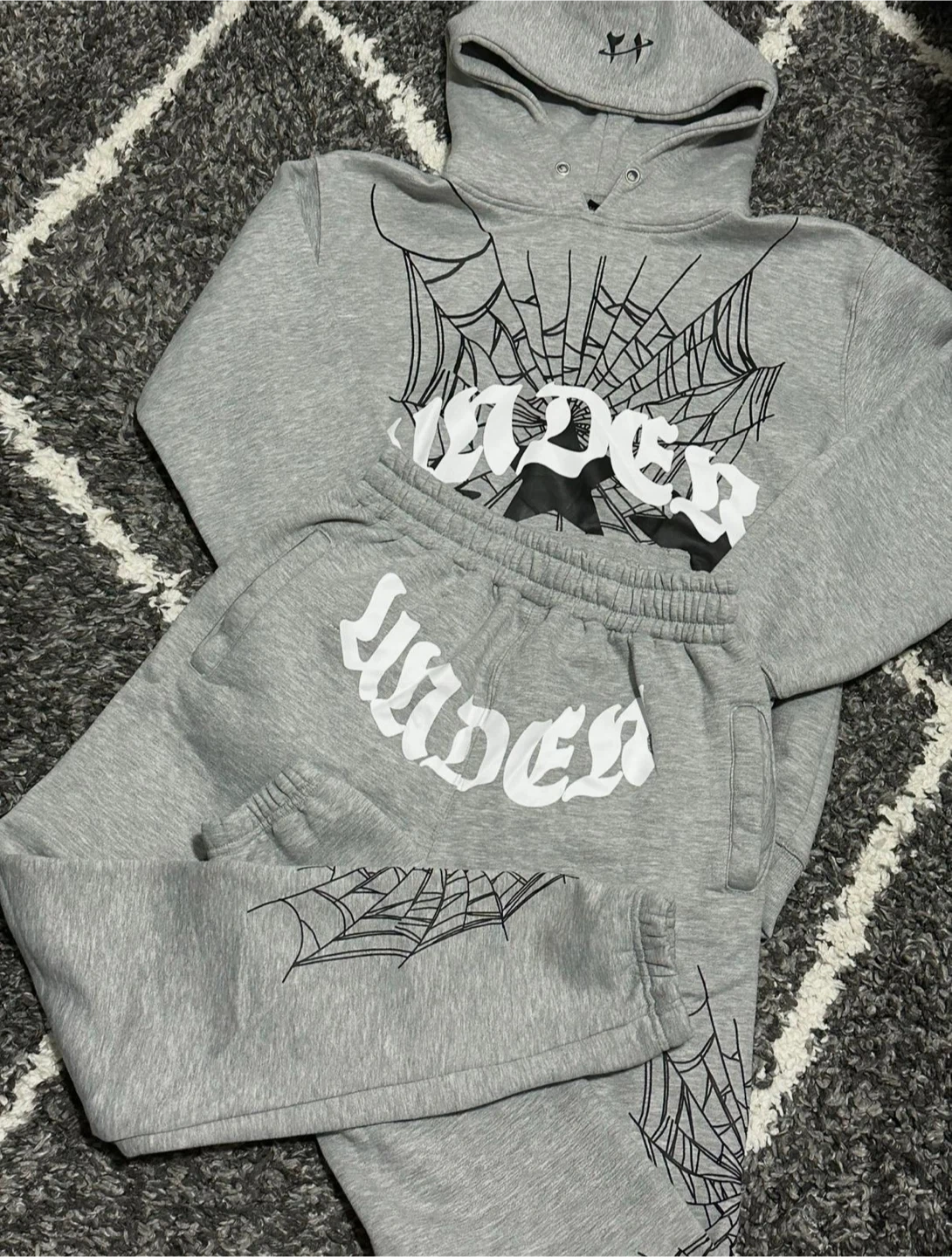 Selling a grey hoodie and sweatpants set with a spiderweb design and the word 'Under' printed on it. It's a stylish and comfortable set!