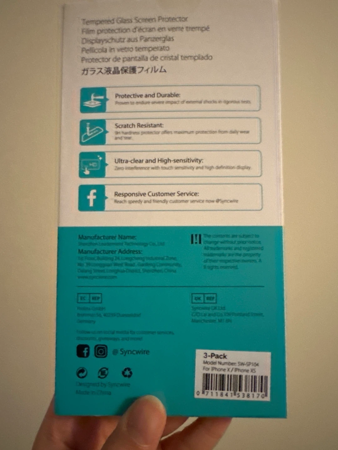 Only have one protector left for iPhone X/iPhone XS. The box includes 2 sets of alcohol wipes, 2 sets of dust stickers, and small rag. Designed to be protective and durable, scratch-resistant, and ultra-clear with high sensitivity