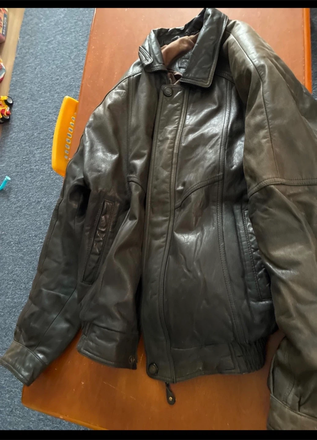 Classic leather jacket in a bomber style! It's in usedcondition and ready for a new owner. Perfect for adding a touch of cool to any outfit the leather is yellowing.