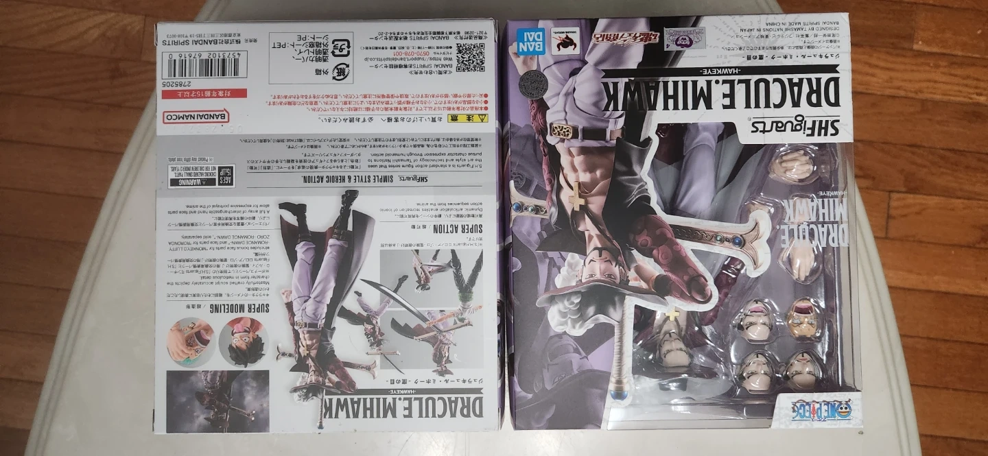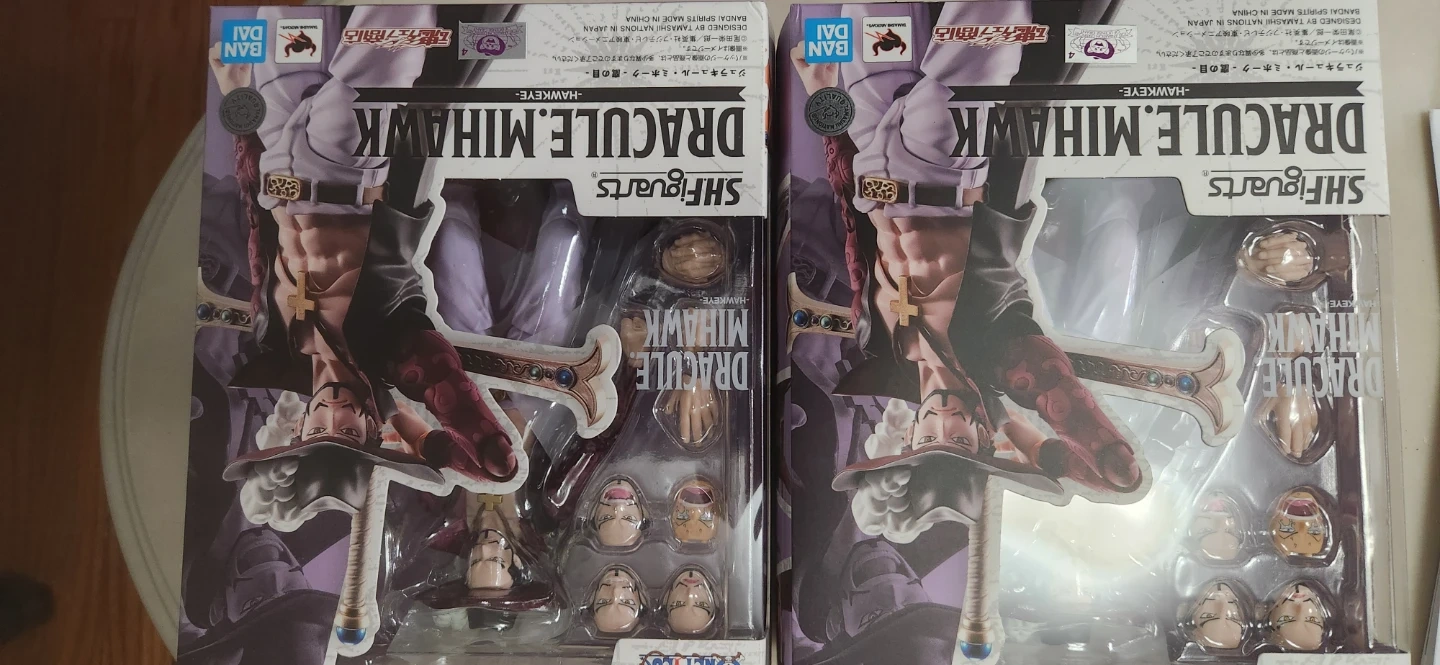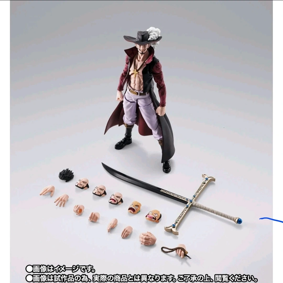 Selling a Mihawk action figure from One Piece. It comes with a variety of accessories, including different hands and faces to customize the figure's pose and expression. Great for any One Piece fan or collector!