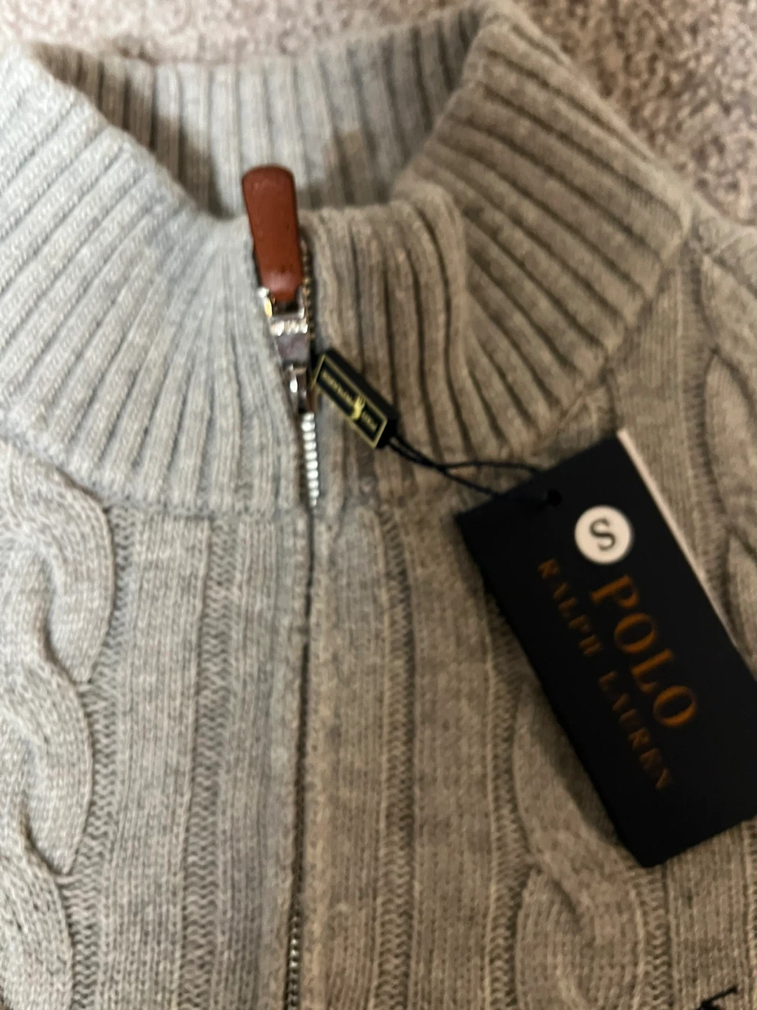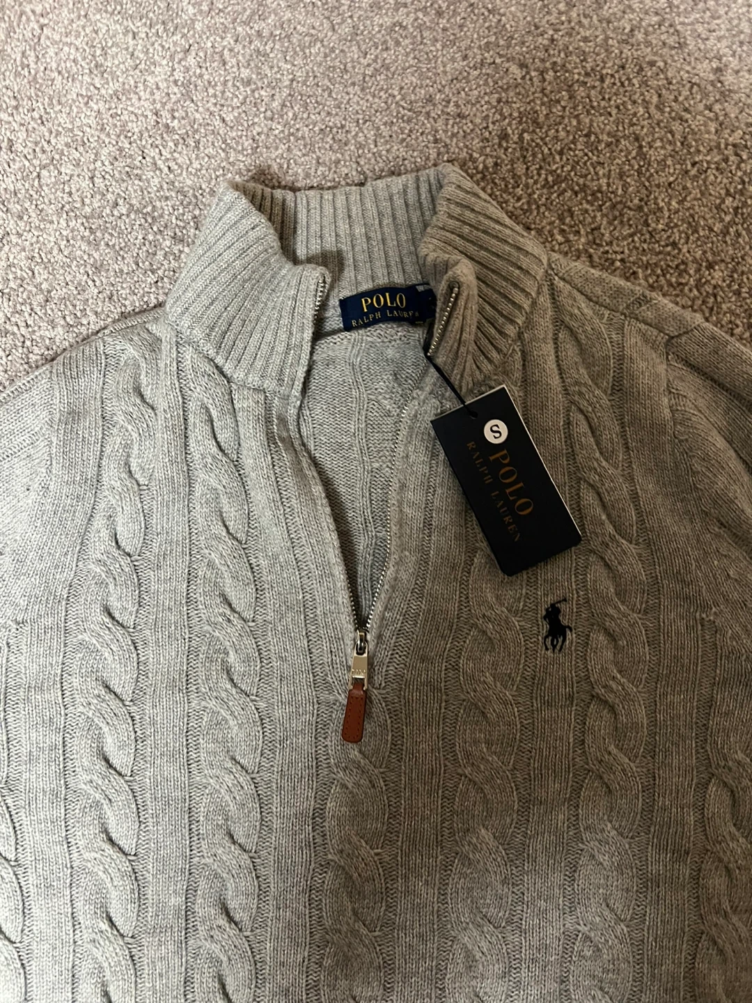 Selling a brand new with tags Polo Ralph Lauren cable knit sweater! It's a size small and features a classic cable knit design. The sweater is a light grey colour and has a quarter-zip closure. Perfect for staying warm and stylish!