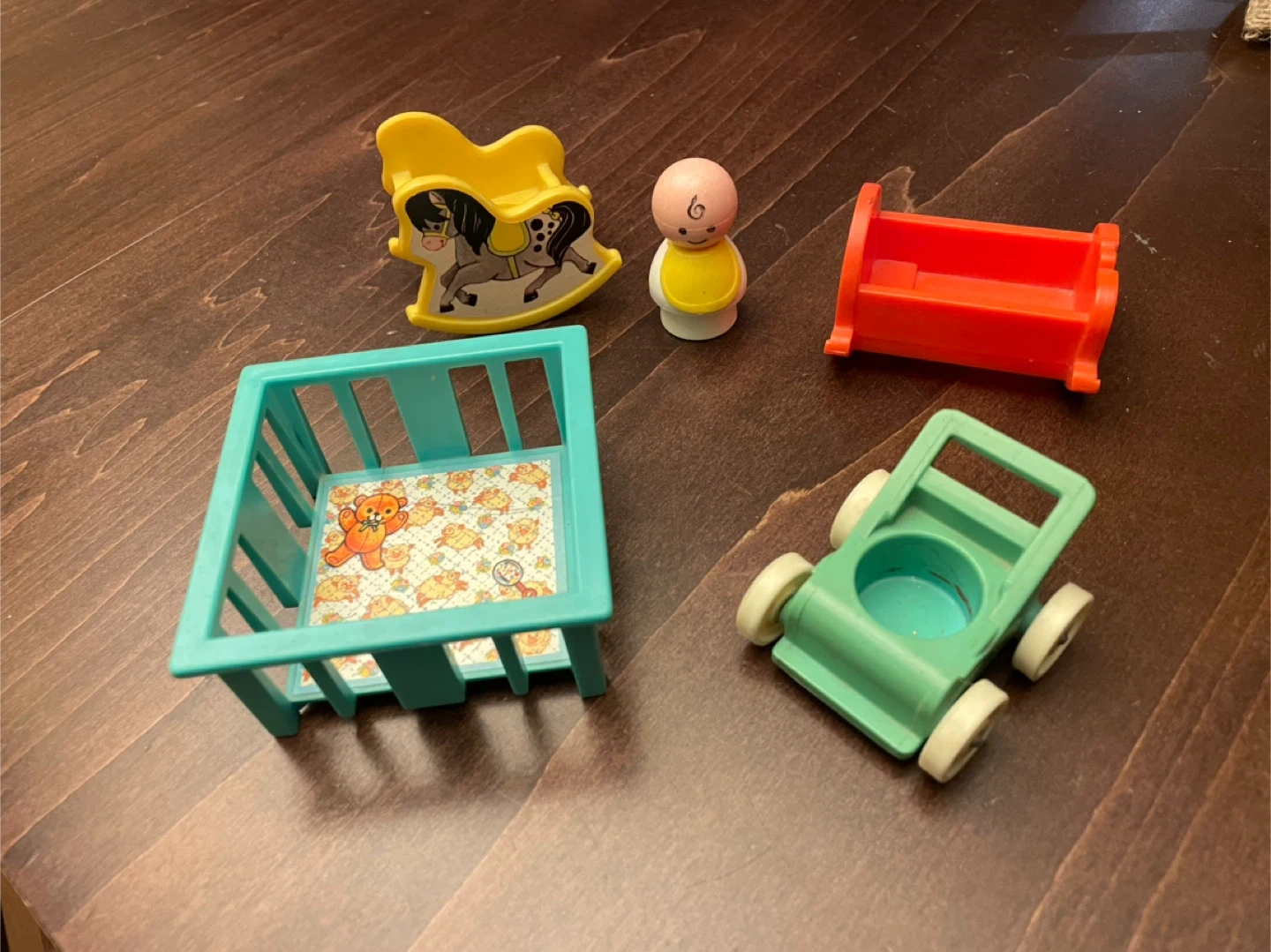 Selling a sweet little set of vintage 1972 Fisher-Price dollhouse furniture! Includes a rocking horse, baby, crib, baby bed, and stroller. Perfect for collectors or kids who love imaginative play.