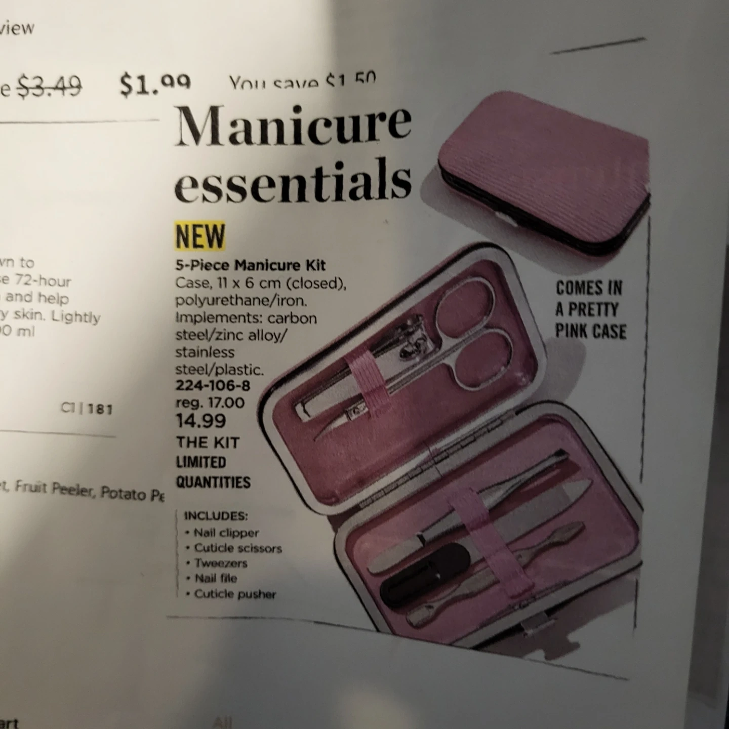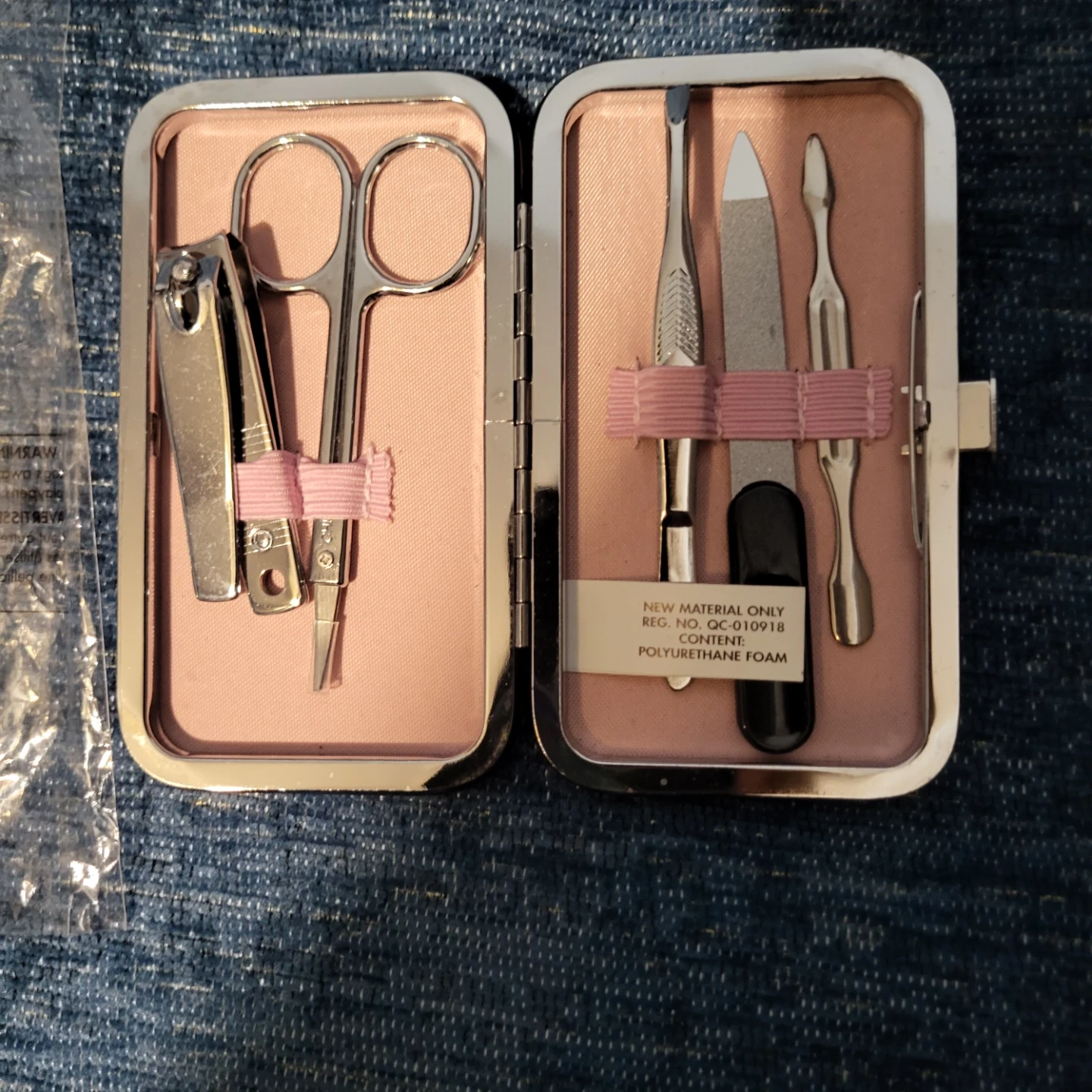 Selling a brand new 5-piece manicure kit! It comes in a pretty pink case and includes nail clippers, cuticle scissors, tweezers, a nail file, and a cuticle pusher. The case is 11 x 6 cm when closed, and it's made of polyurethane/iron. Perfect for keeping your nails looking their best!