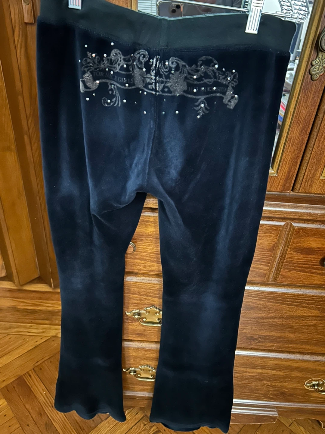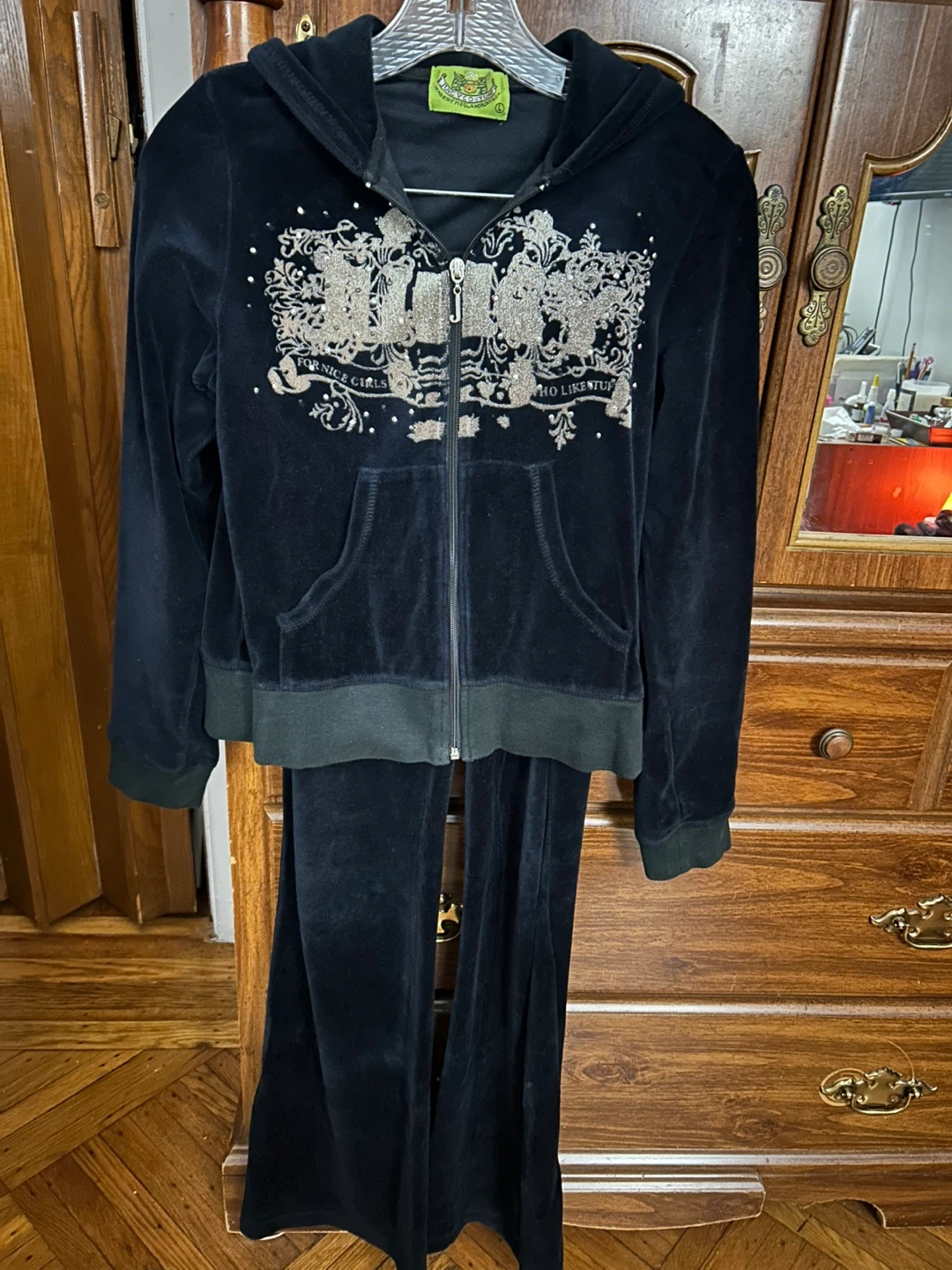 Selling a Juicy Couture black velour tracksuit set! The set includes both the pants and the zip-up hoodie. The pants have the word "Juicy" bedazzled on the side. The hoodie has a detailed design on the front. Perfect for a comfy and stylish look!