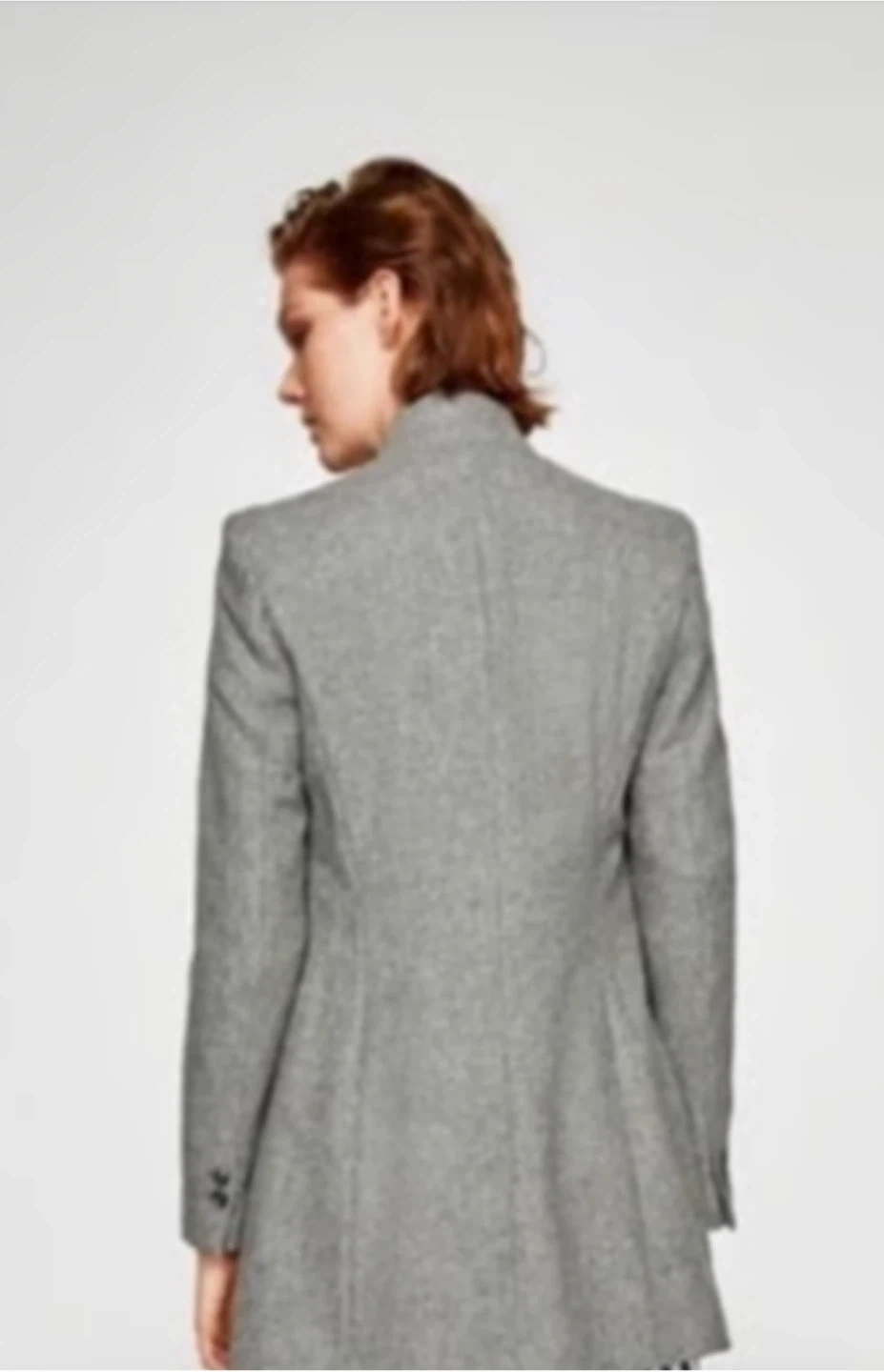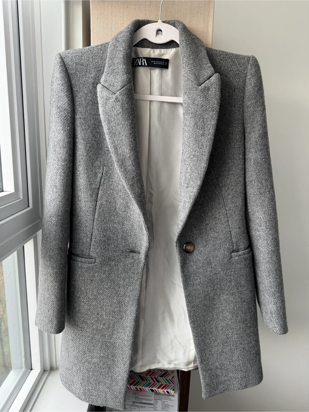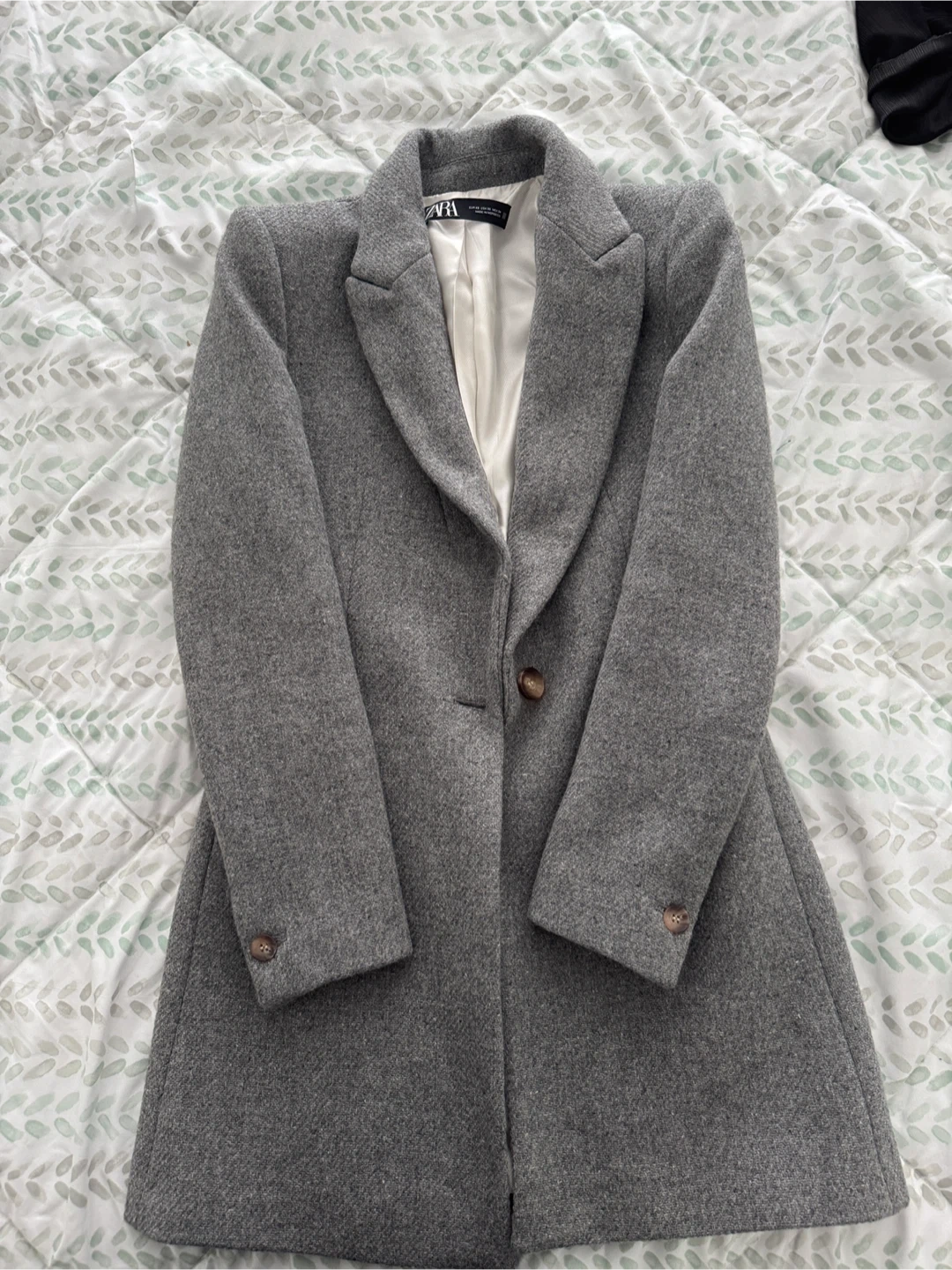 Selling a Zara wool blend coat in grey. It's a stylish and versatile piece for your wardrobe. Perfect for layering during the cooler months!