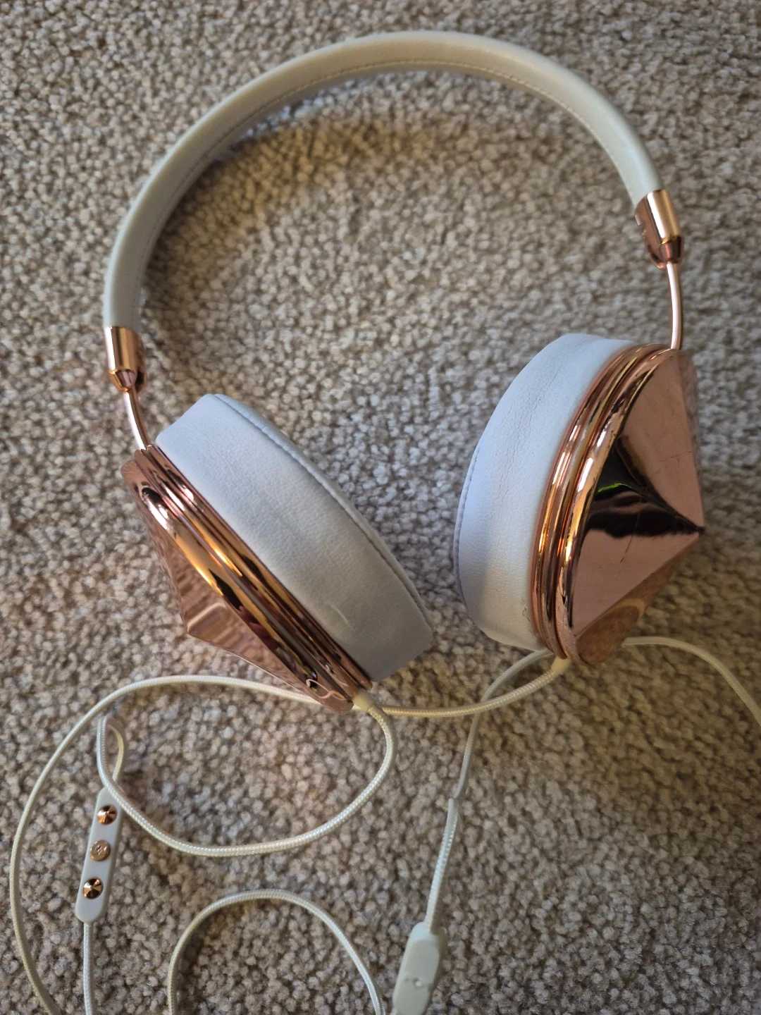 Selling a pair of headphones featuring a stylish rose gold and white colour scheme. They're wired and in good condition, ready for a new owner!