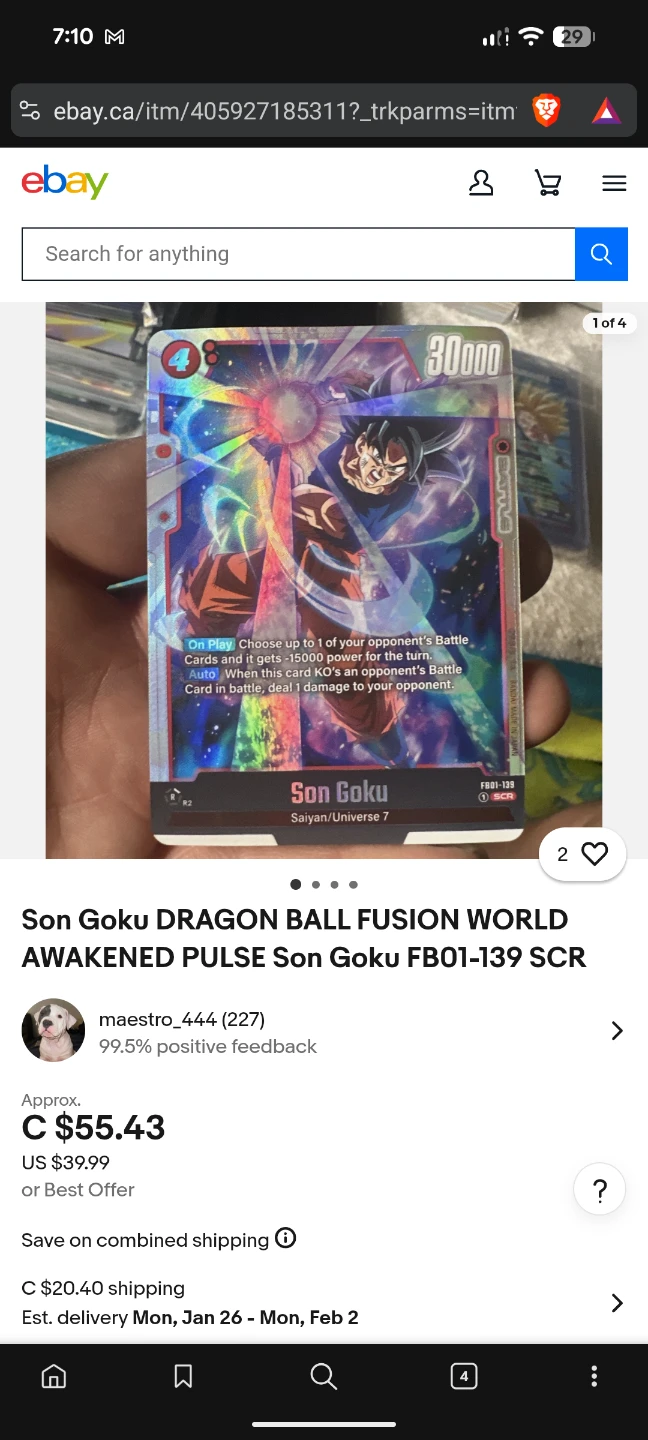1 / 31 / 3Buy & SellDragon Ball Super Card Game Son Goku FB01-139 SCRDragon Ball Super Card Game Son Goku FB01-139 SCR$7Selling a Dragon Ball Super Card Game card featuring Son Goku from Saiyan/Universe 7! The card is FB01-139 SCR.ConditionNewWHERE TO MEETSheppard West Station Passenger Pick-upView MapSELLERverifiedJohnSheppard West Station37730 reviews2 chats·3 favorites·88 viewsSEND CHAT TO SELLERHi John! I’m interested in your listing.Hi John! I’m interested in your listing.Get the Karrot app to chatSign In to chat