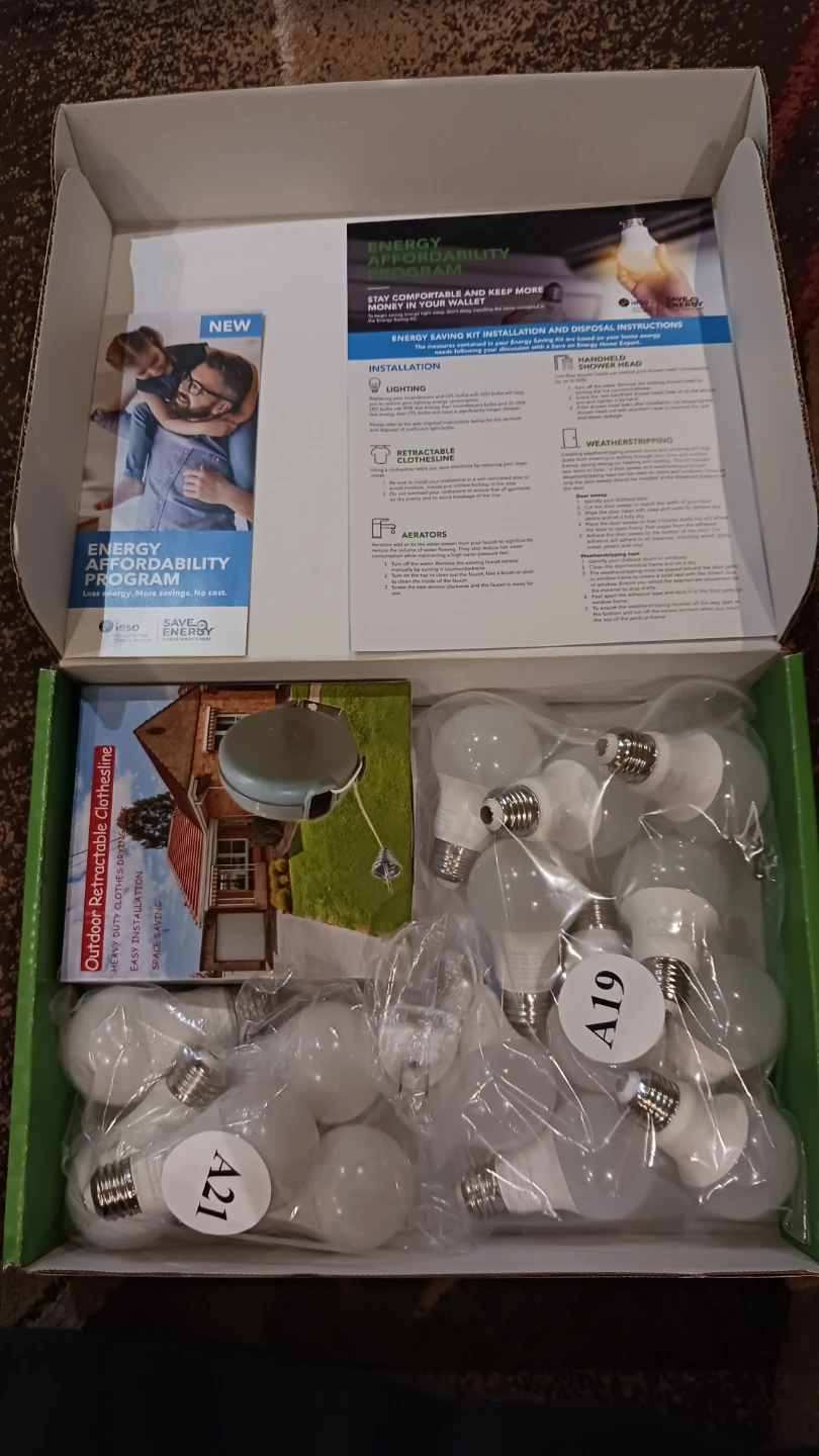 I'm selling a brand new energy saving kit! It includes items to help make your home more energy efficient. The box includes: - LED lightbulbs (10 of A19, and 5 of A21) - Retractable clothesline - Night light Feel Free To Chack My Other Listings :) CASH ONLY