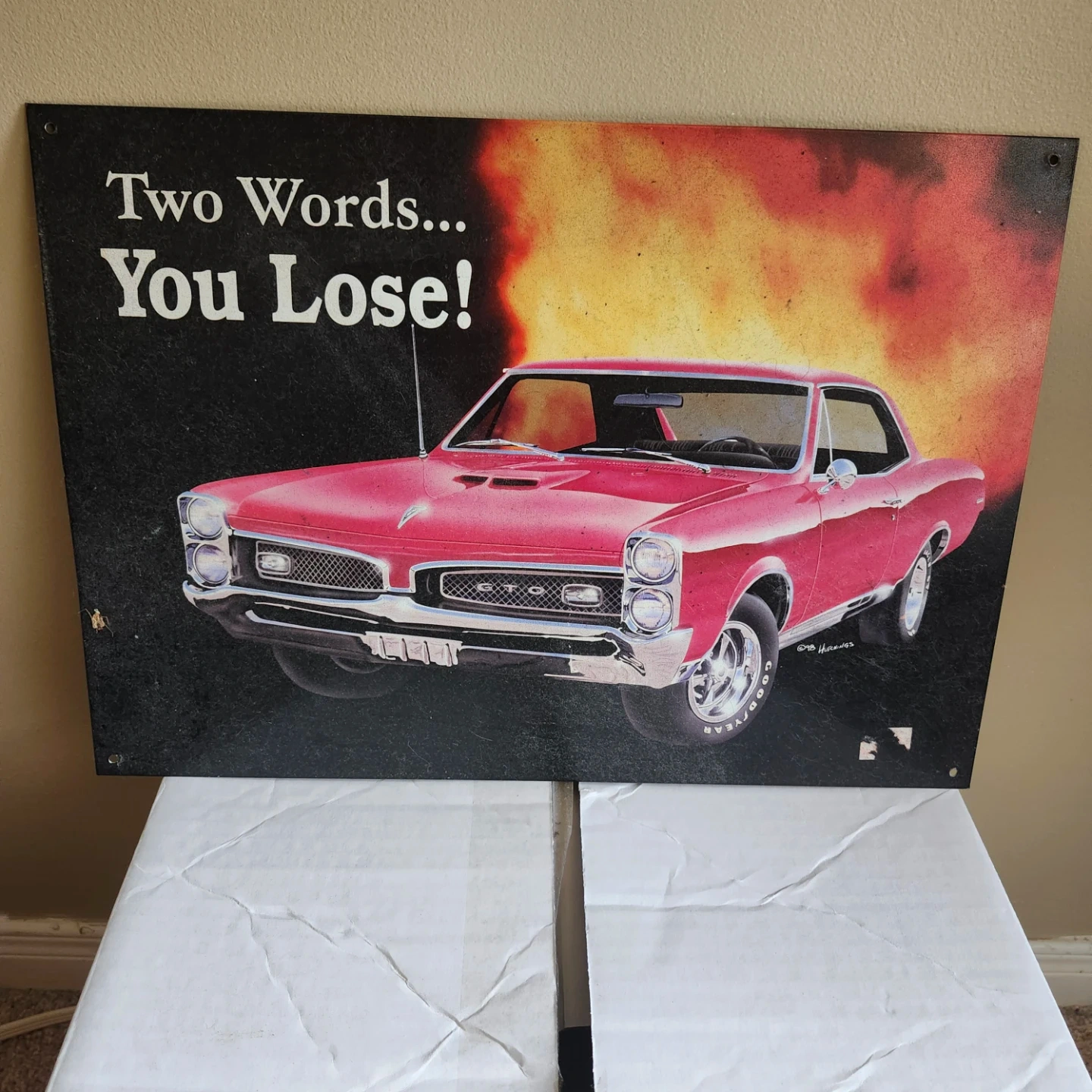 Selling a vintage Pontiac GTO metal sign featuring a red GTO and the phrase "Two Words... You Lose!" Also included is a Pontiac Licence plate. A Superior Universal "H" Style License Plate Hanger, still in its original packaging. Perfect for any car enthusiast or collector.