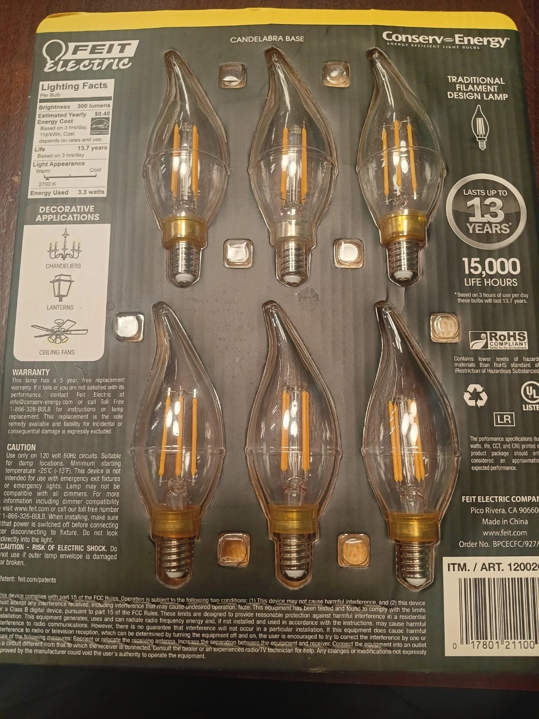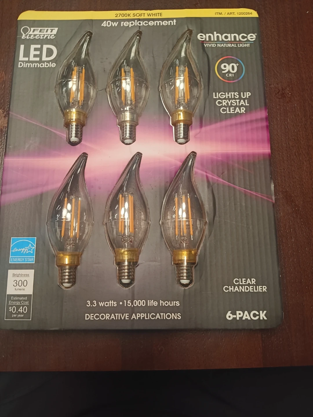 Selling a 6-pack of Feit Electric LED dimmable clear chandelier bulbs! They're brand new and ready to light up your space. Each bulb is 3.3 watts and provides 300 lumens of brightness. Perfect for chandeliers, lanterns, and ceiling fans. TWO PACKAGES. SIX BULBS IN EACH PACKAGE. EACH PACKAGE $10
