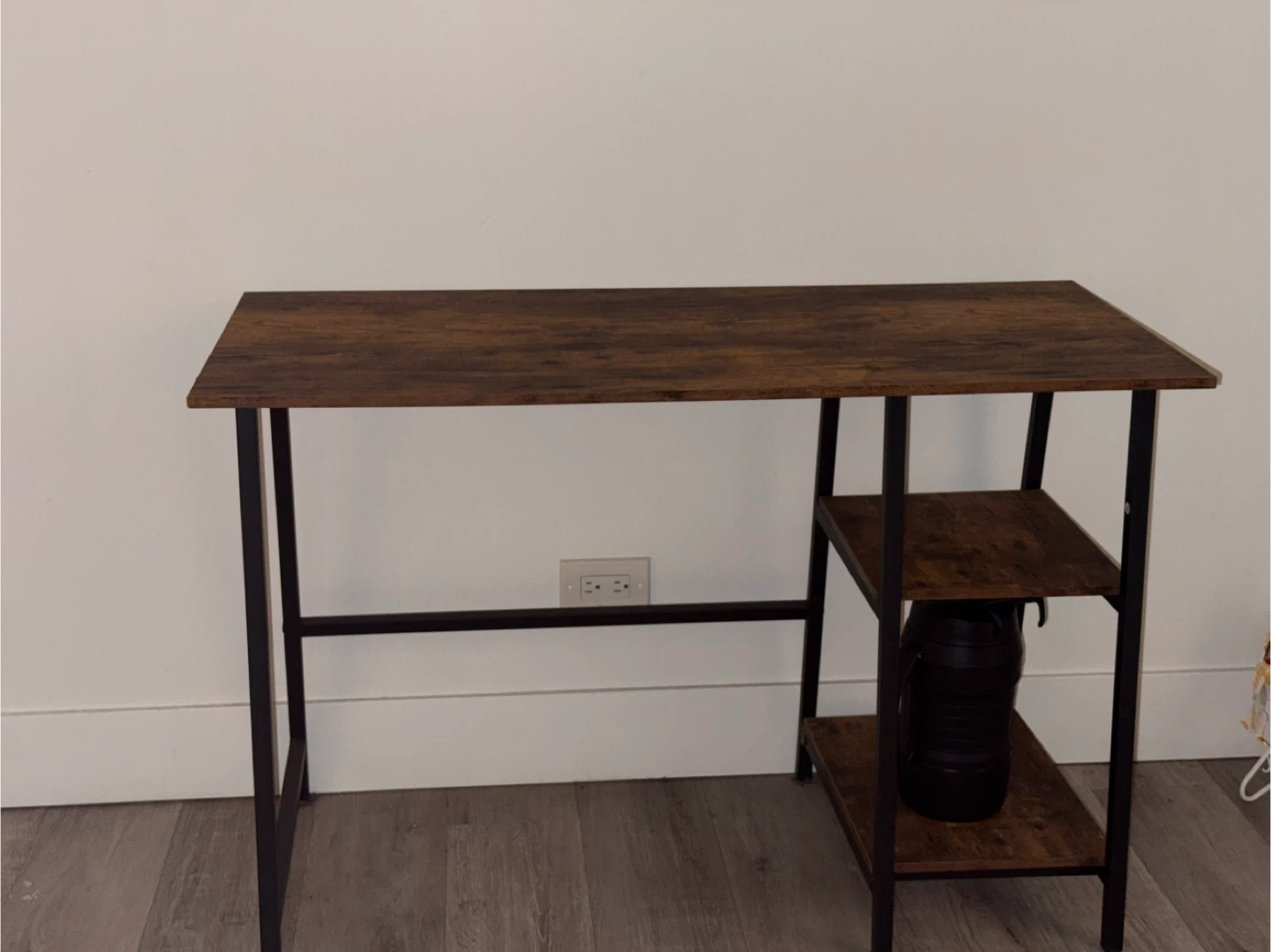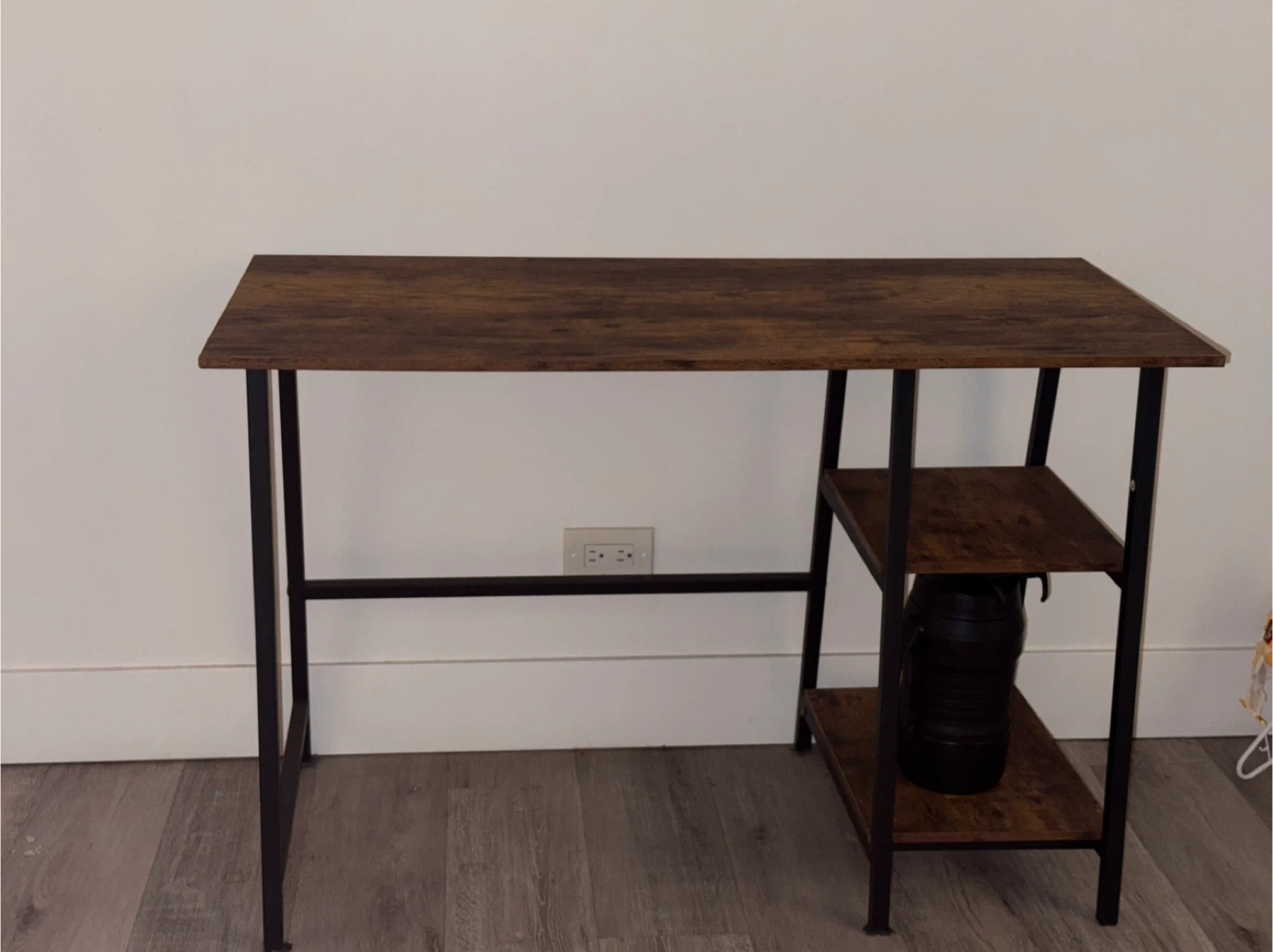 Looking to sell this desk, it has a brown top and black frame. It also features shelves on the side for extra storage! It's perfect for a home office or study space