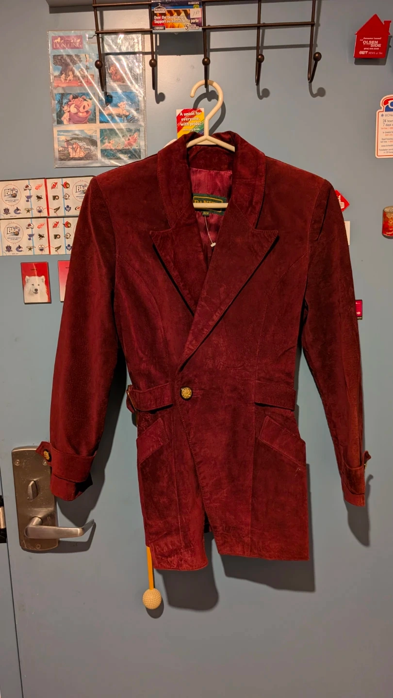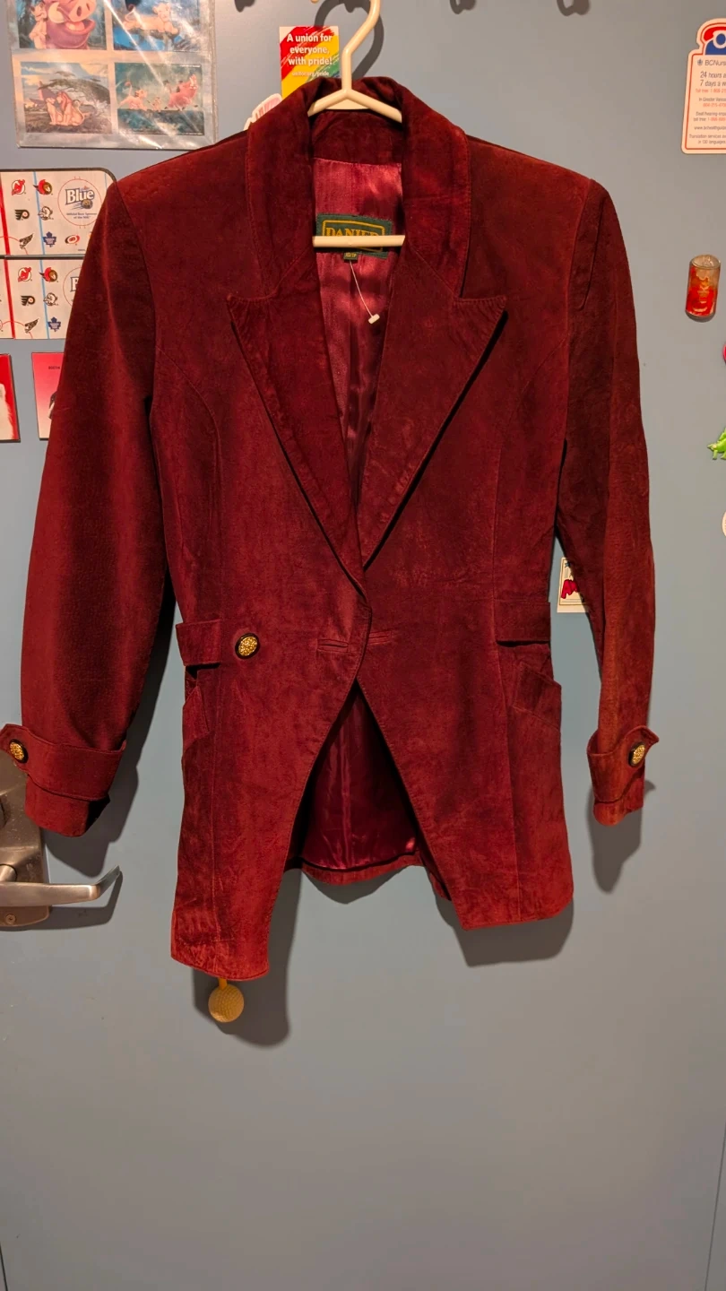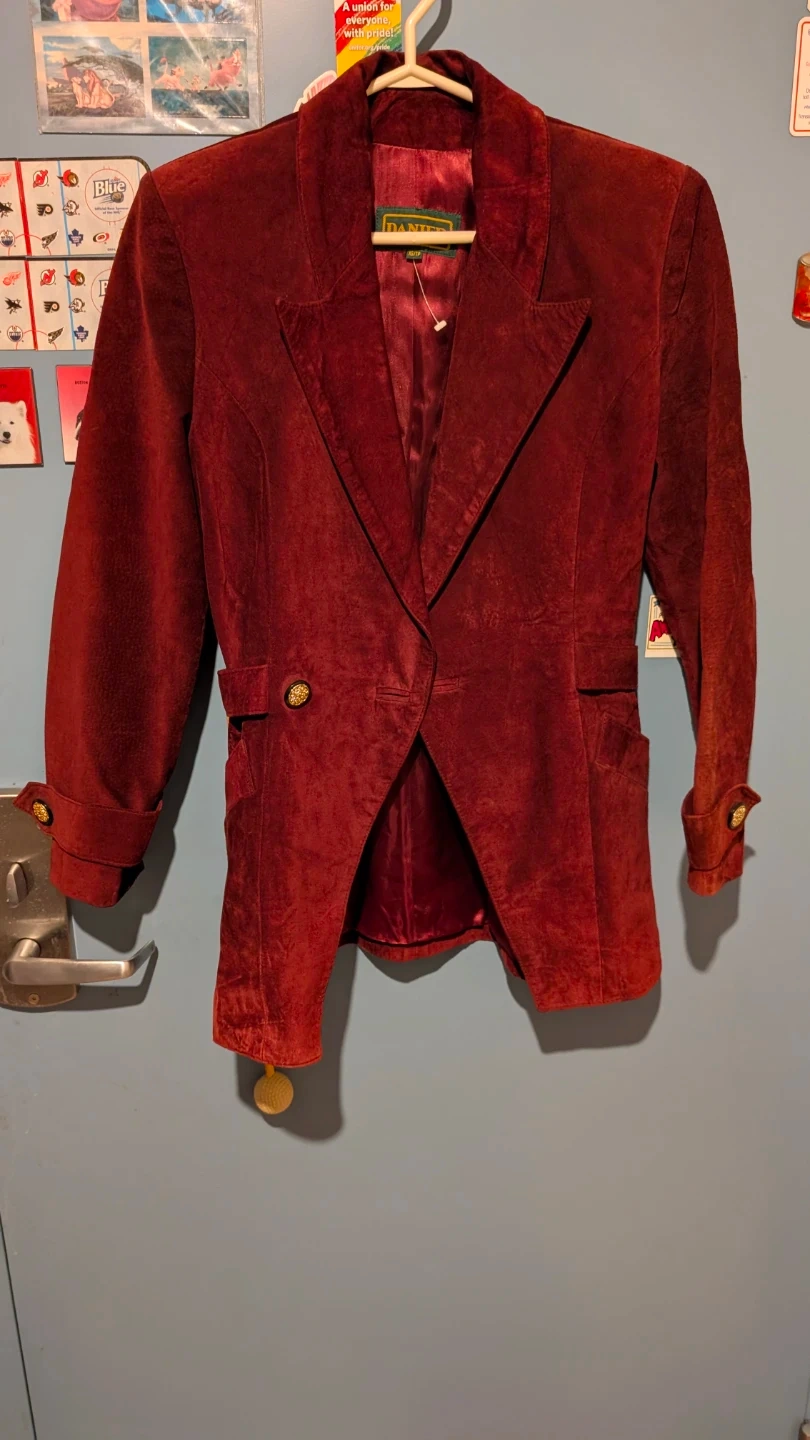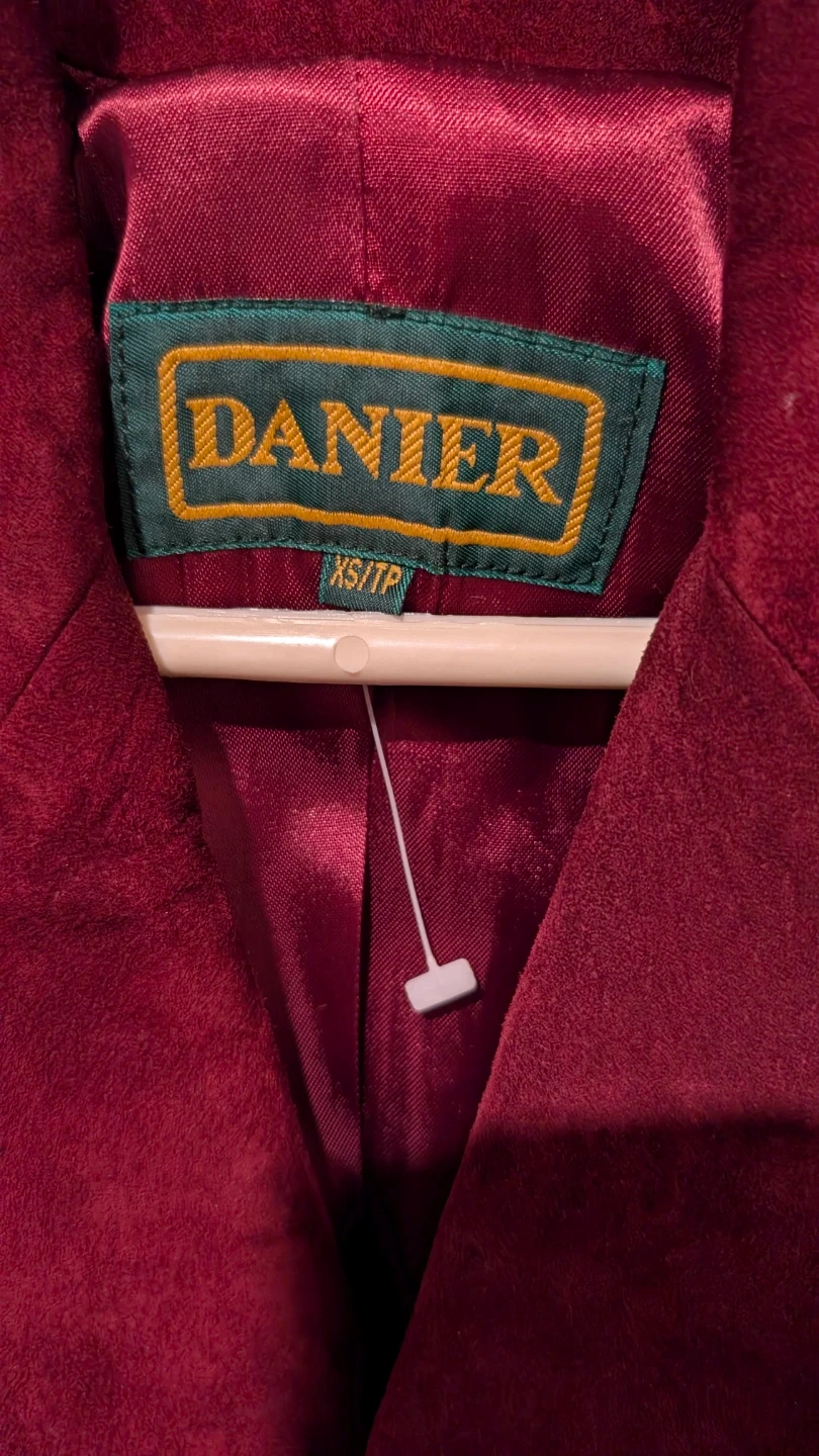 Here's a Danier blazer in a beautiful burgundy colour! It's made of suede and is a size XS. Perfect for adding a touch of class to any outfit. Only been tried on and bought then stored it away.