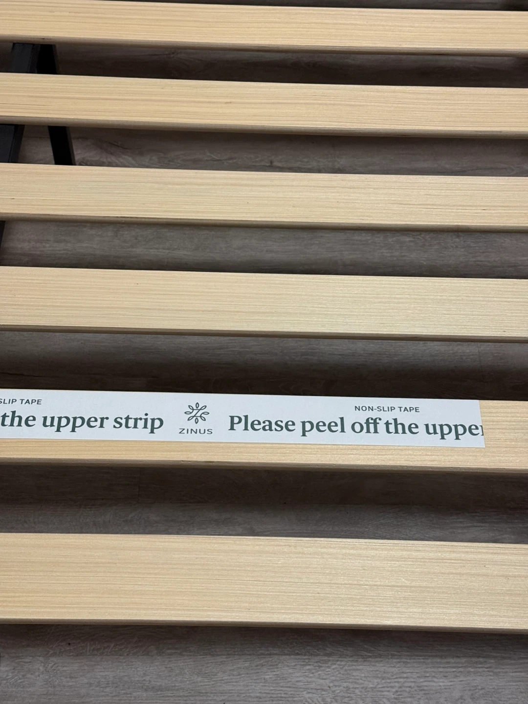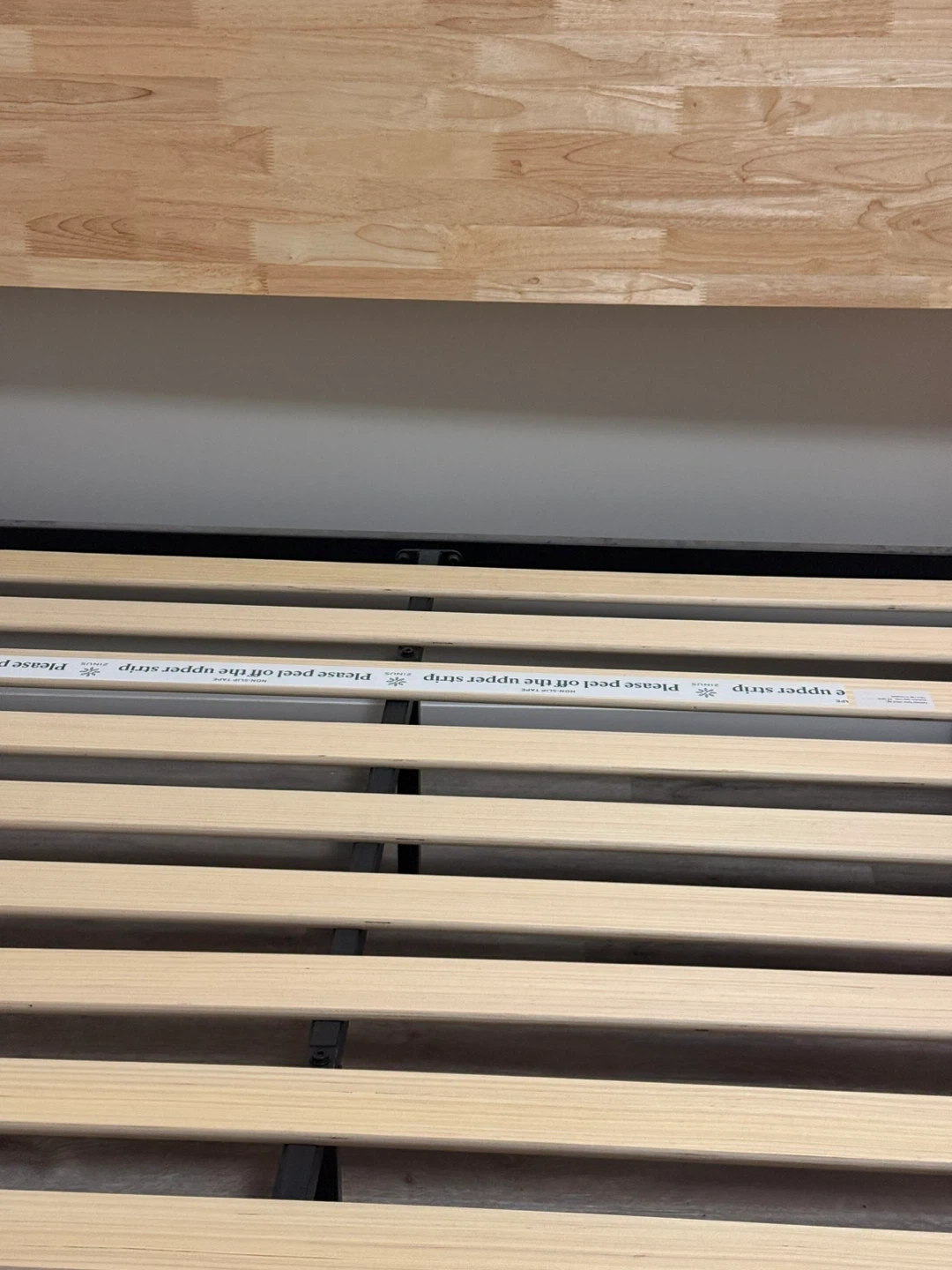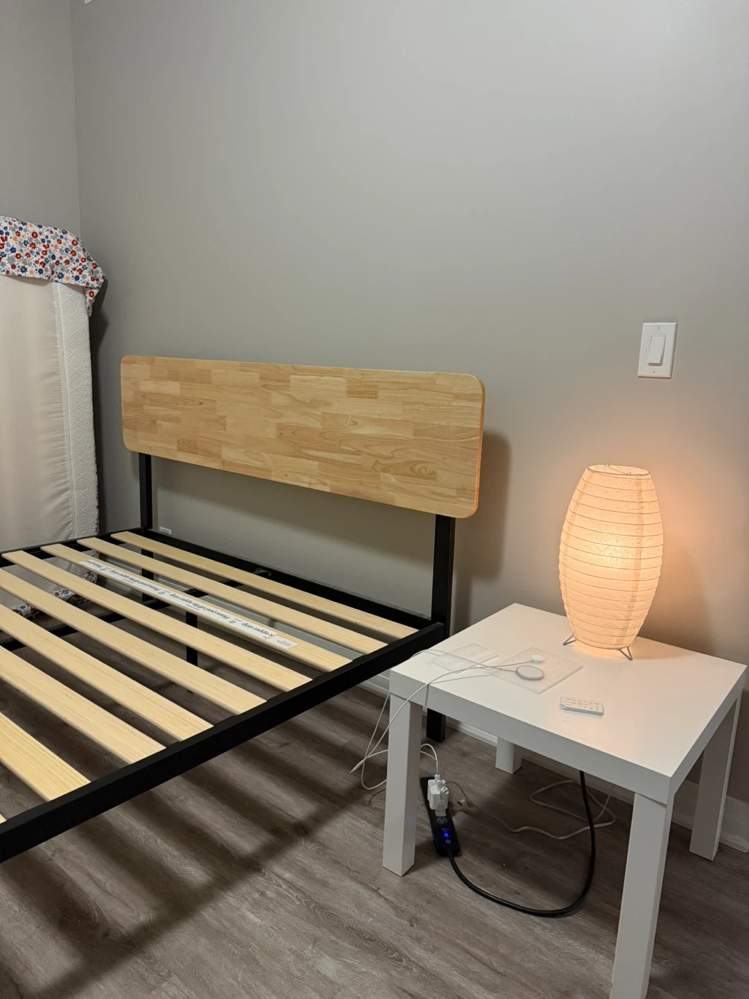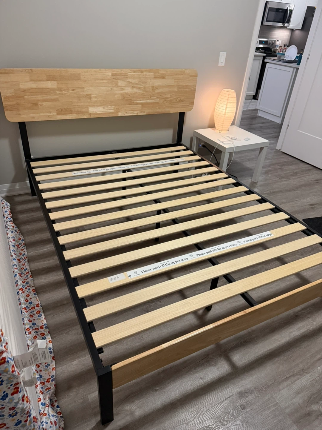 Selling a Zinus Queen size bed frame with wooden slats. The frame is black metal with a wooden headboard. It's in great shape and ready for a new home!