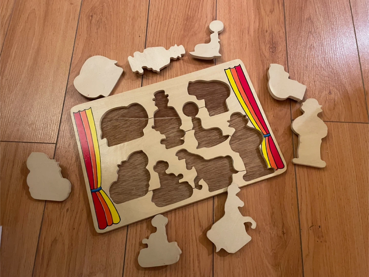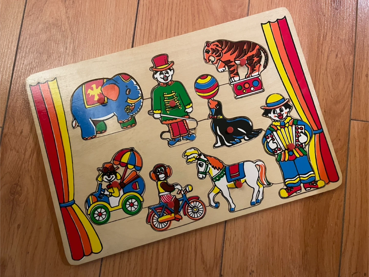 A fun wooden circus-themed puzzle! It features colourful illustrations of circus animals and performers. Great for developing problem-solving skills and hand-eye coordination for little ones. The paint is all intact.