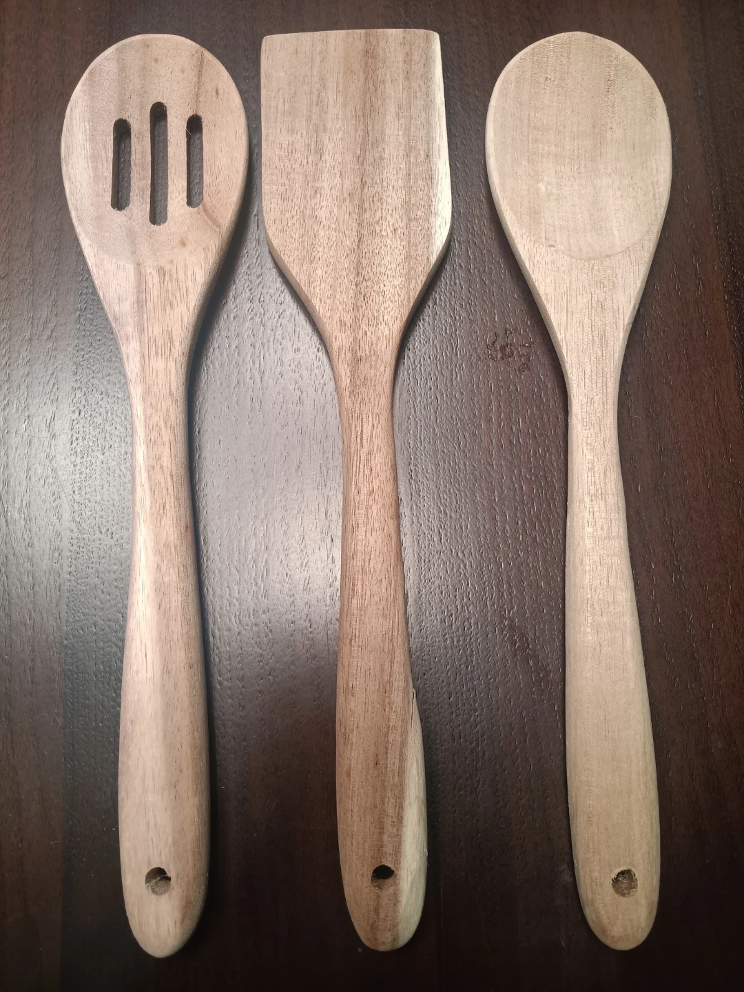 Selling a set of three wooden kitchen utensils. They include a slotted spoon, a spatula, and a regular spoon. These are perfect for cooking and serving!