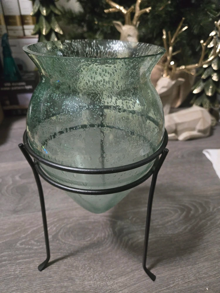 This is a lovely green glass vase with a unique bubble texture. It comes with a sturdy black metal stand that complements the vase beautifully. It's perfect for displaying flowers, pot pourrie, floating candles or as a decorative piece in your home.