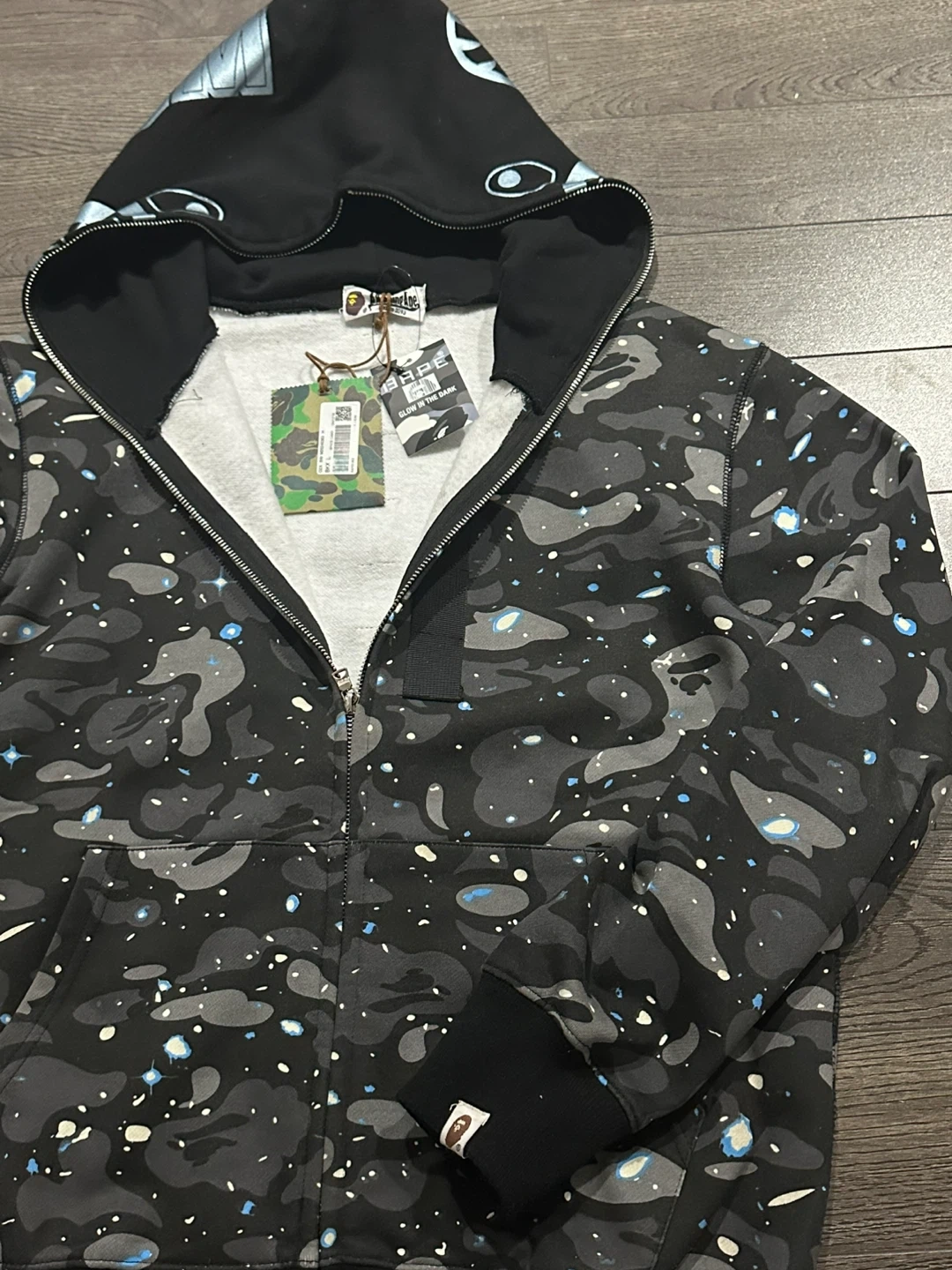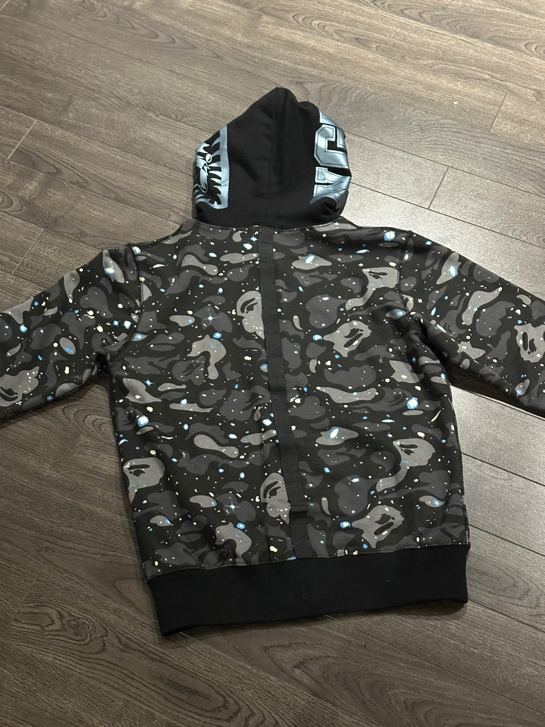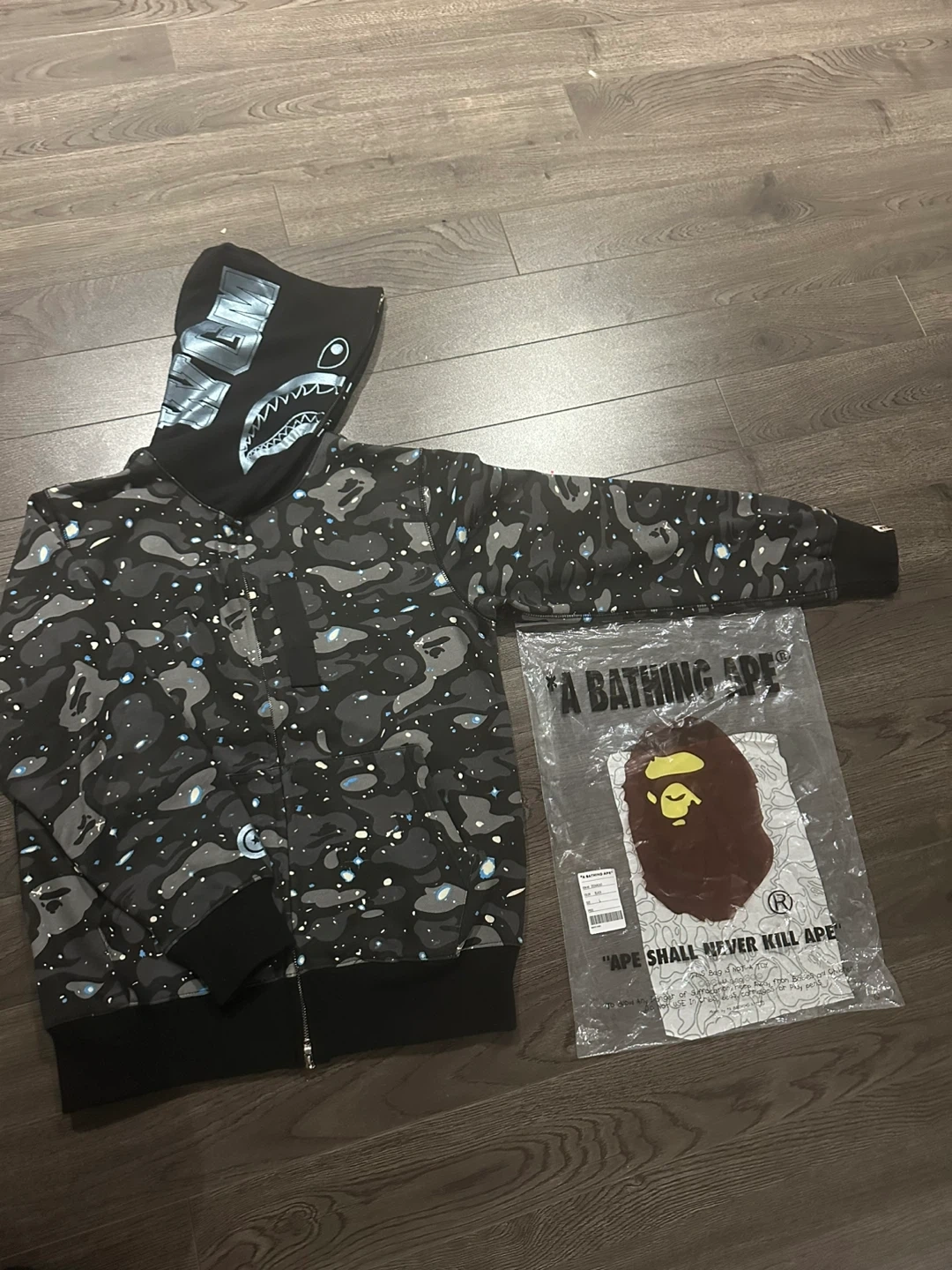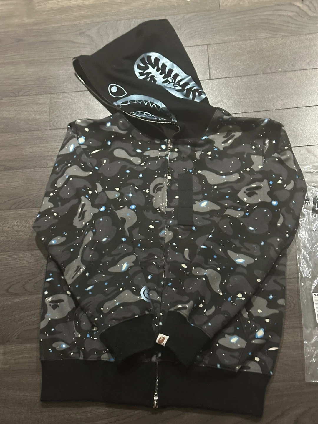 Selling a BAPE Space Camo Shark Full Zip Hoodie. It features a unique space camo pattern and the iconic shark design on the hood. Perfect for adding a statement piece to your wardrobe! (It glows in the dark. WORN 2 TIMES