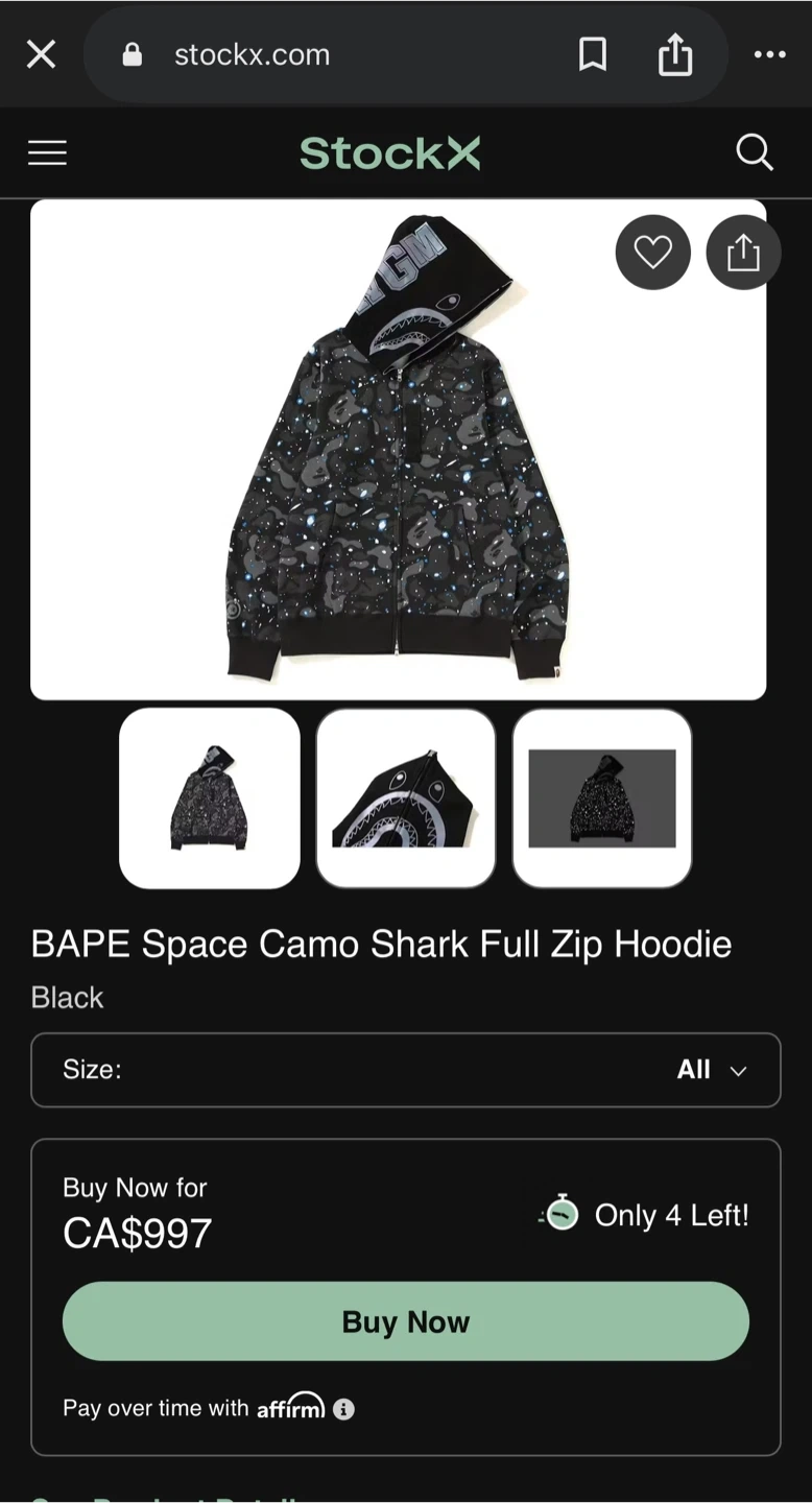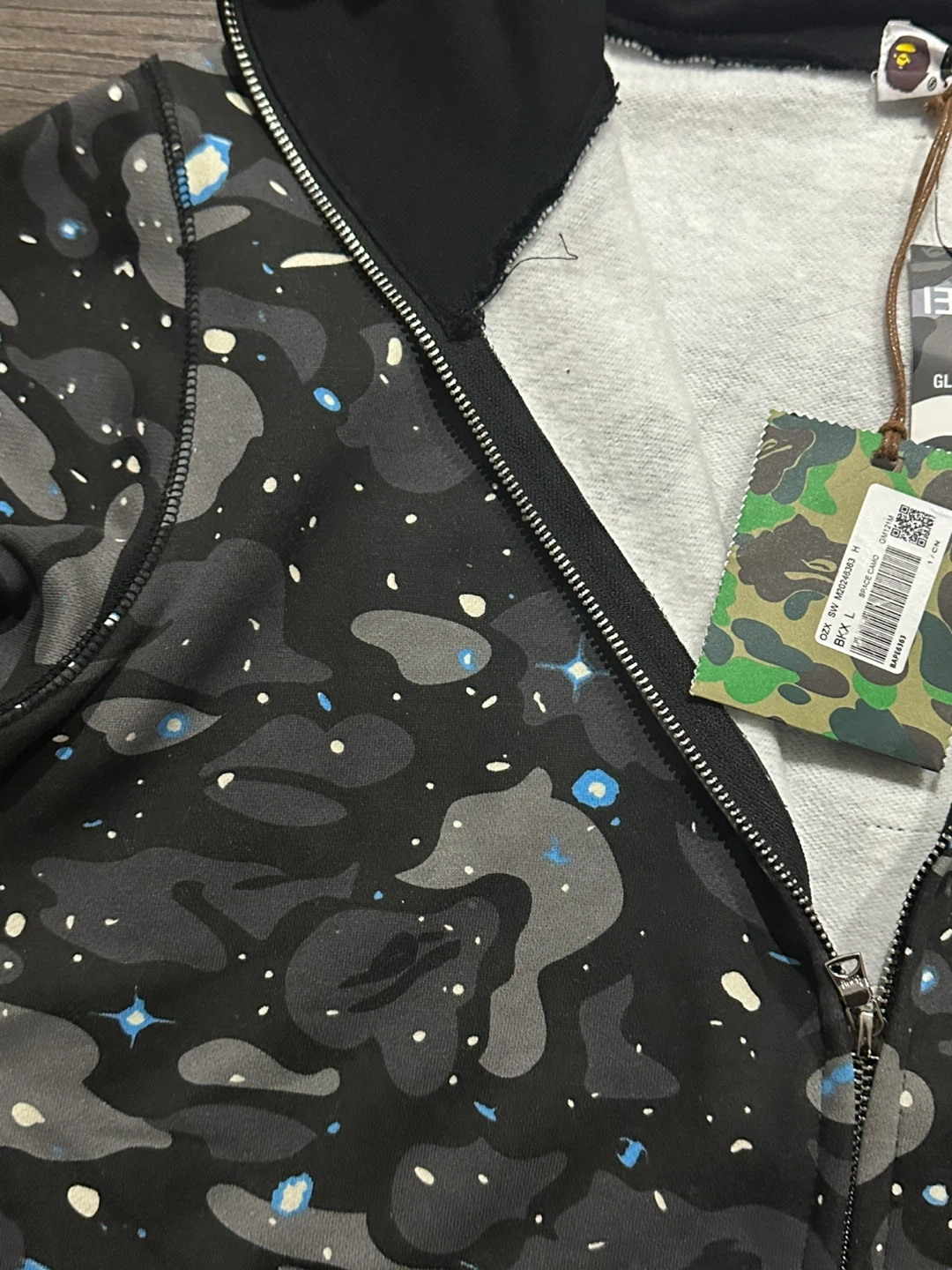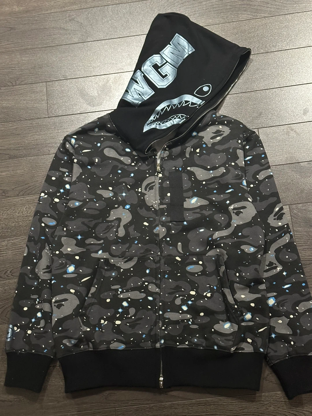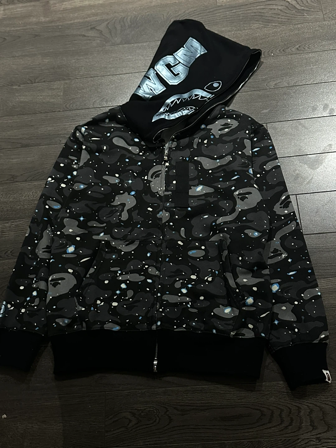 Selling a BAPE Space Camo Shark Full Zip Hoodie. It features a unique space camo pattern and the iconic shark design on the hood. Perfect for adding a statement piece to your wardrobe! (It glows in the dark. WORN 2 TIMES