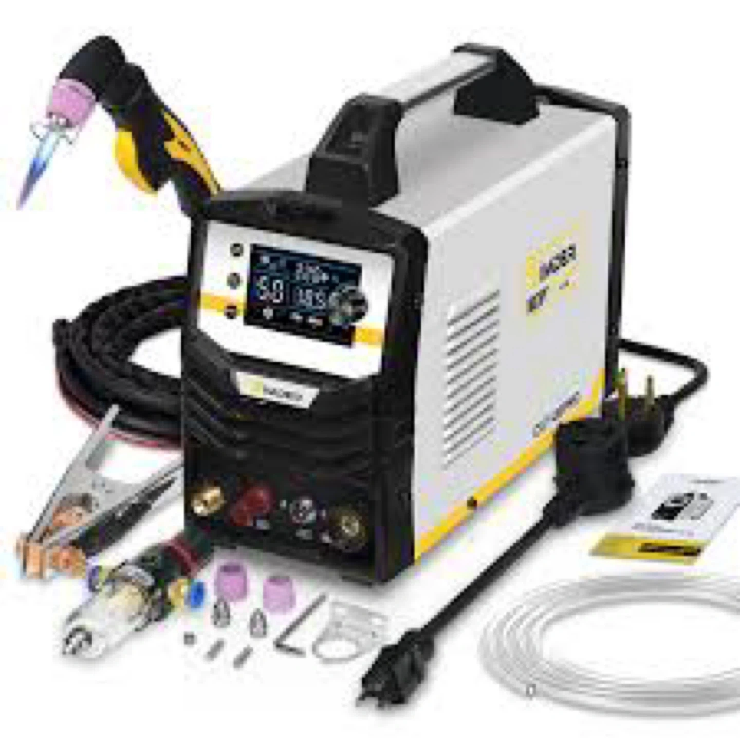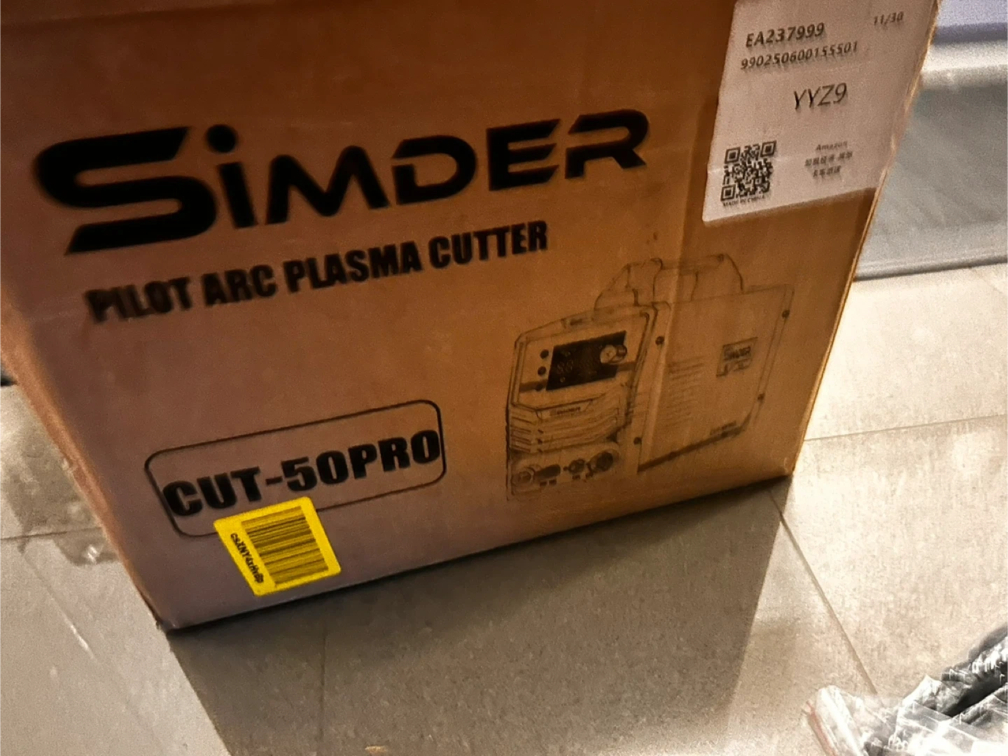 Selling a brand new SIMDER Pilot Arc Plasma Cutter, model CUT-50PRO! It comes with the original box and all included components. This cutter features a 2T/4T switch, post flow setting, metric/imperial unit conversion, and current/post flow adjustment. It also has connections for the cutting torch and pilot ARC, a 2-pin trigger receptacle for the CUT torch, a ground clamp connection, and air regulator connection. It also includes a power button, cooling fan, and air connection