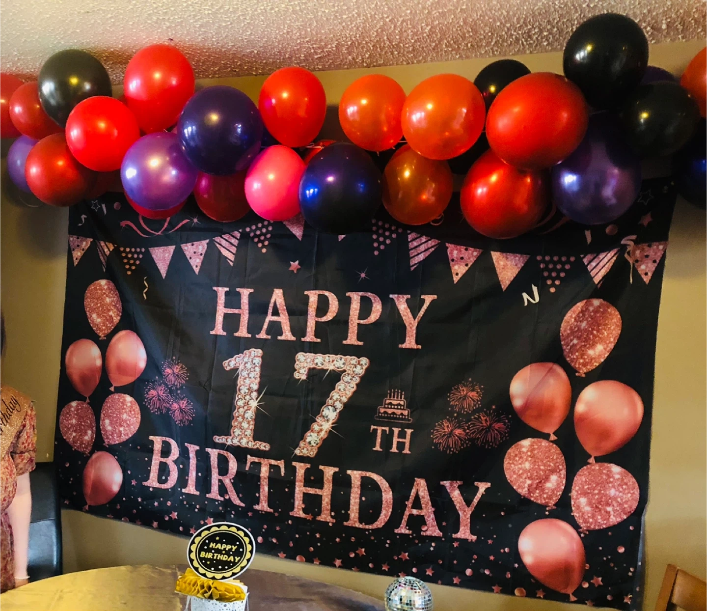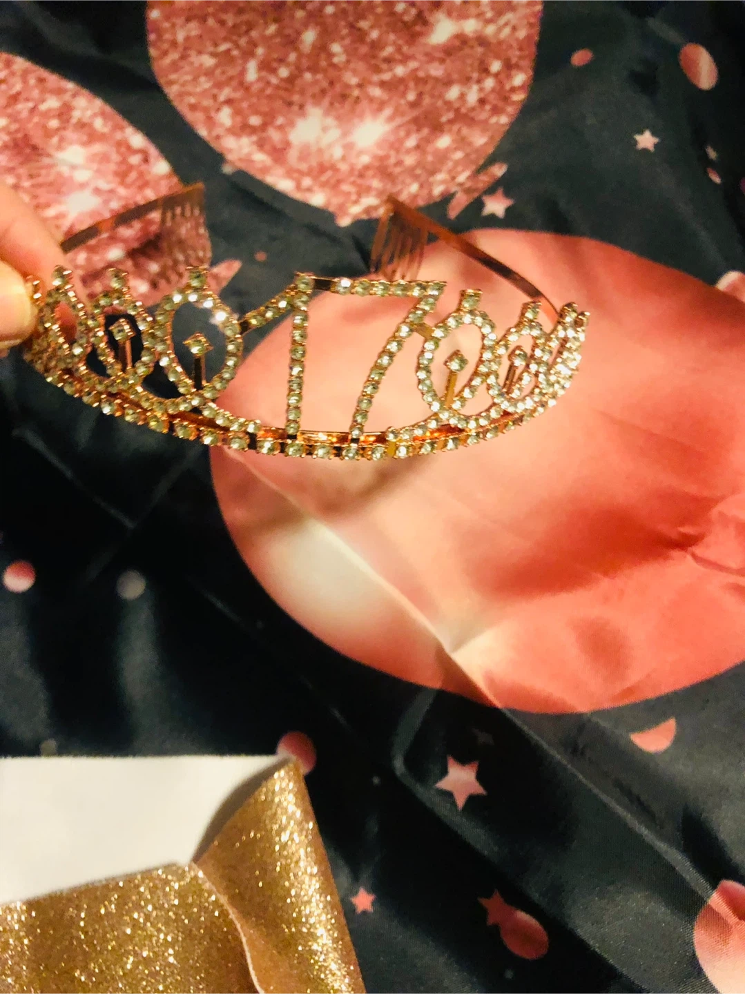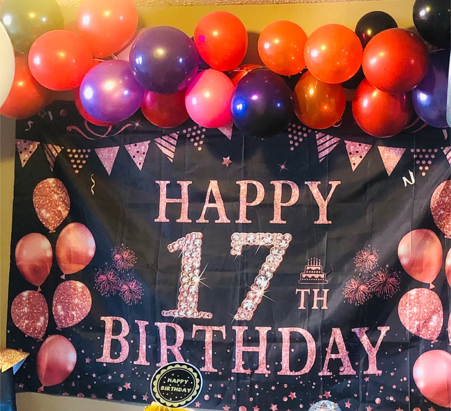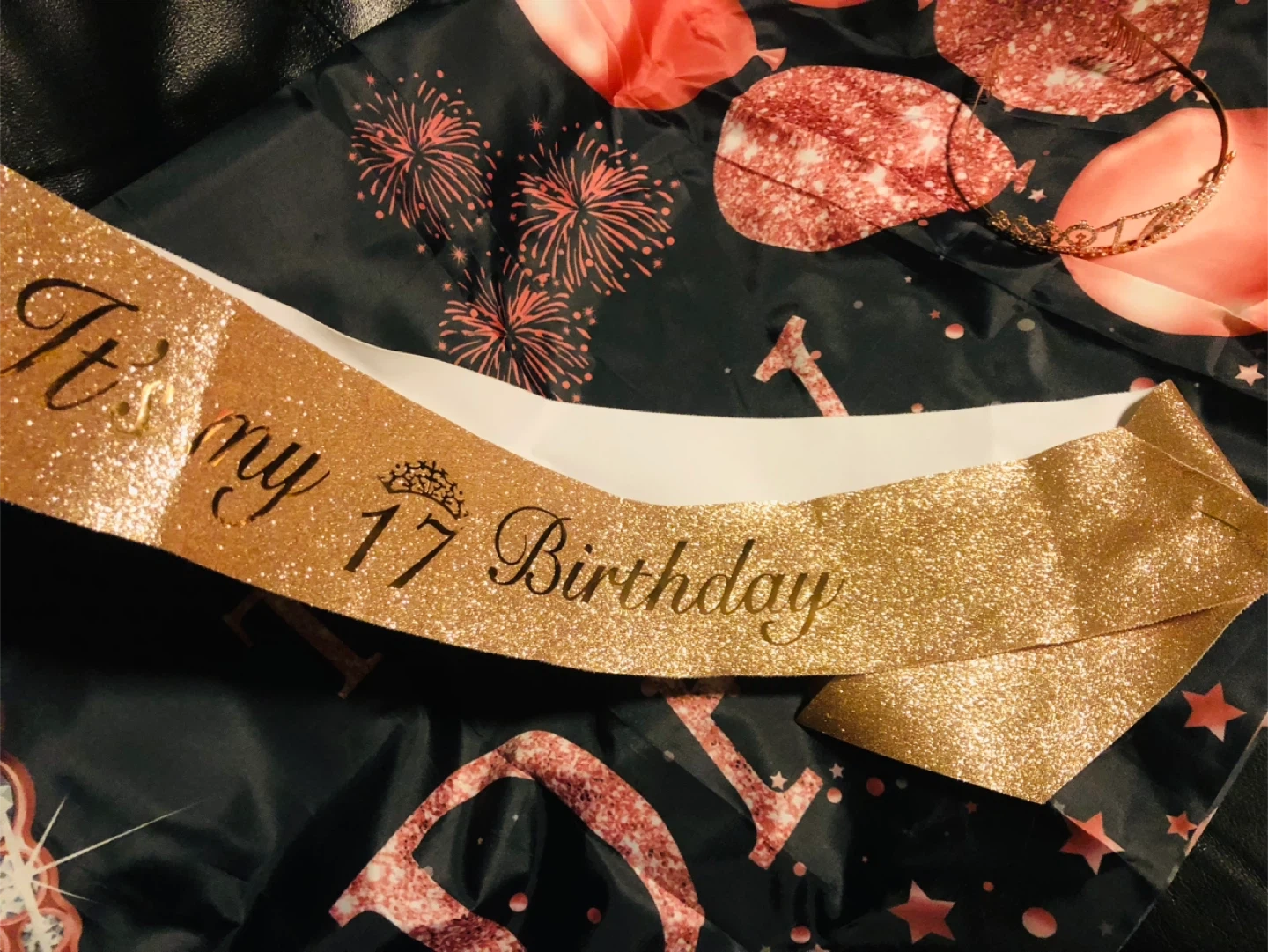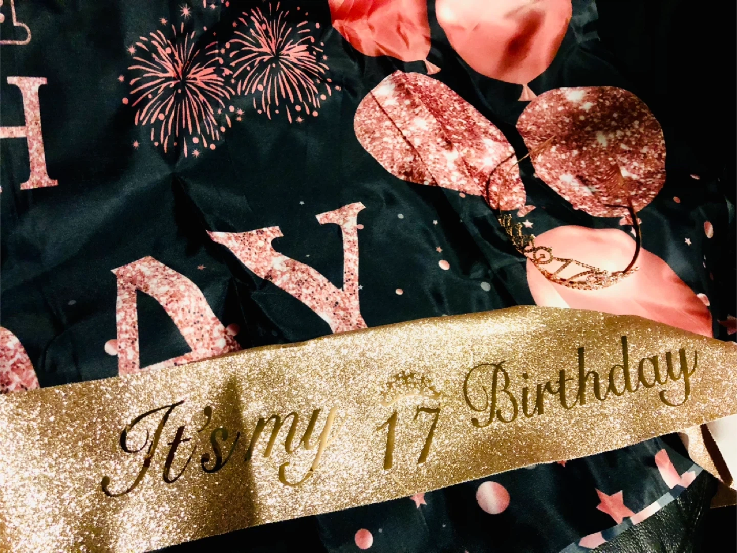 Huge 4.5foot by 4 foot Cloth Banner, says Happy 17th Birthday!Rise Gold ‘17’ Tiara, Rose Gold ‘It’s My 17th Birthday’ Sash, bag full of random gold decor