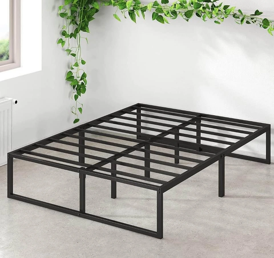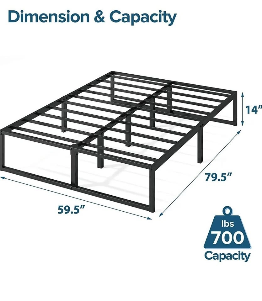 Selling a Zinus Queen Bed Frame, 14-inch height with steel slat support and heavy-duty metal construction. This is a platform bed frame, so no box spring is required.