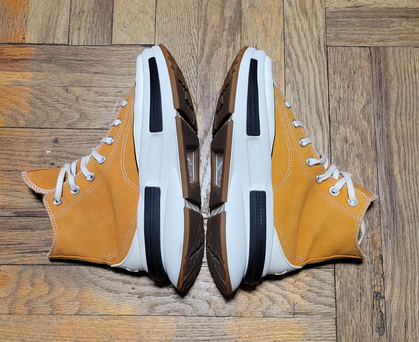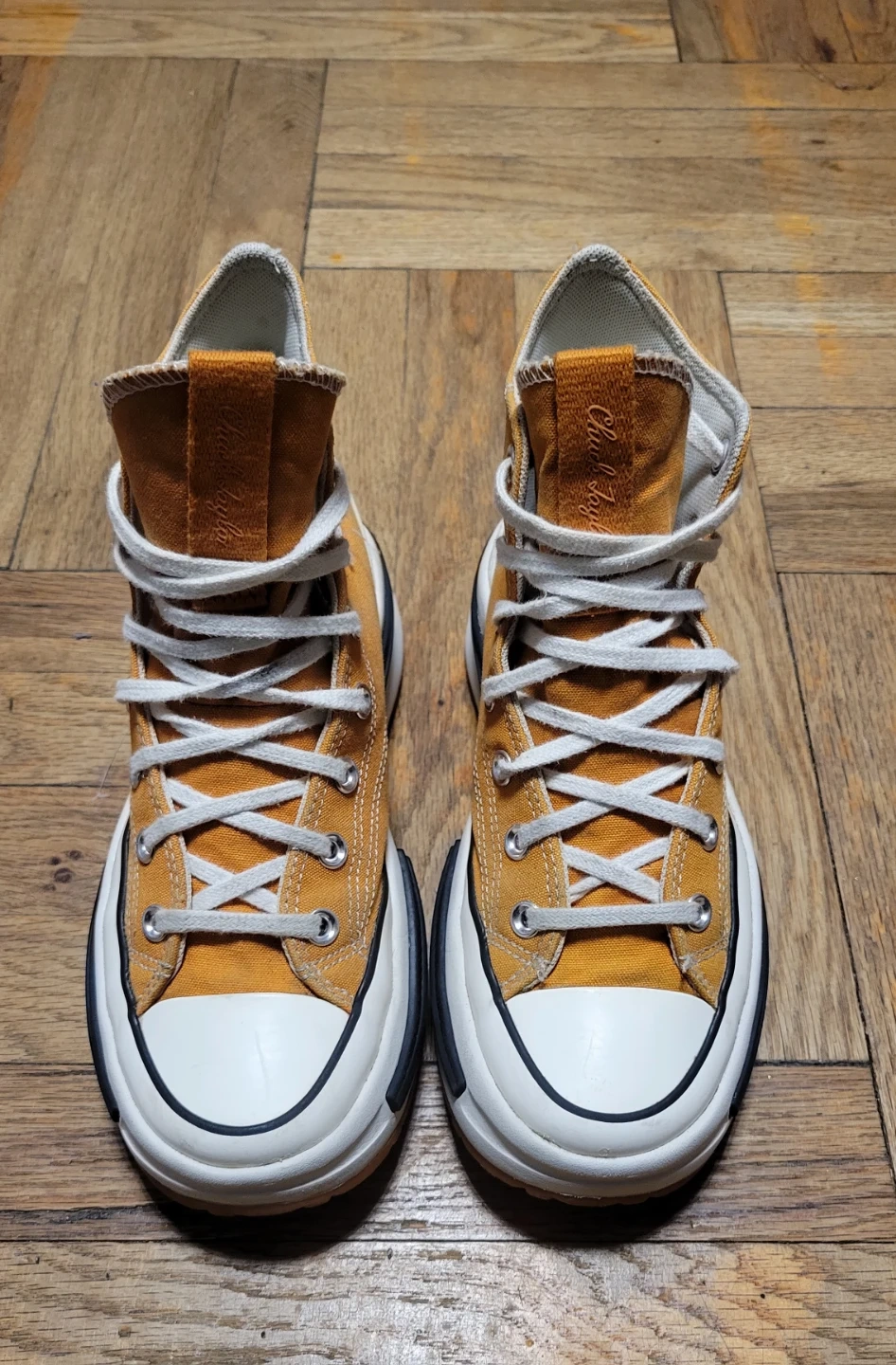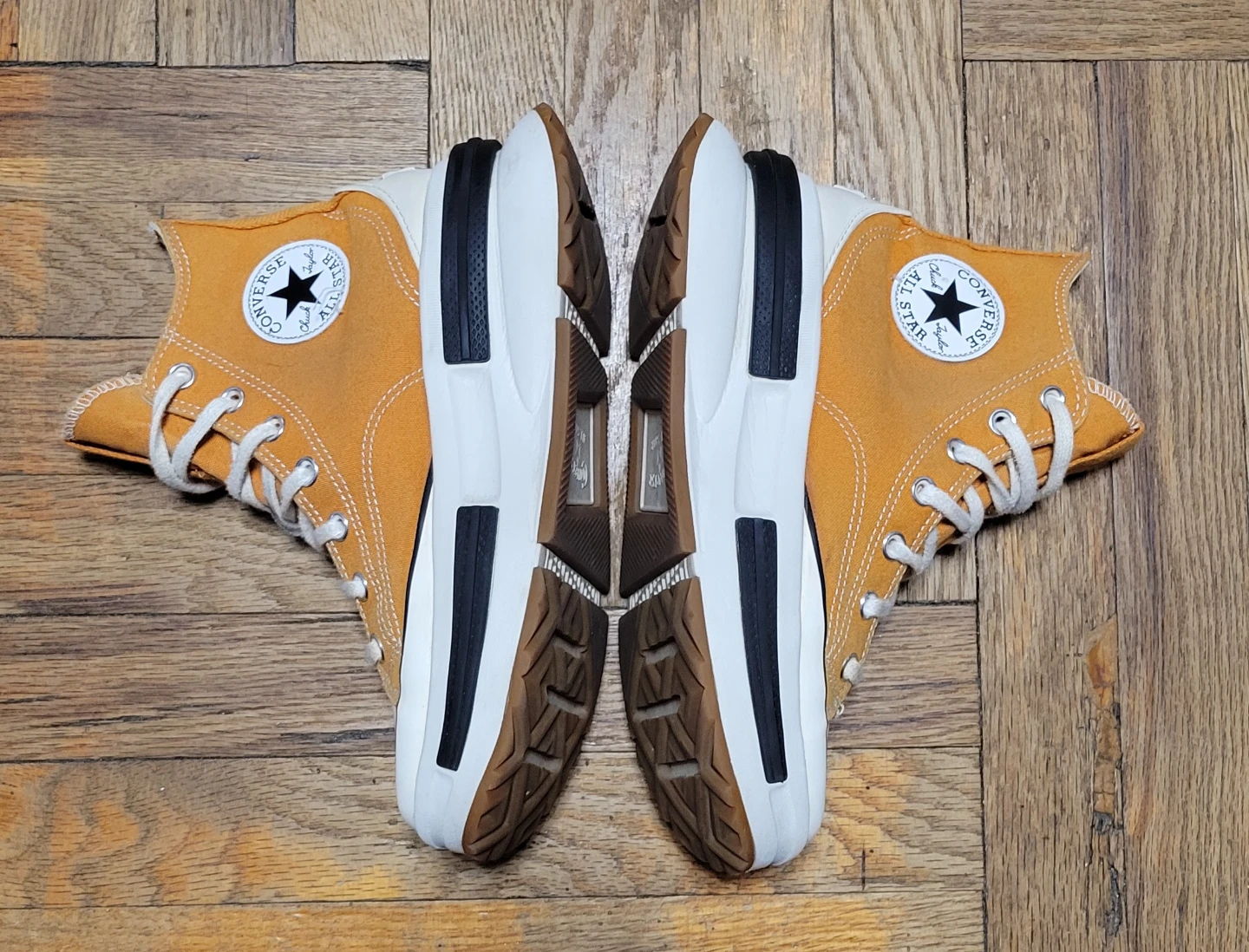 Selling a pair of Converse Run Star Hike high-top sneakers! They're in great condition and feature a unique platform sole. The color is a stylish mustard yellow. Perfect for adding a bit of edge to any outfit!