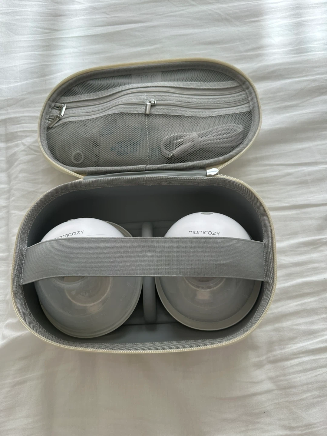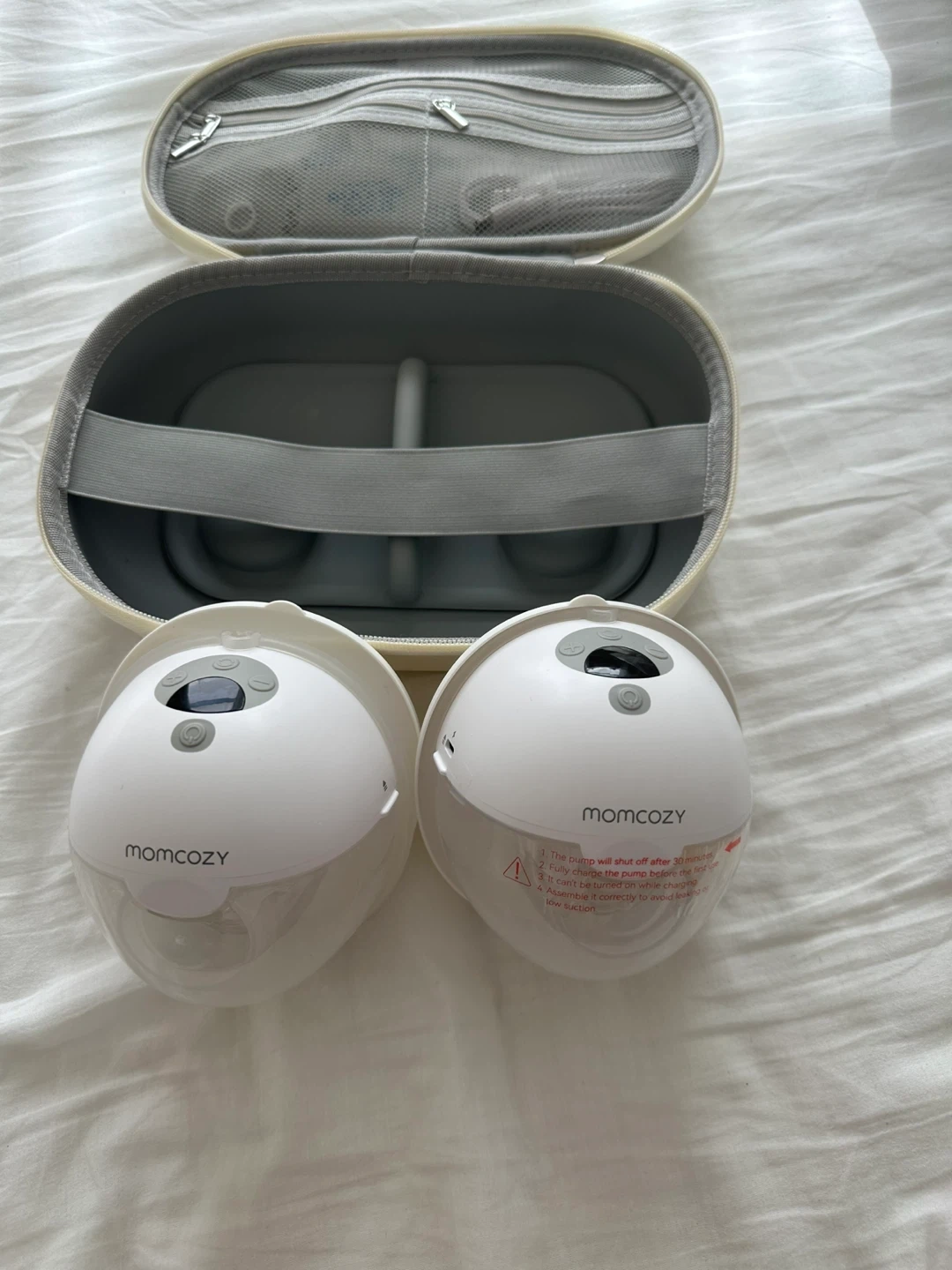 Selling a Momcozy wearable breast pump, complete with its carrying case! It's in great condition and ready for a new mom. The pump is designed for convenience and portability, making pumping on the go a breeze. It comes with all original components and is super easy to clean and assemble