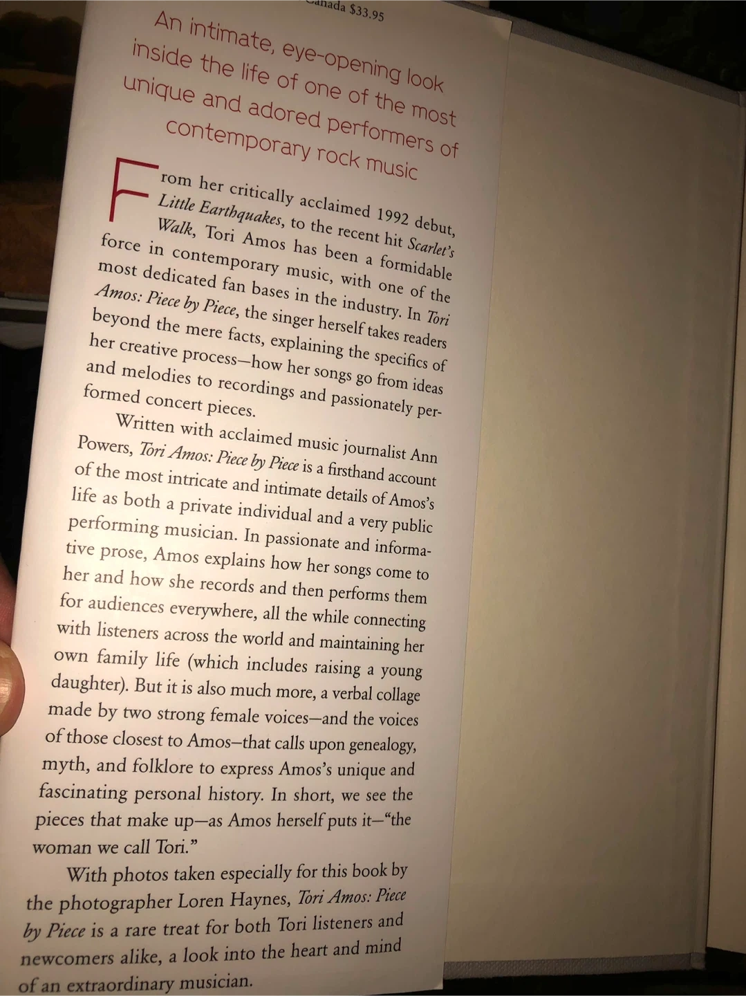 - "Tori Amos: Piece by Piece" by Tori Amos and Ann Powers. An intimate look inside the life of the artist