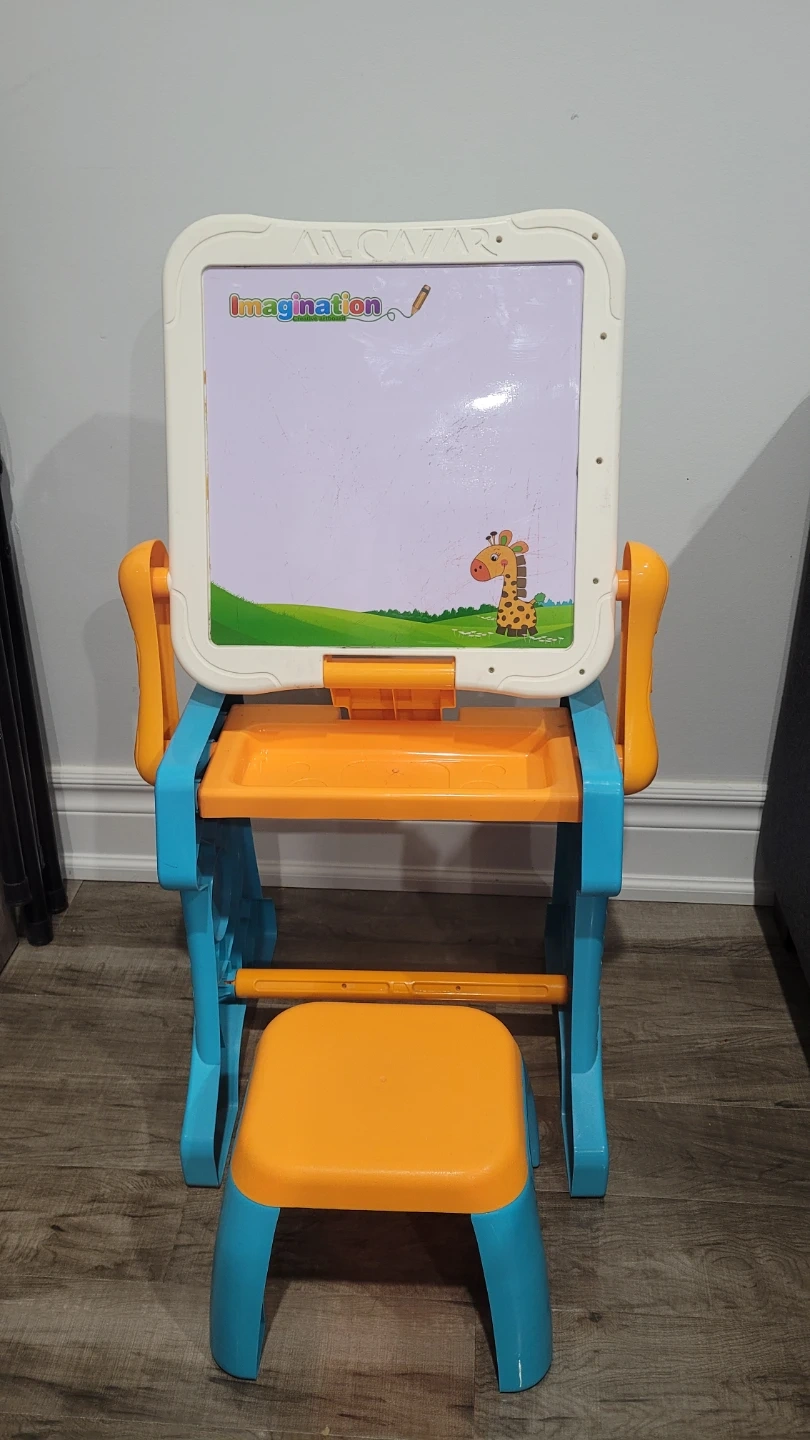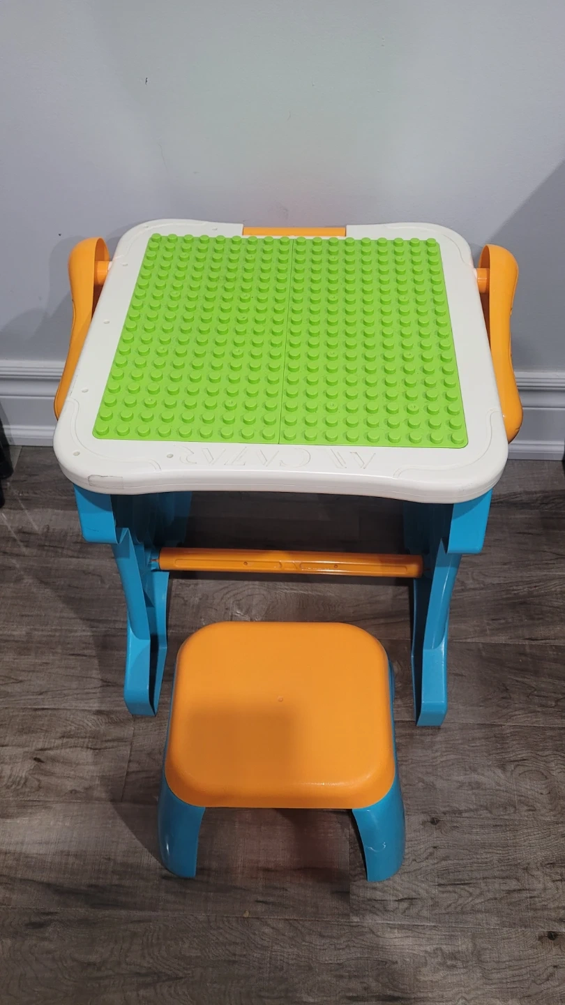 One side works as a LEGO & building block surface, the other side is a magnetic whiteboard that also works as an easel (clip paper on top).