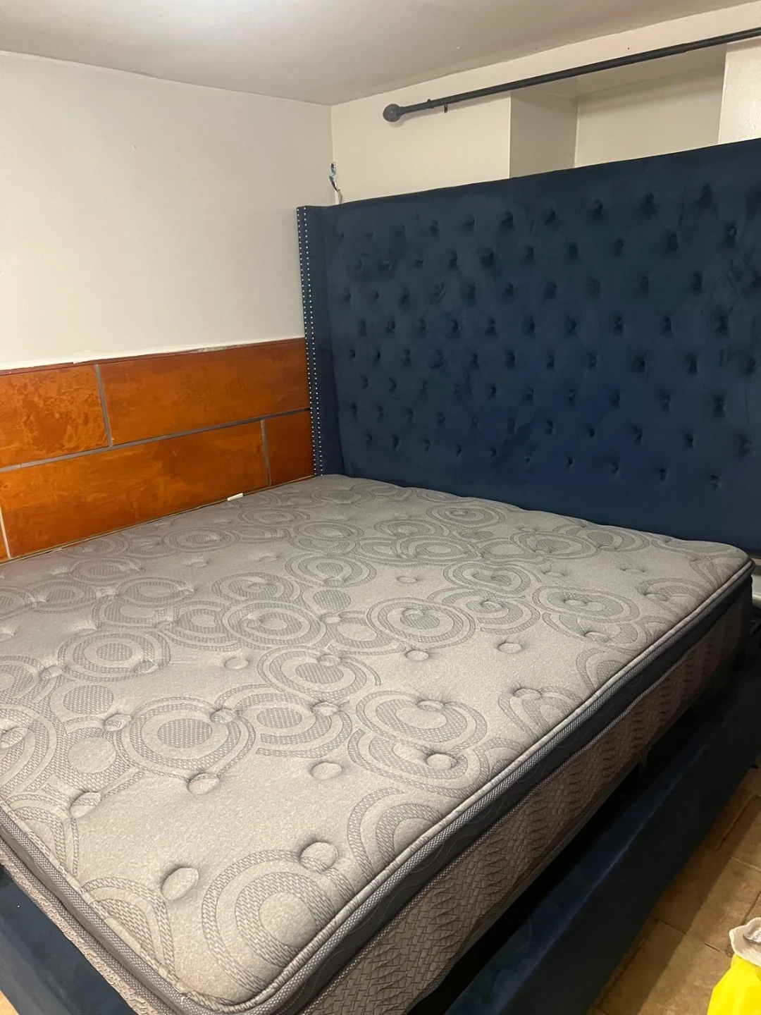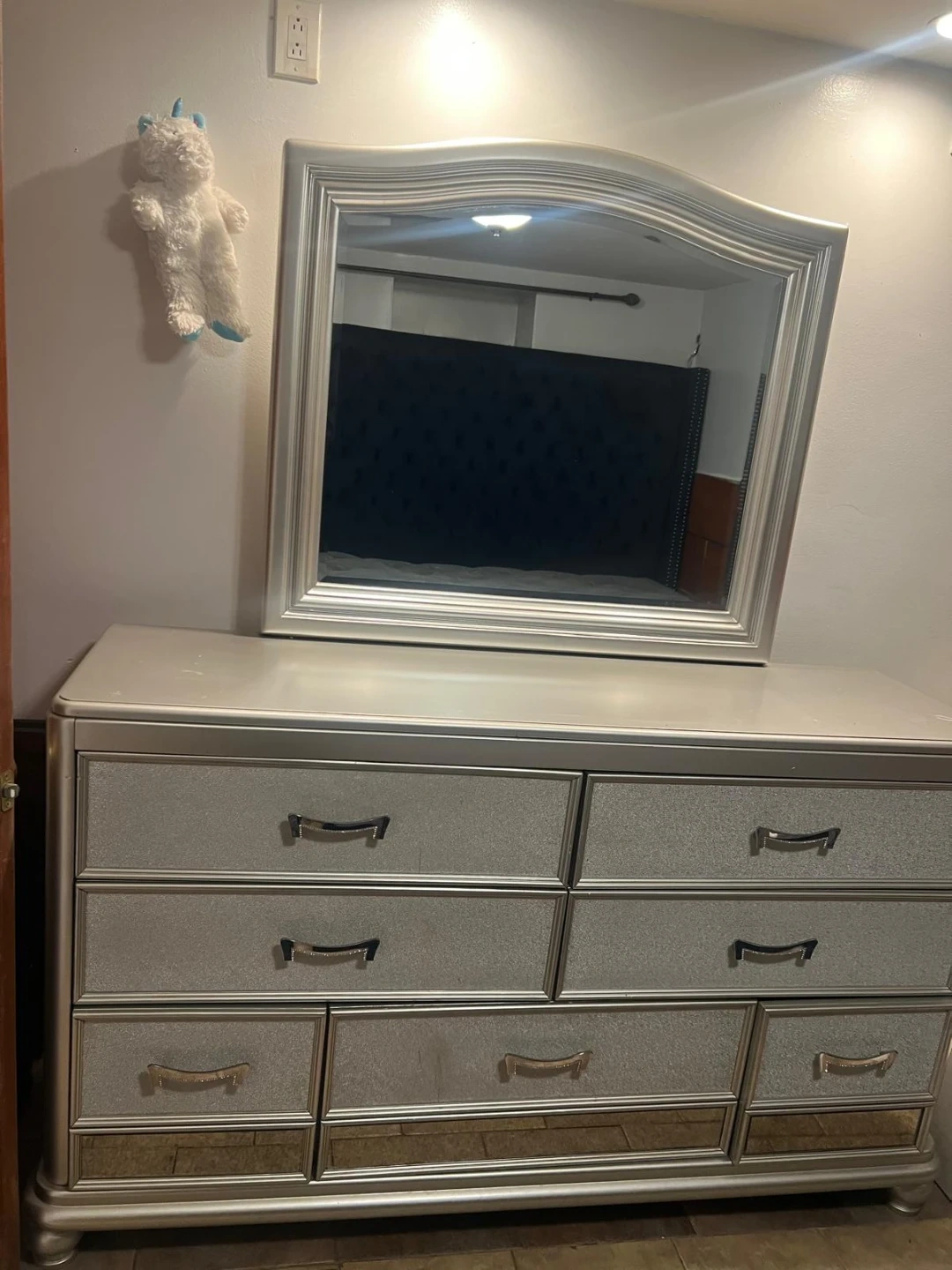 Selling a bedroom set that includes a dresser, mirror, bed, and nightstand. The set features a silver/gray color scheme with a tufted headboard on the bed. It's a stylish addition to any bedroom!