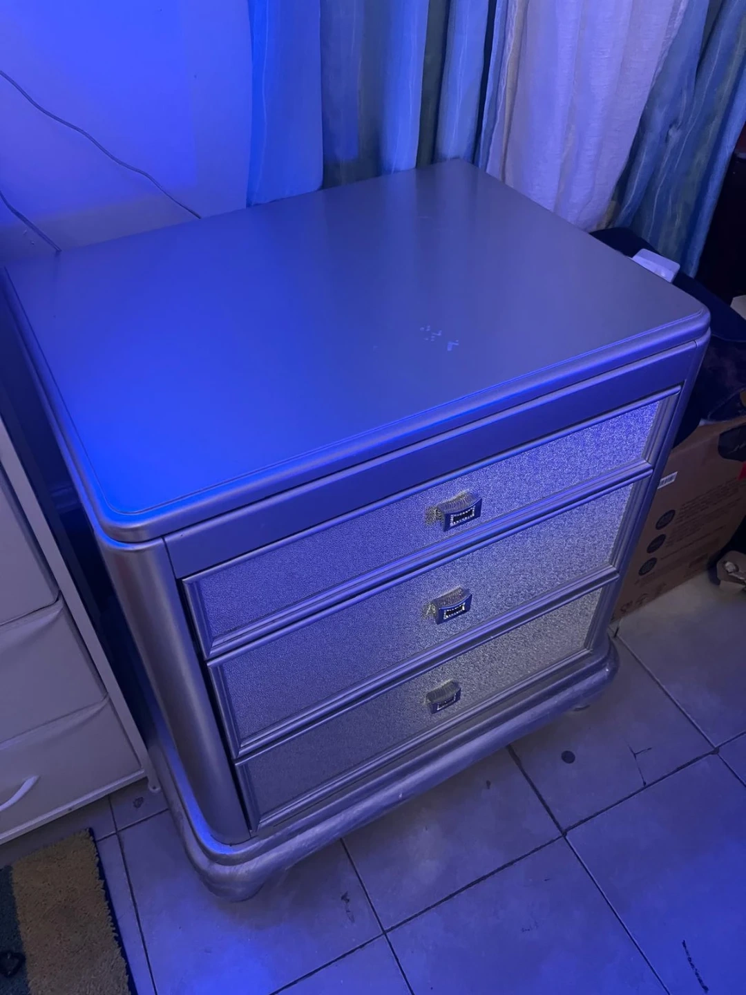 Vender un juego de dormitorio que incluya una cómoda, un espejo, una cama y una mesita de noche. El conjunto presenta un esquema de color plateado/gris con una cabecera con mechón en la cama. ¡Es una adición elegante a cualquier habitación!
