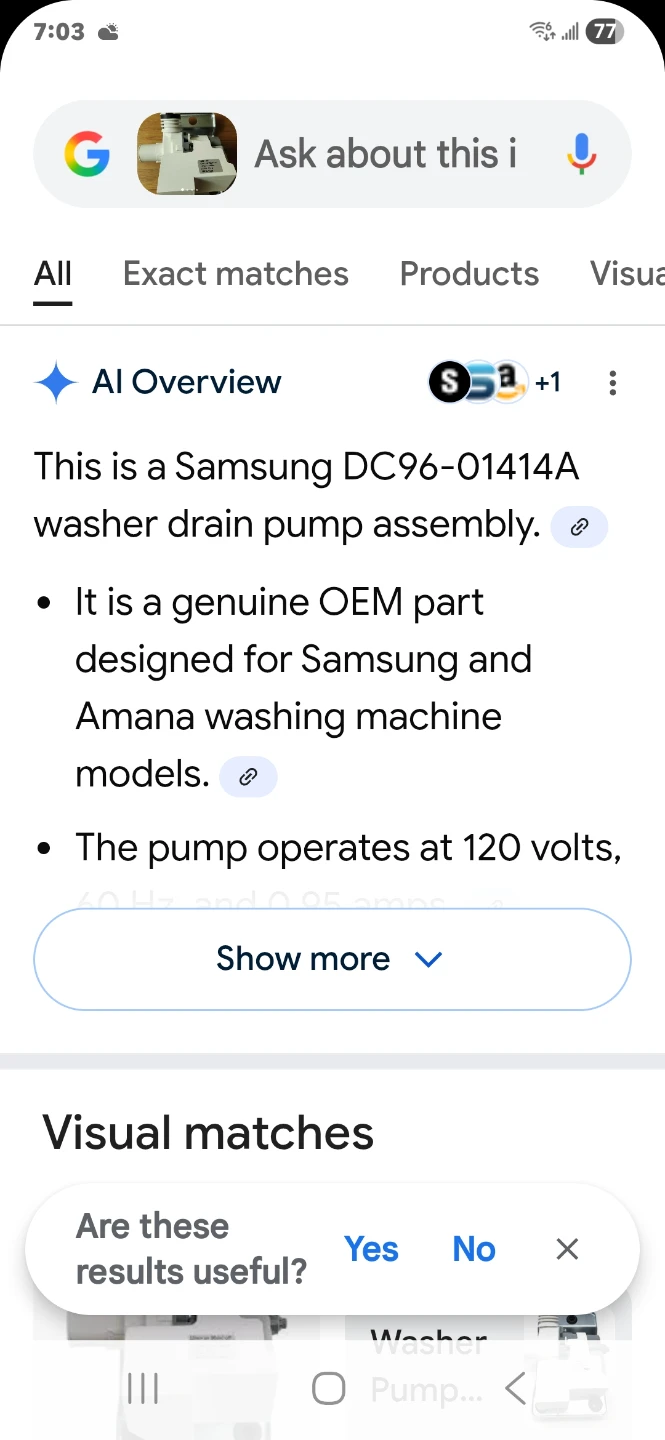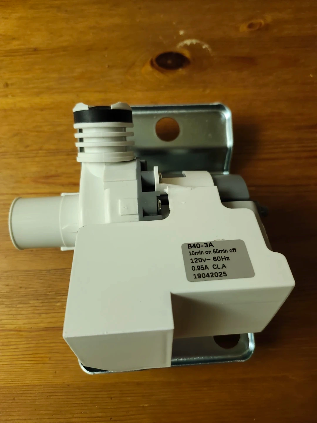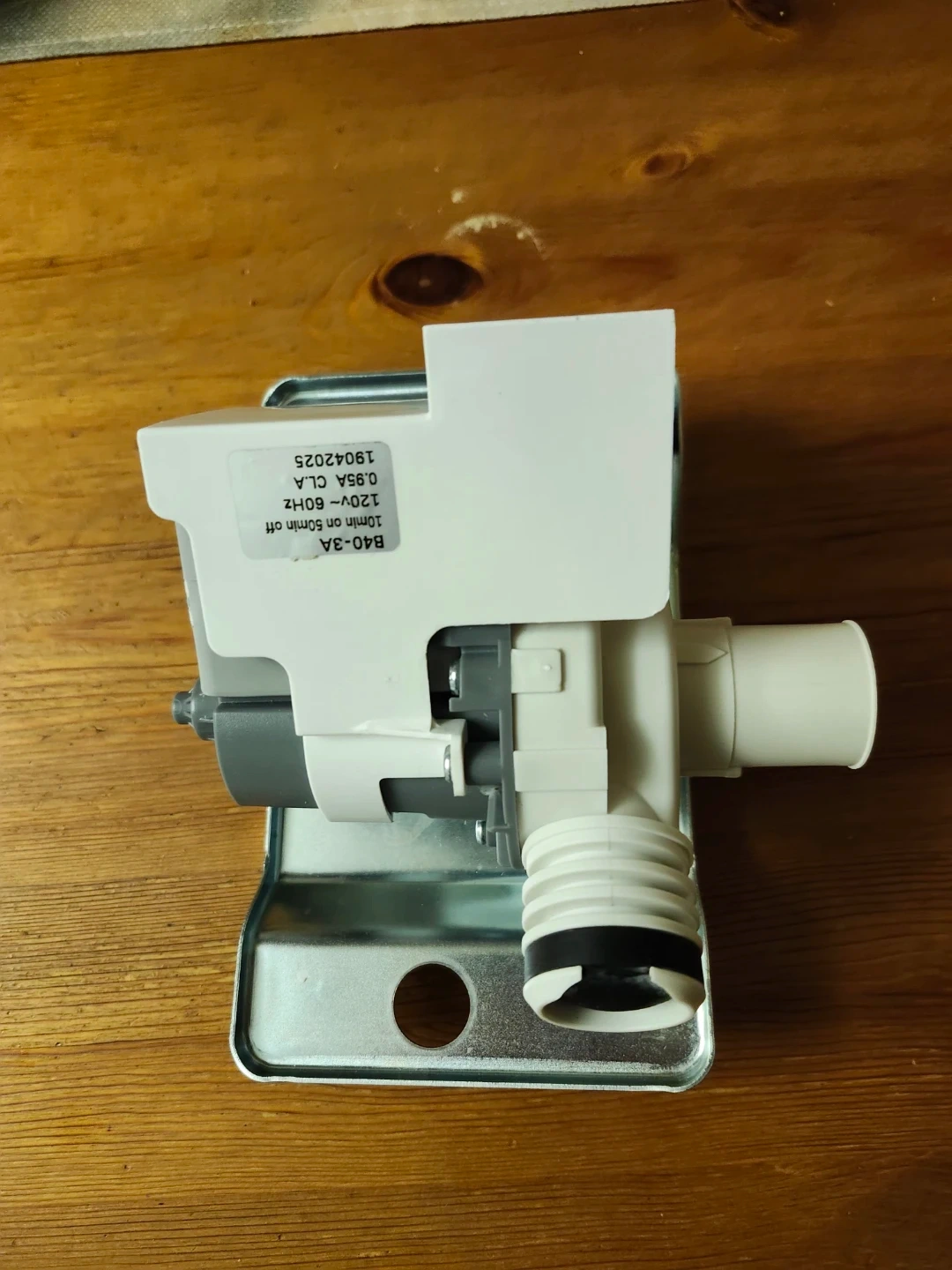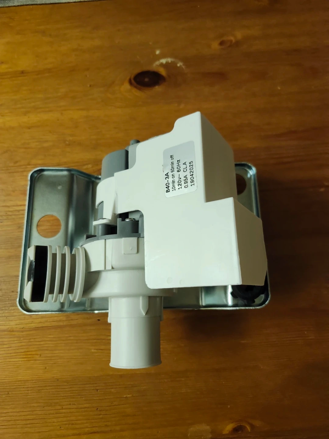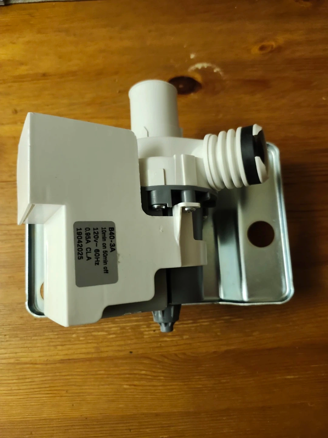 Selling a new washing machine water pump. The model number is B40-3A. It operates at 120V~60Hz and 0.95A CLA. It runs for 10 minutes on and 50 minutes off, according to the label. Fits Samsung, Amana.