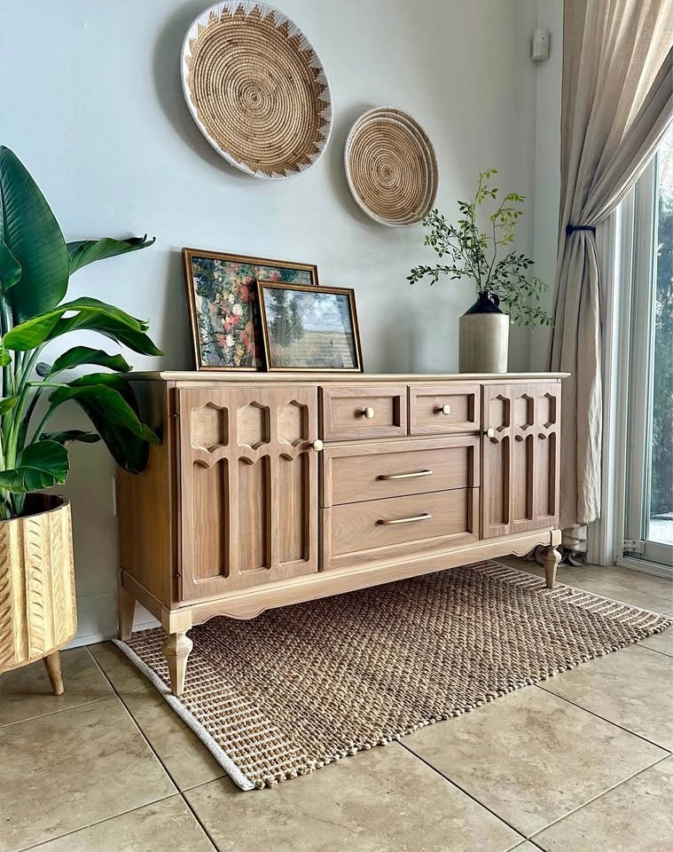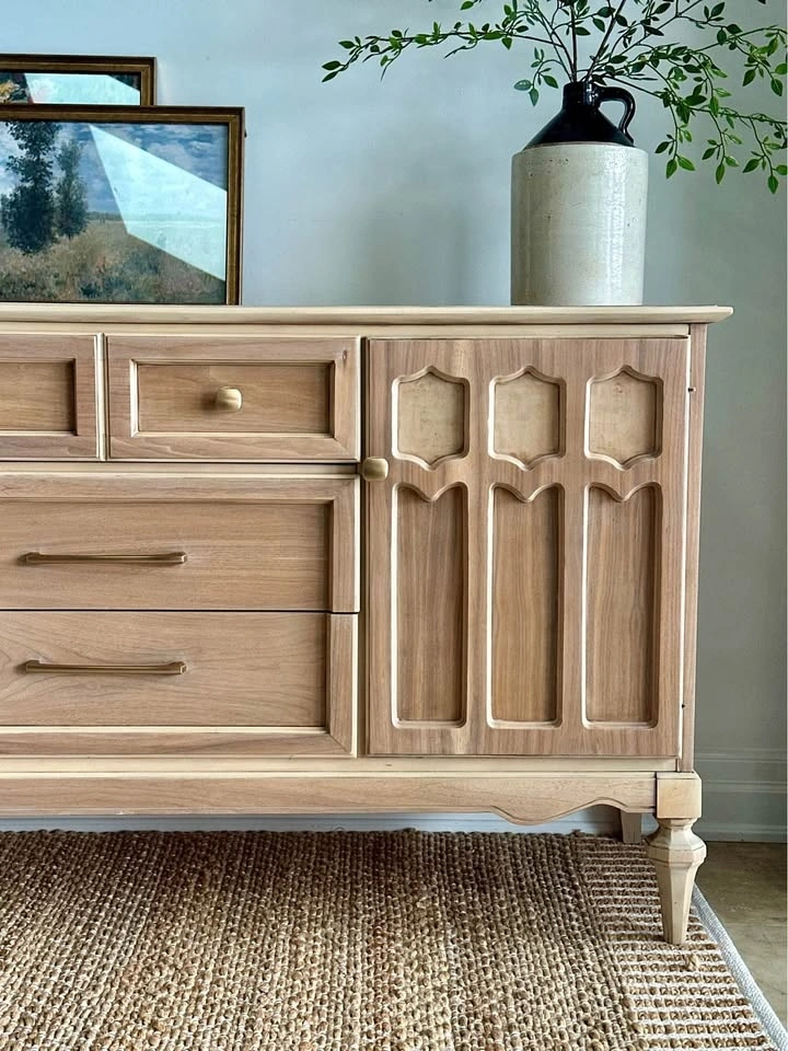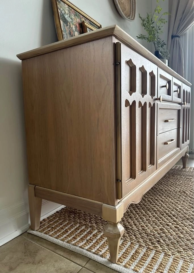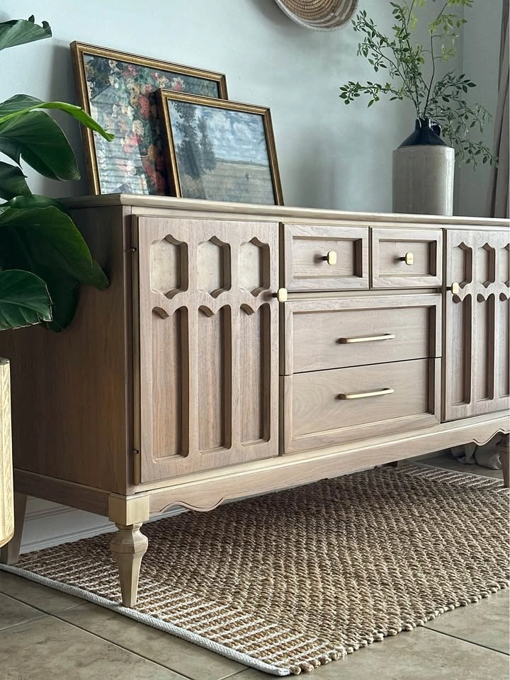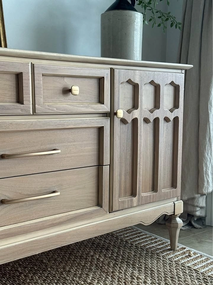 I’m obsessed with the details on this piece — from the stunning mix of wood grain and architectural paneling to those elegant tapered, turned legs. The finish gives it a warm, organic feel, while the new champagne bronze hardware adds just the right touch of polish without stealing the spotlight.