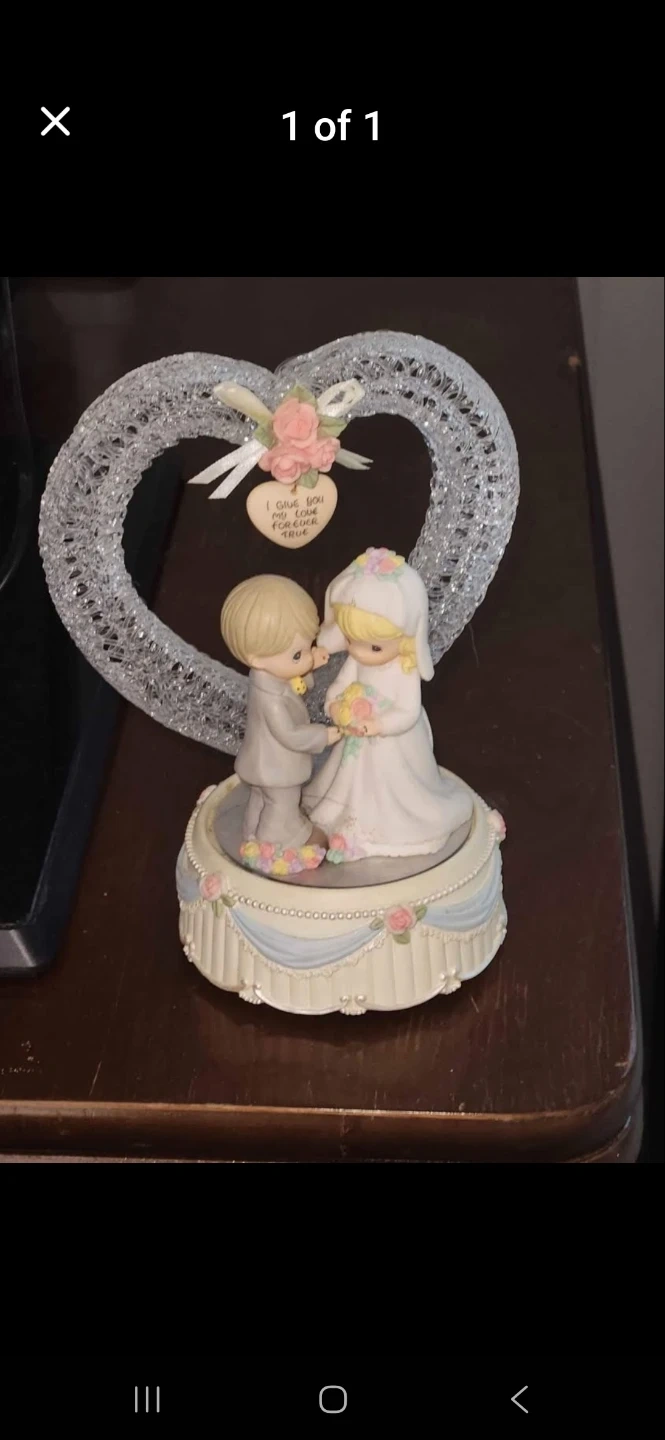 This is a Precious Moments figurine of a bride and groom in front of a heart. The heart has a tag that says "I give you my love forever true". It would be great for a wedding gift or decoration
