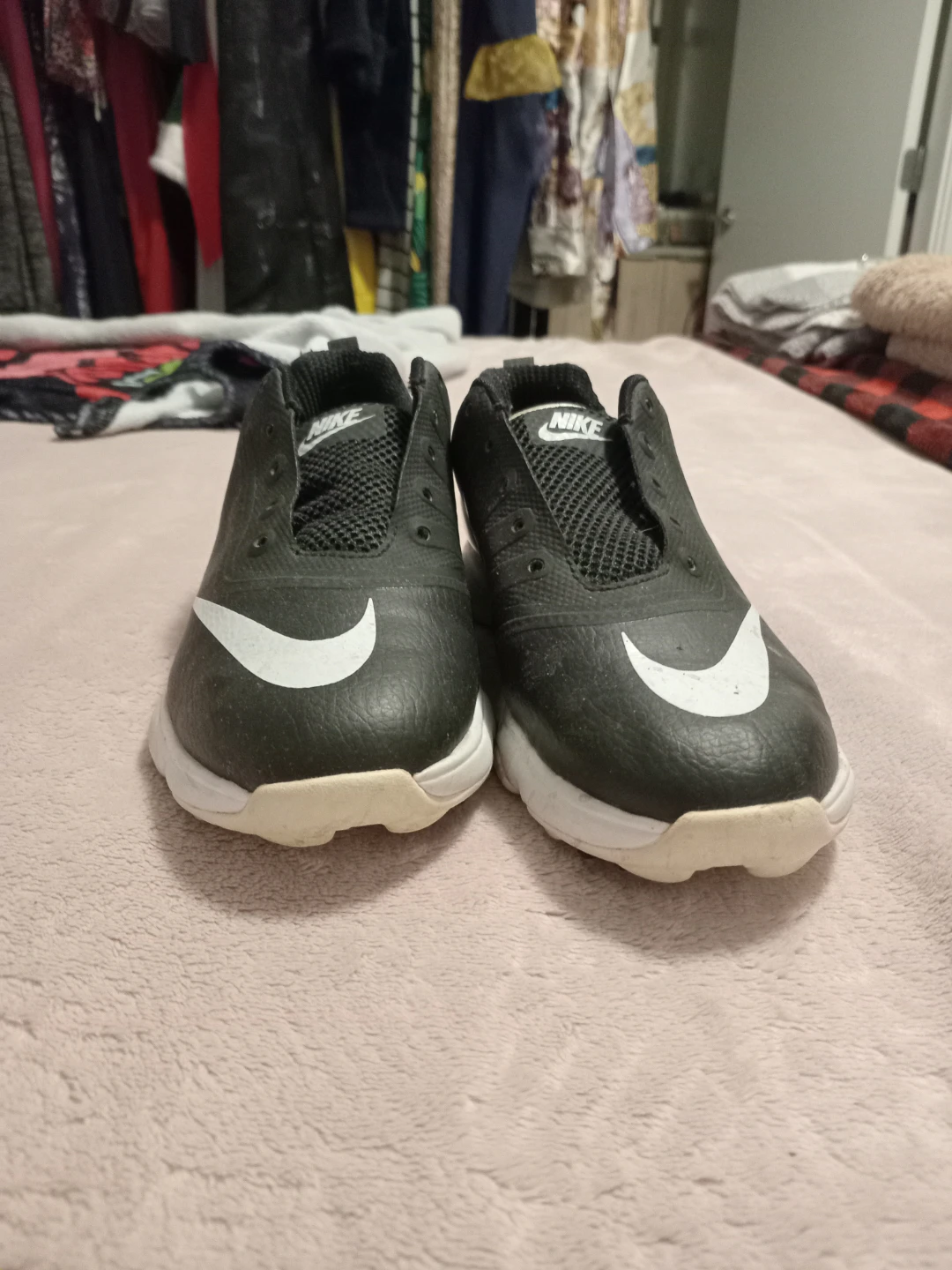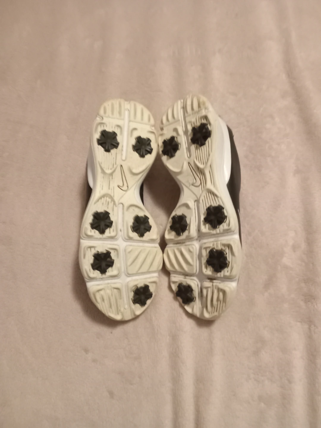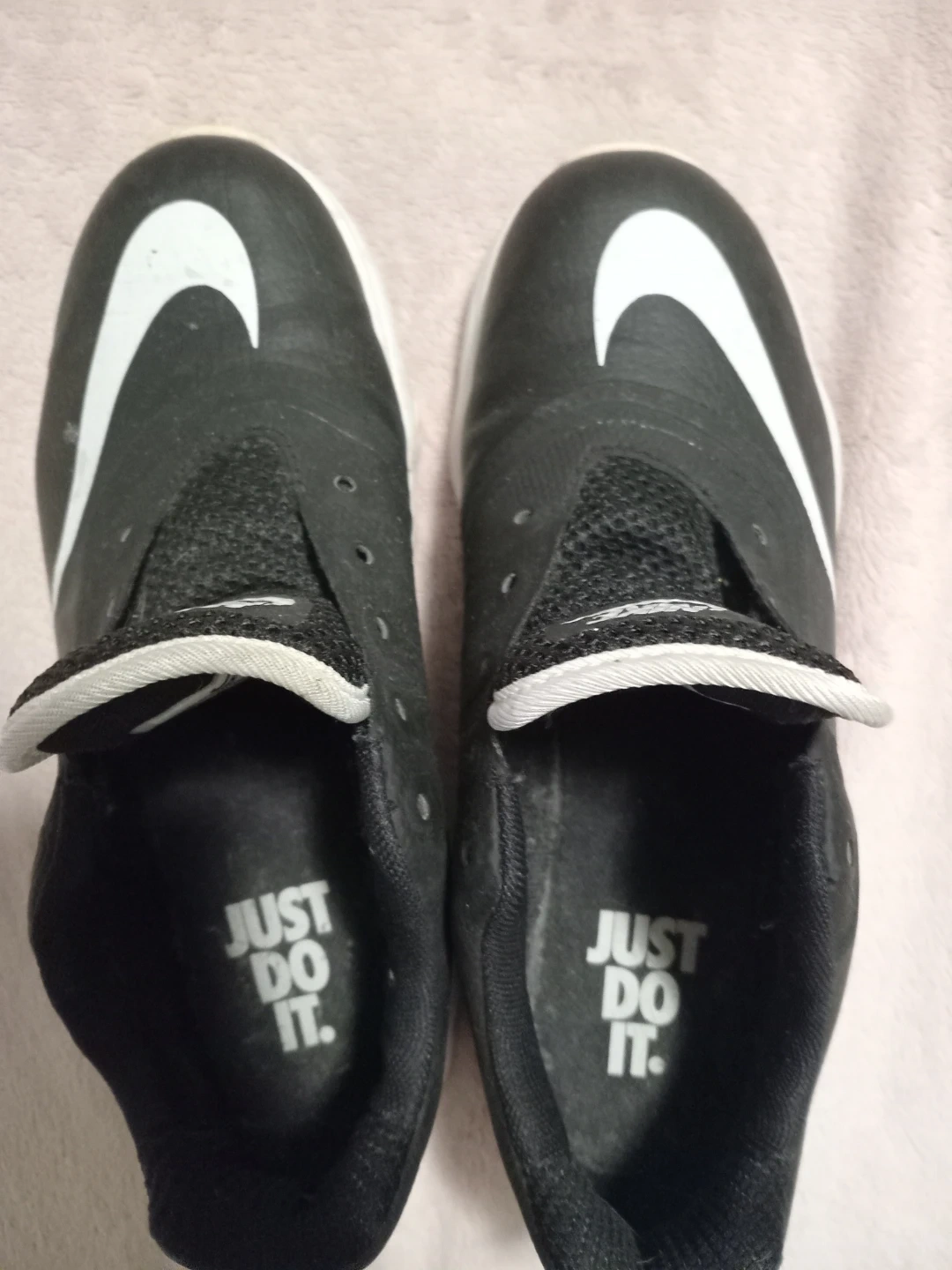 Selling a pair of Nike sneakers in black and white. They have the 'JUST DO IT' logo inside. They show some signs of wear but still have lots of life left, they are golf shoes. Just needs laces. - CASH ONLY