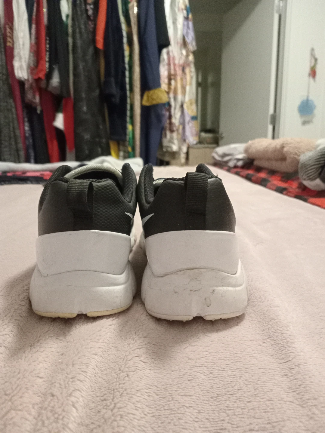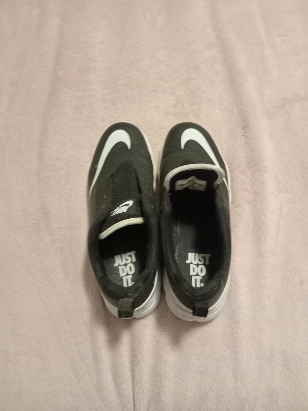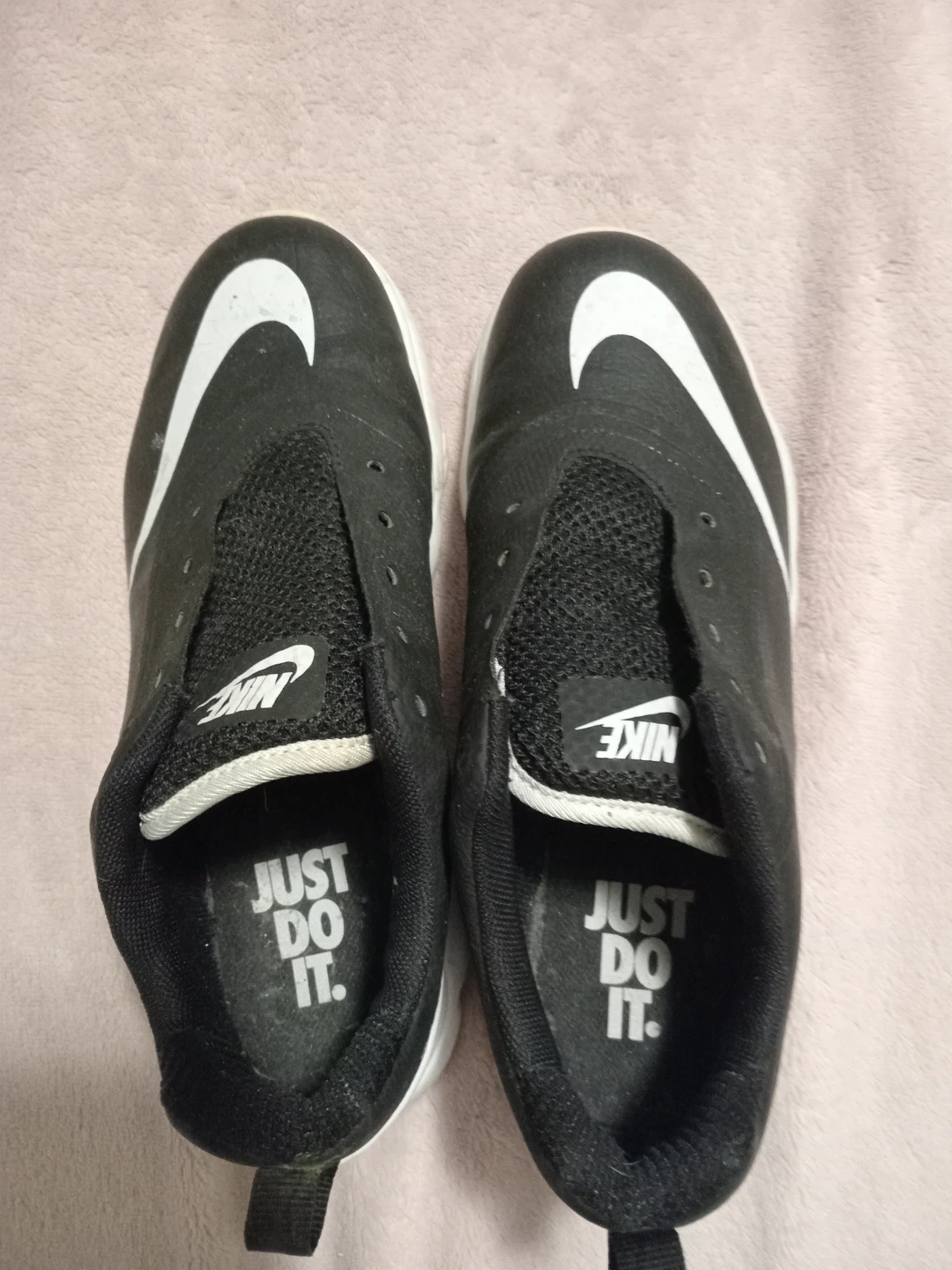 Selling a pair of Nike sneakers in black and white. They have the 'JUST DO IT' logo inside. They show some signs of wear but still have lots of life left, they are golf shoes. Just needs laces. - CASH ONLY