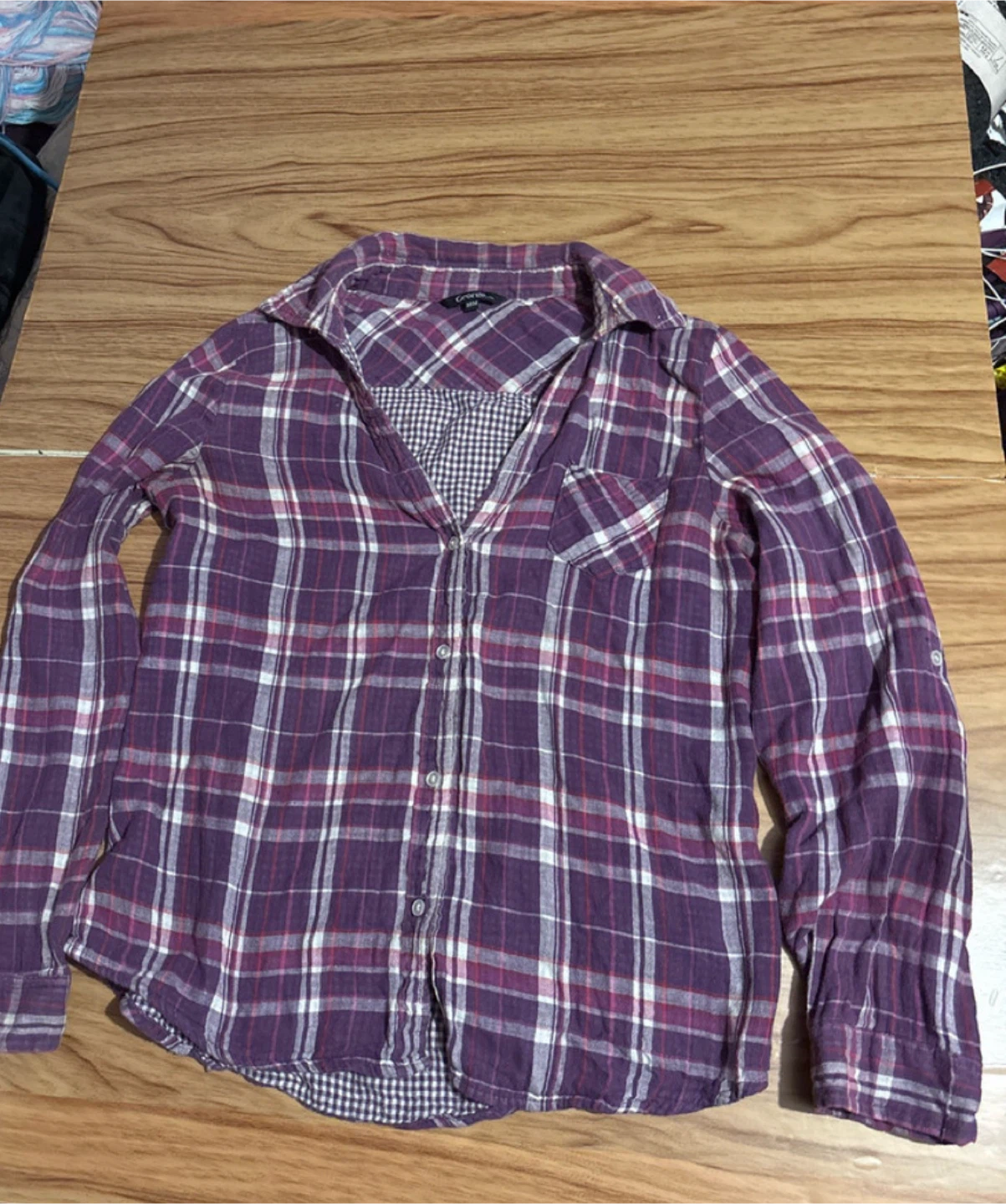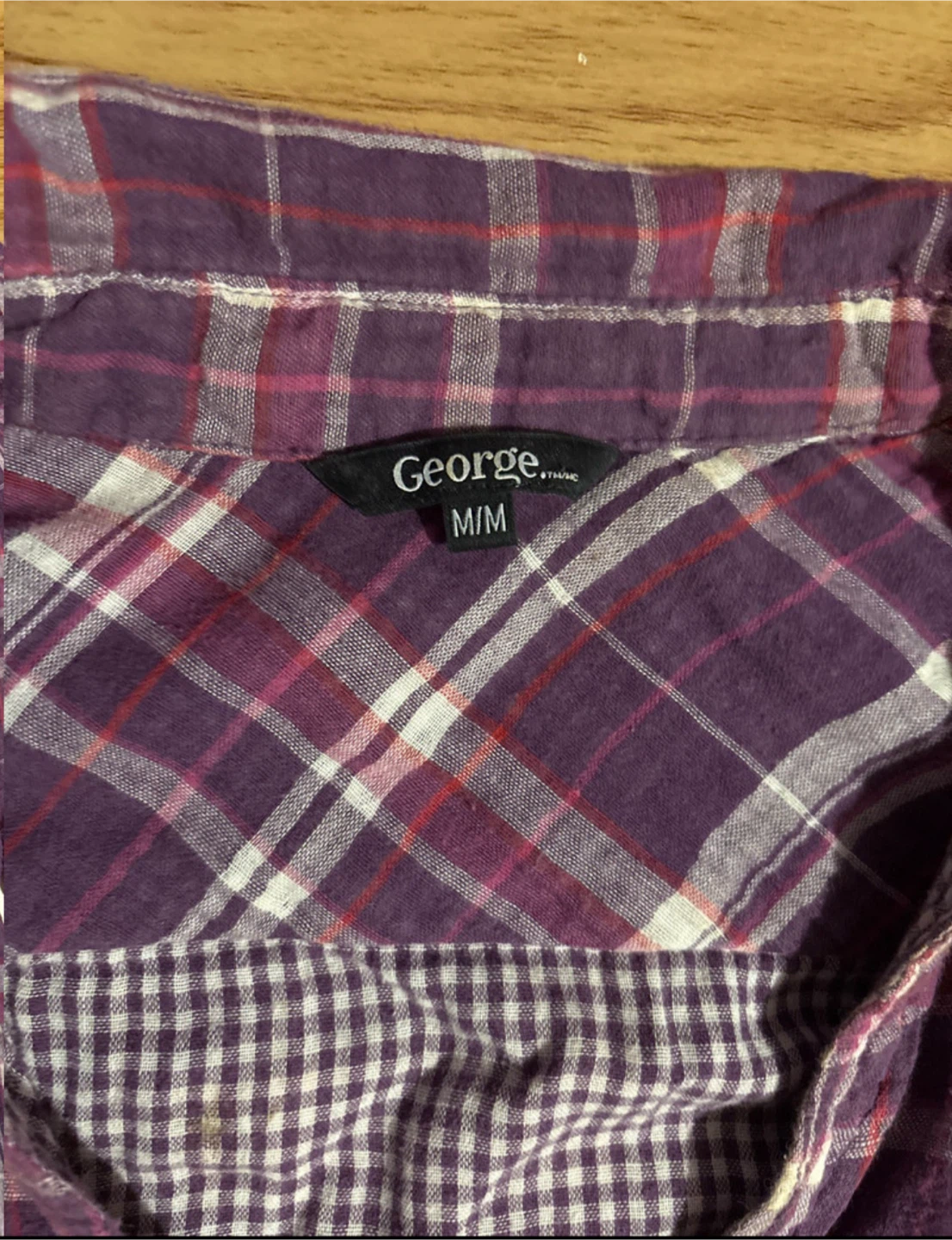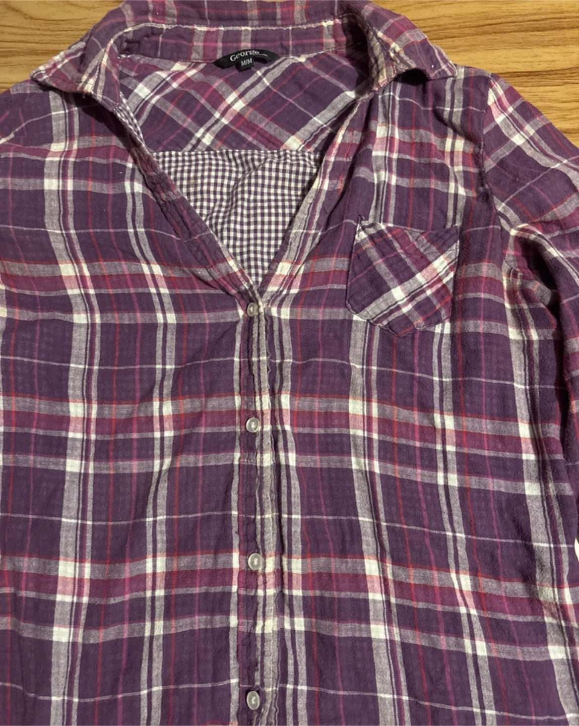 This George flannel shirt is a stylish and comfortable addition to any wardrobe. In good, used condition, it features a purple and white plaid pattern, long sleeves that can be rolled up, and a button-down front. Perfect for layering or wearing on its own!