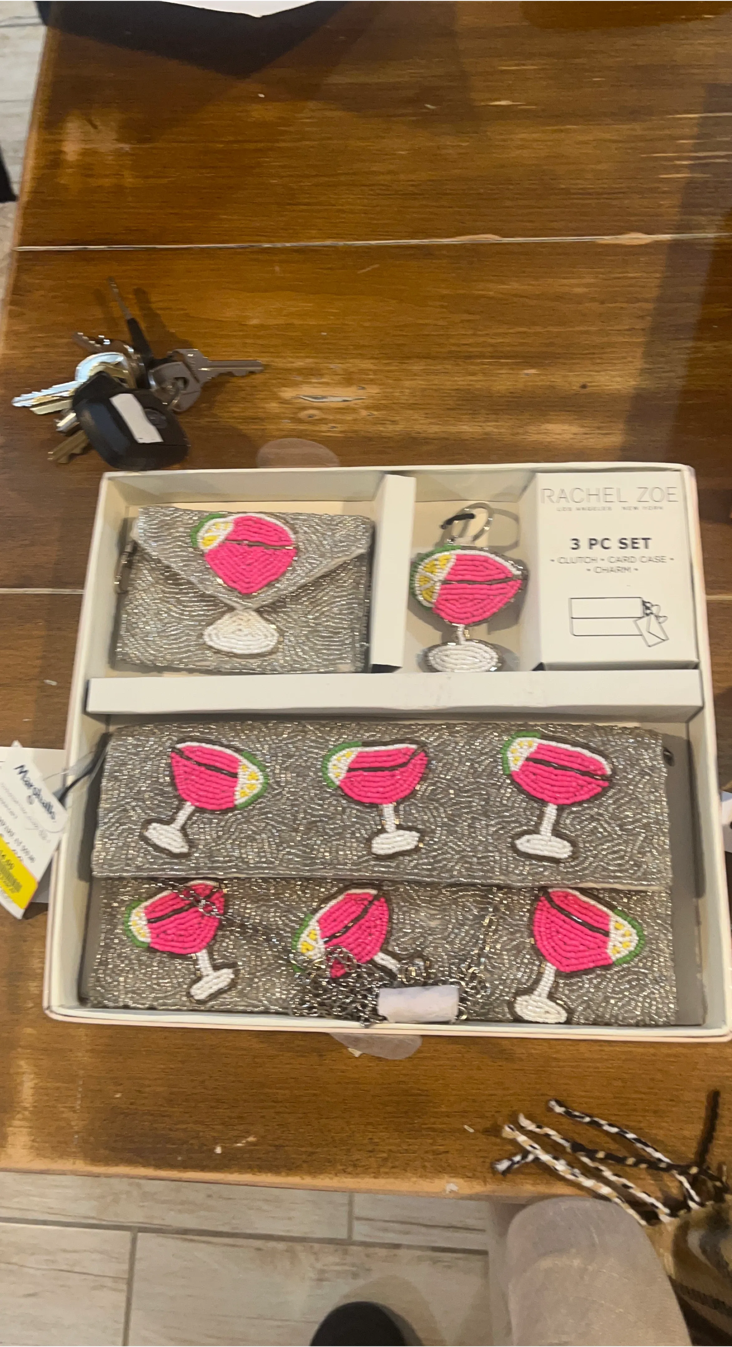 Rachel Zoe 3 piece set including a clutch, card case, and charm. This set is new and comes in the original box