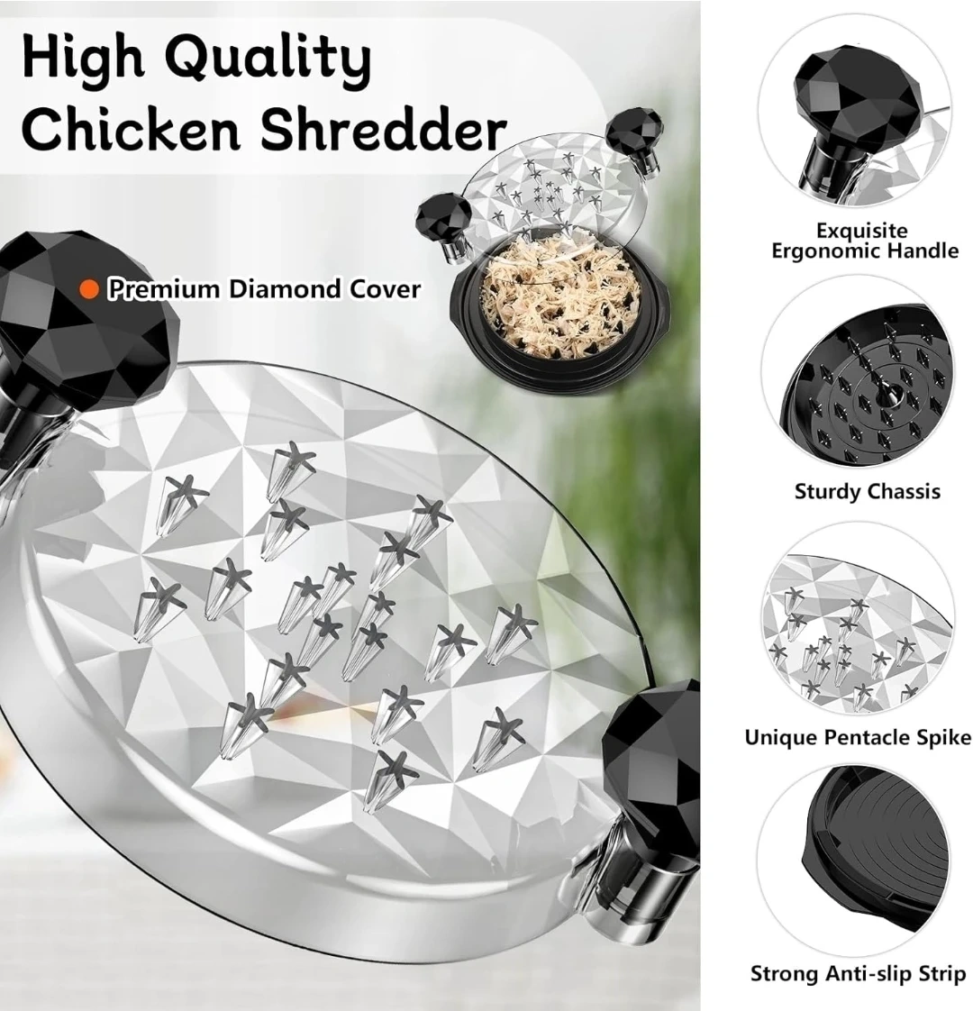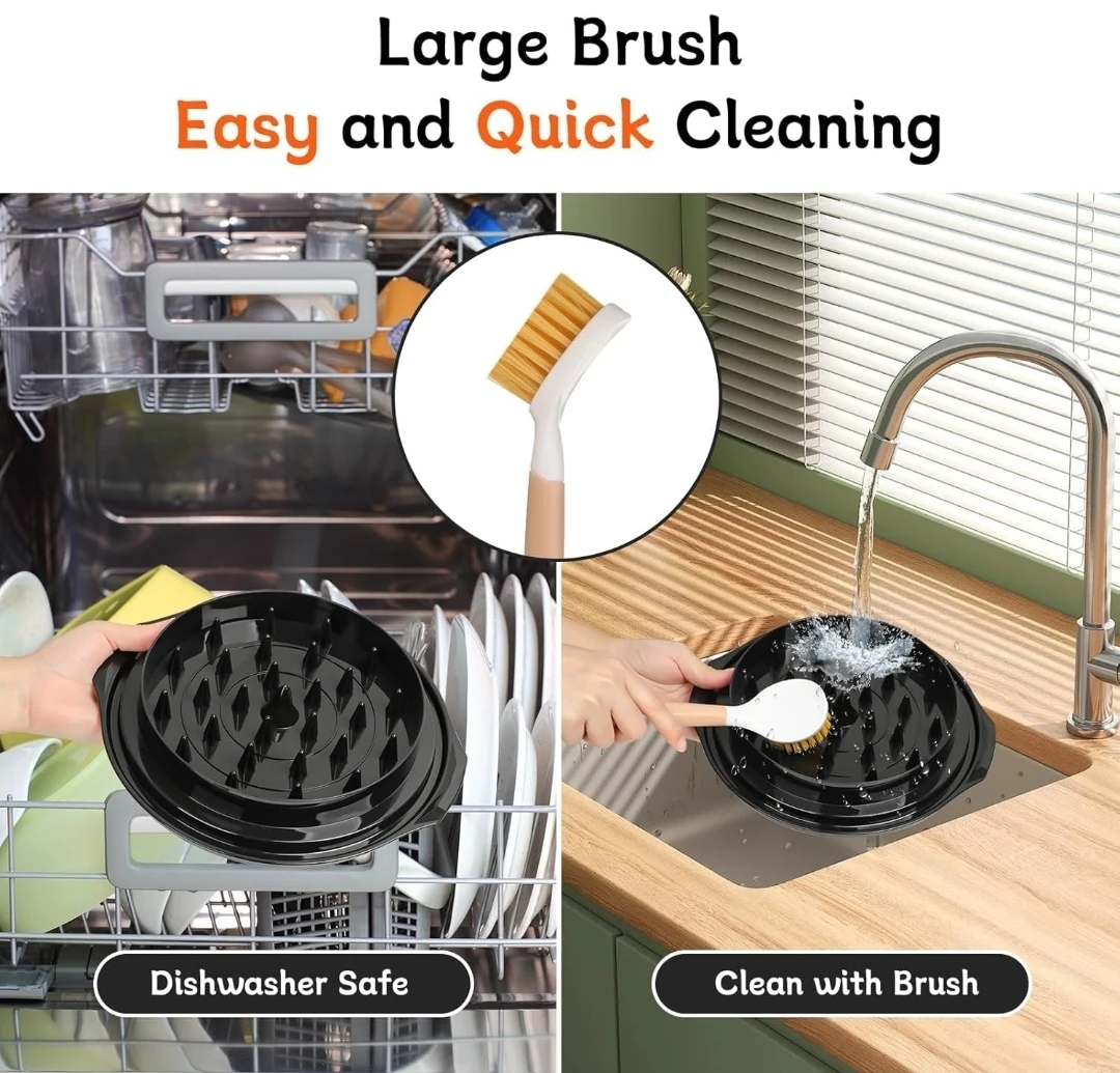 This chicken shredder comes with a brush for easy cleaning! It features a strong anti-slip strip and a sturdy chassis. The ergonomic handle and unique pentacle spikes make shredding chicken a breeze. It's also dishwasher safe for added convenience