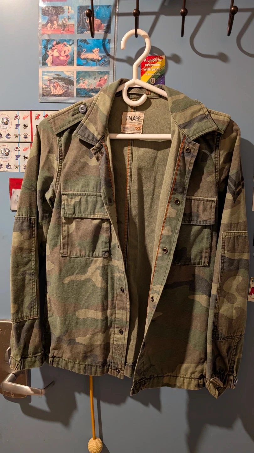 Selling a TNA camo jacket in size XXS. It's in great condition and ready for a new owner! The camo pattern is perfect for adding a bit of edge to your wardrobe.