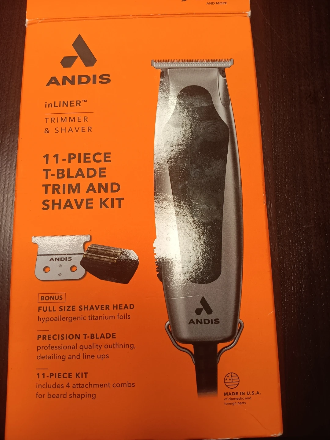 Selling an Andis inLiner Trimmer & Shaver 11-Piece T-Blade Trim and Shave Kit. It includes a full-size shaver head with hypoallergenic titanium foils for precision detailing and line ups. The kit comes with 4 attachment combs for beard shaping. Also included is a brush, lubricating oil, and a comb