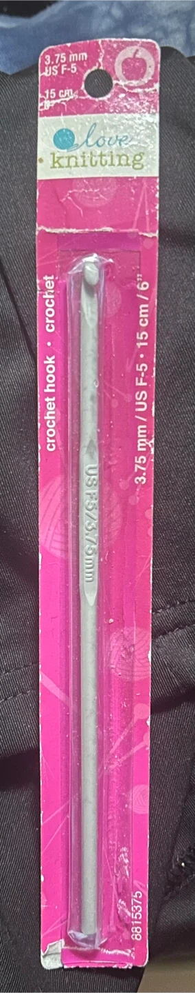 Here's a Love Knitting crochet hook, size 3.75mm (US F-5). It's 15 cm / 6" long. Perfect for your next knitting project!