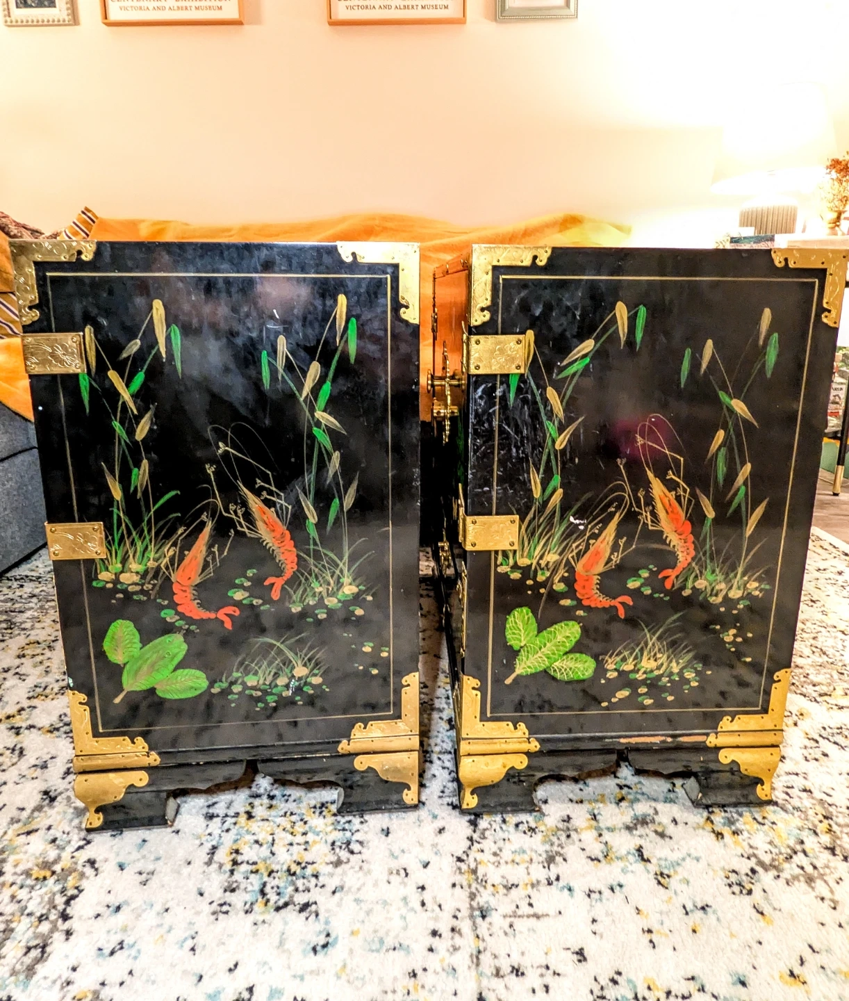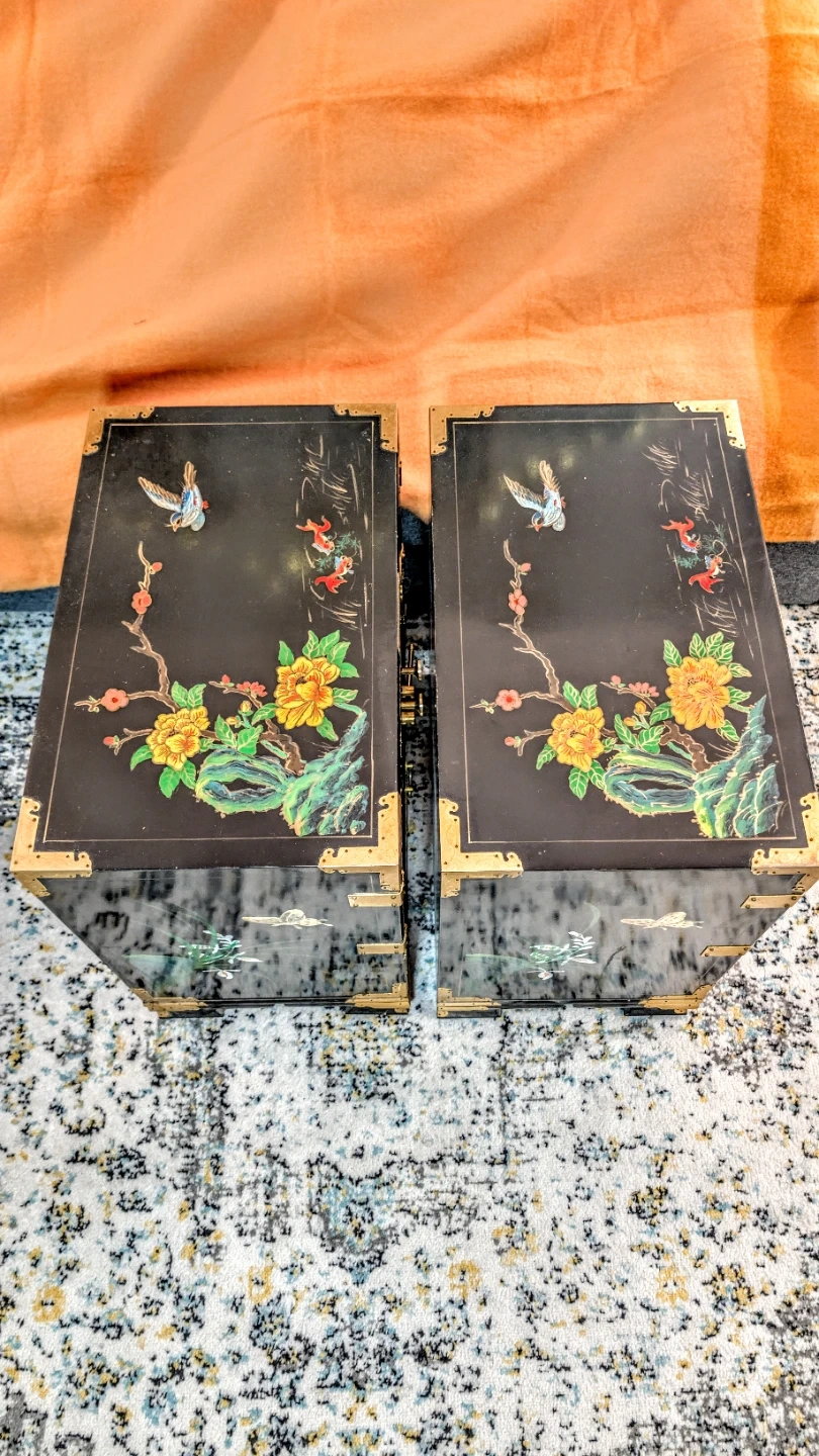 Because these are a matching set, they are ideal for use as statement nightstands, entryway accents, or flanking a fireplace. Their "Chinoiserie" aesthetic fits perfectly into Hollywood Regency, Maximalist, or Modern Eclectic home styles.