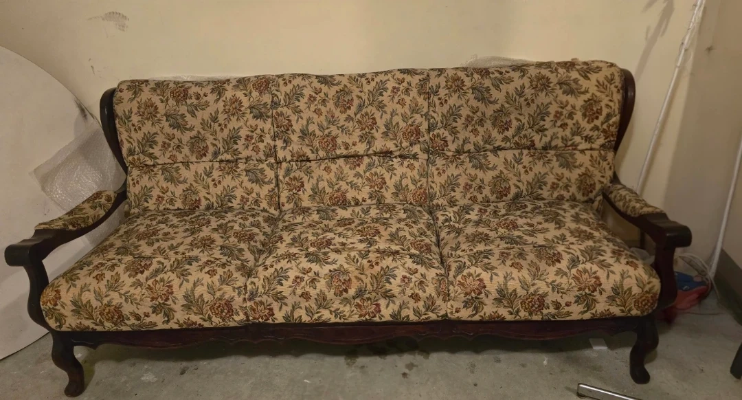 Here's a lovely three-seater sofa with a classic floral pattern. It has a wooden frame( walnut )and curved armrests. Perfect for adding a touch of vintage charm to your living space!