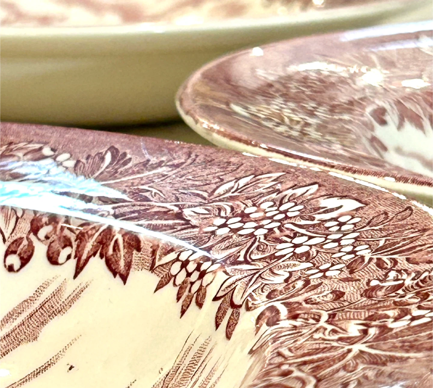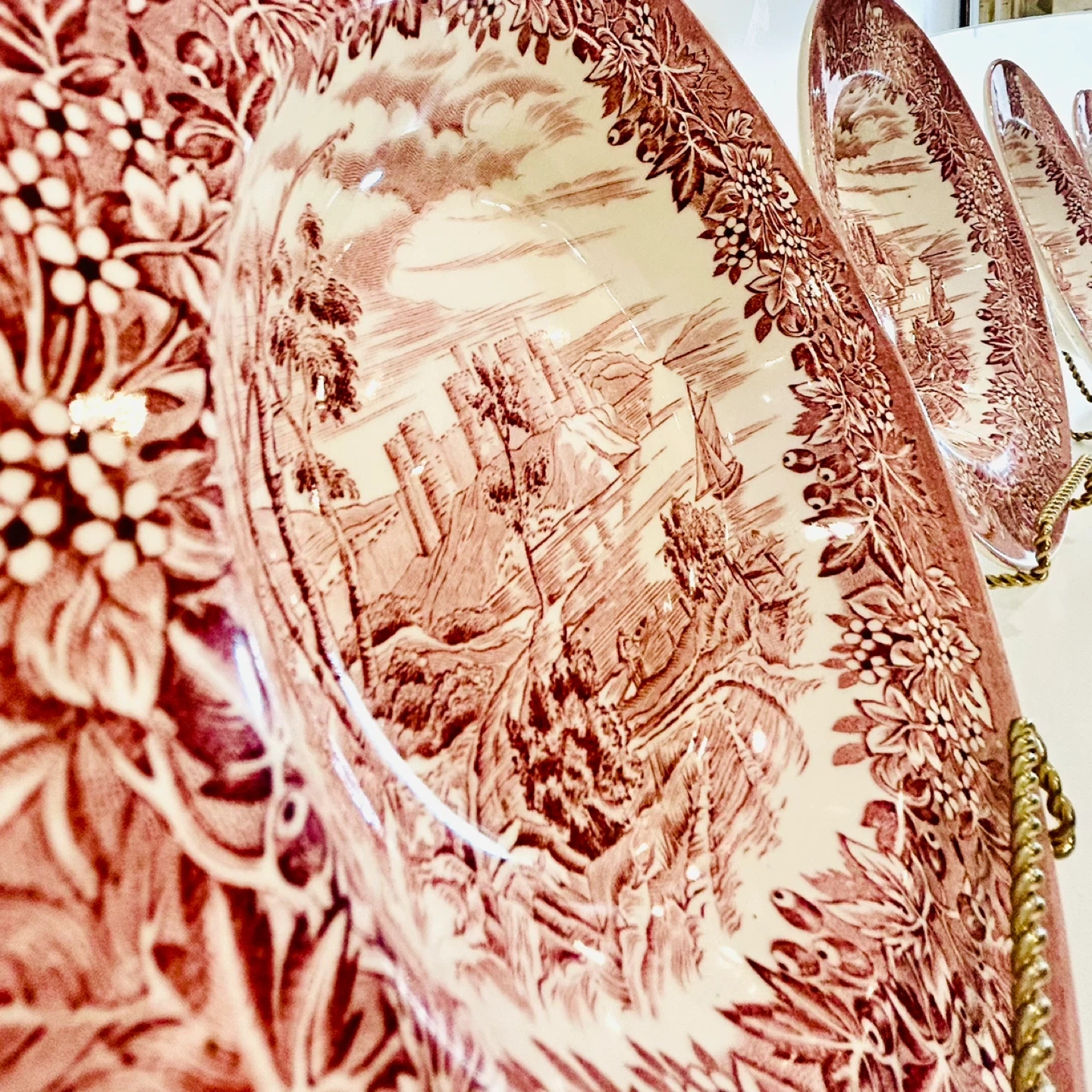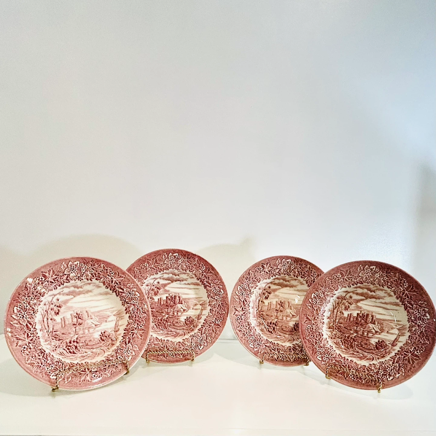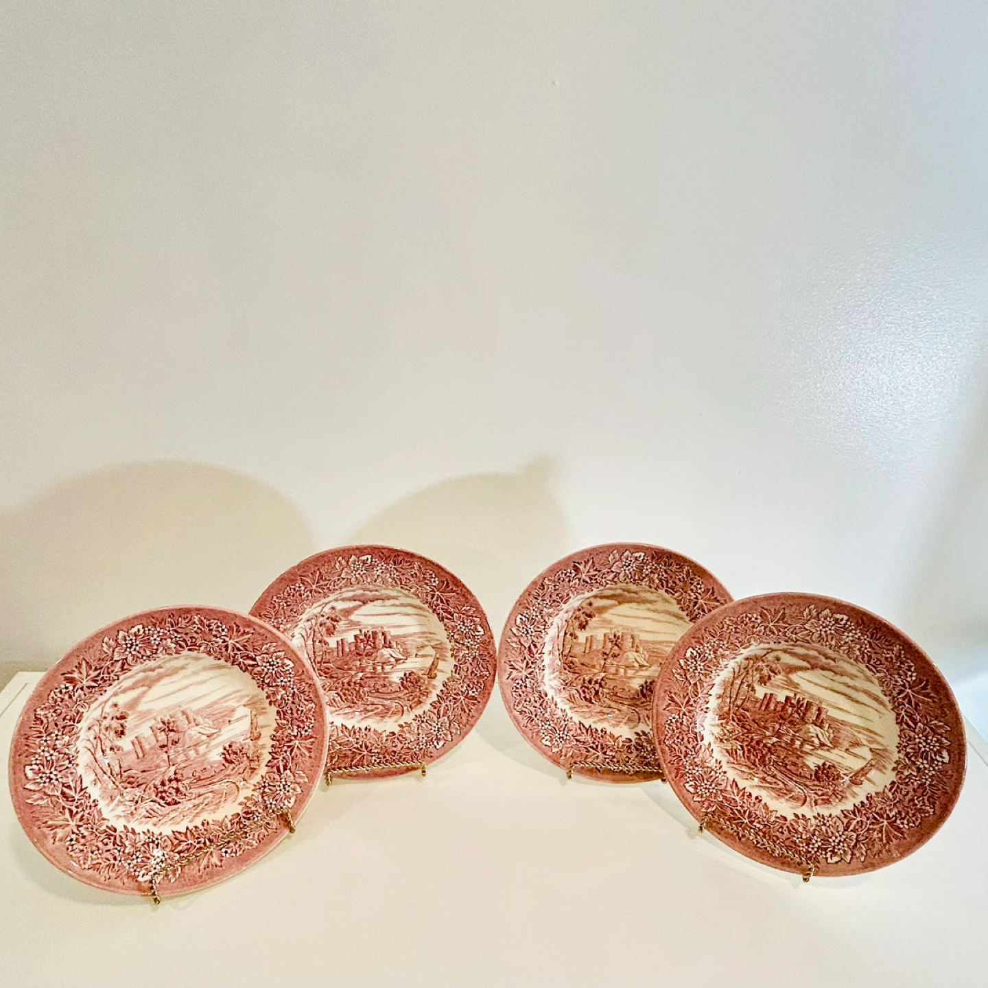 Authentic antique English pink transferware plates, produced by Johnson Brothers Ltd., England, one of the most respected Staffordshire potteries.